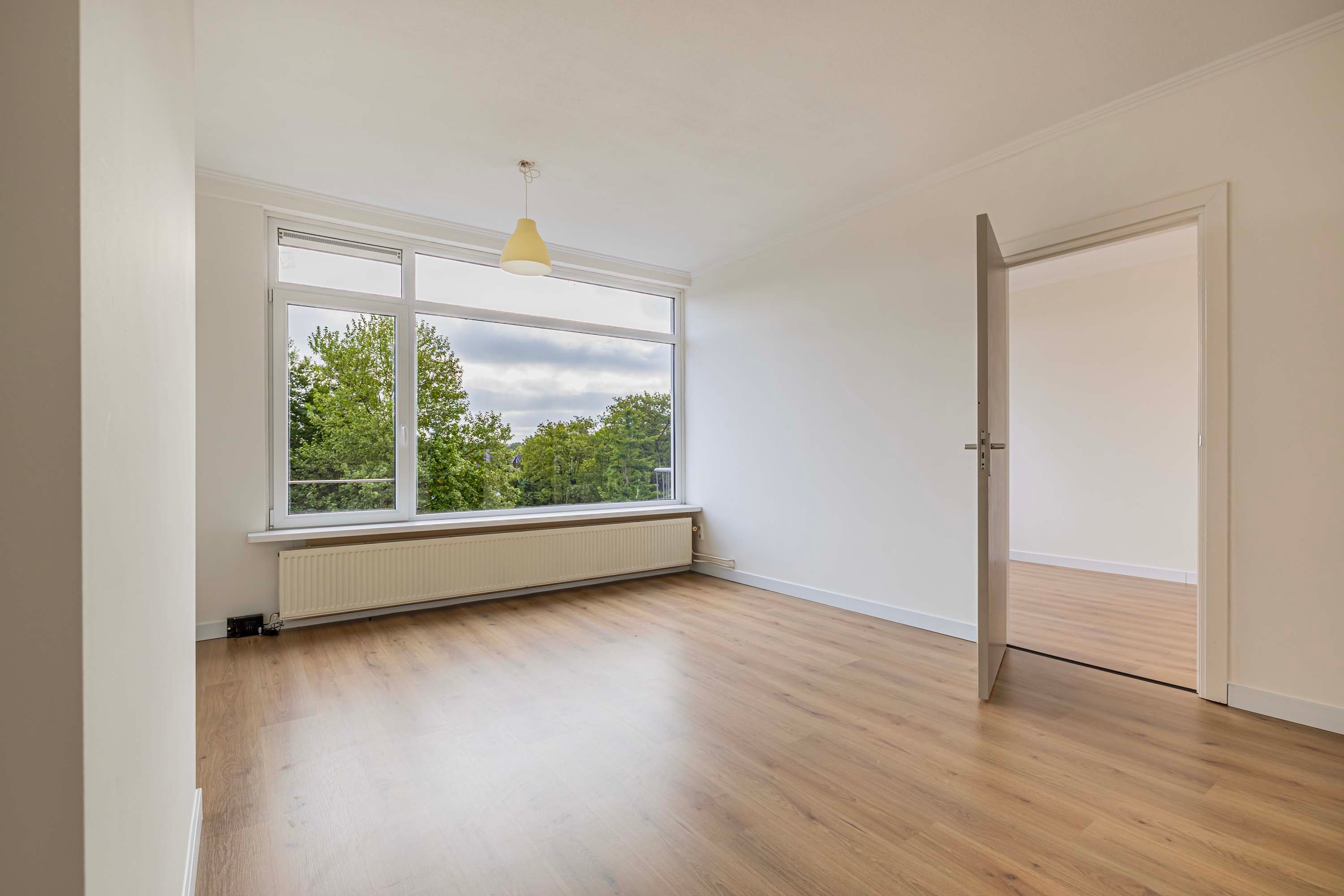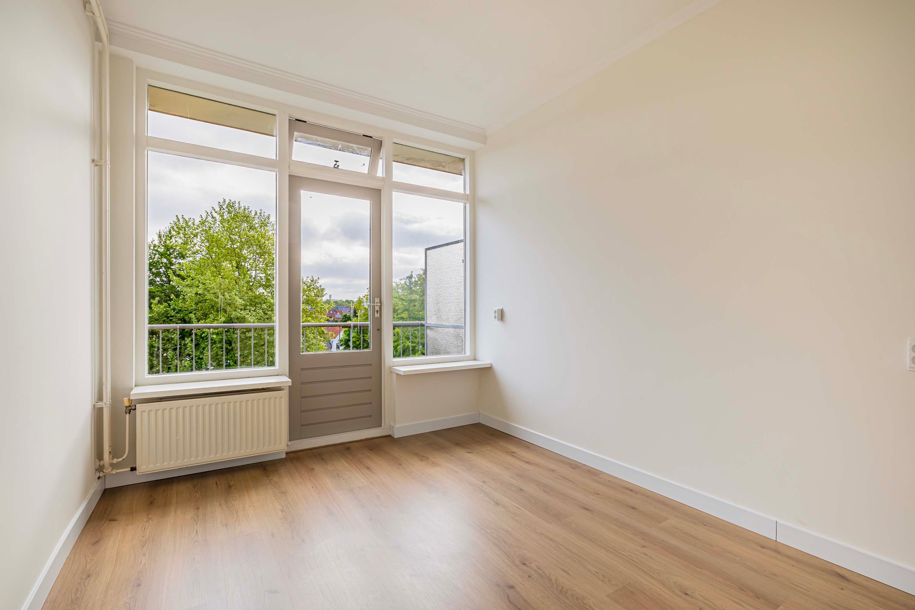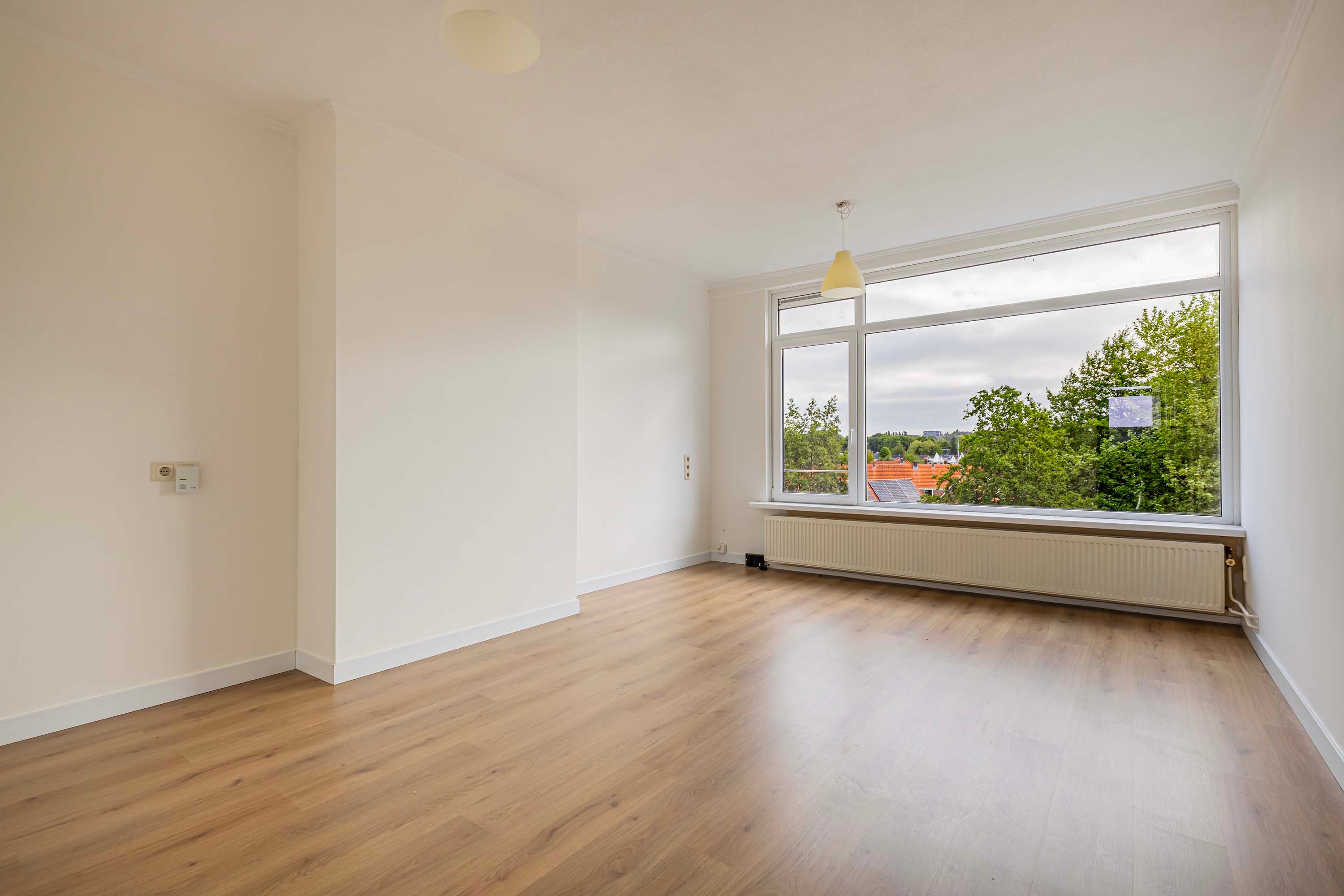 De hal geeft toegang tot alle ruimtes in het appartement. De lichte woonkamer is heerlijk zonnig en heeft een deur naar het balkon op het oosten. Dit is dé plek om te genieten van je kop koffie in de ochtend of een relaxte borrel in de middag terwijl je uitkijkt op het groene plantsoen.