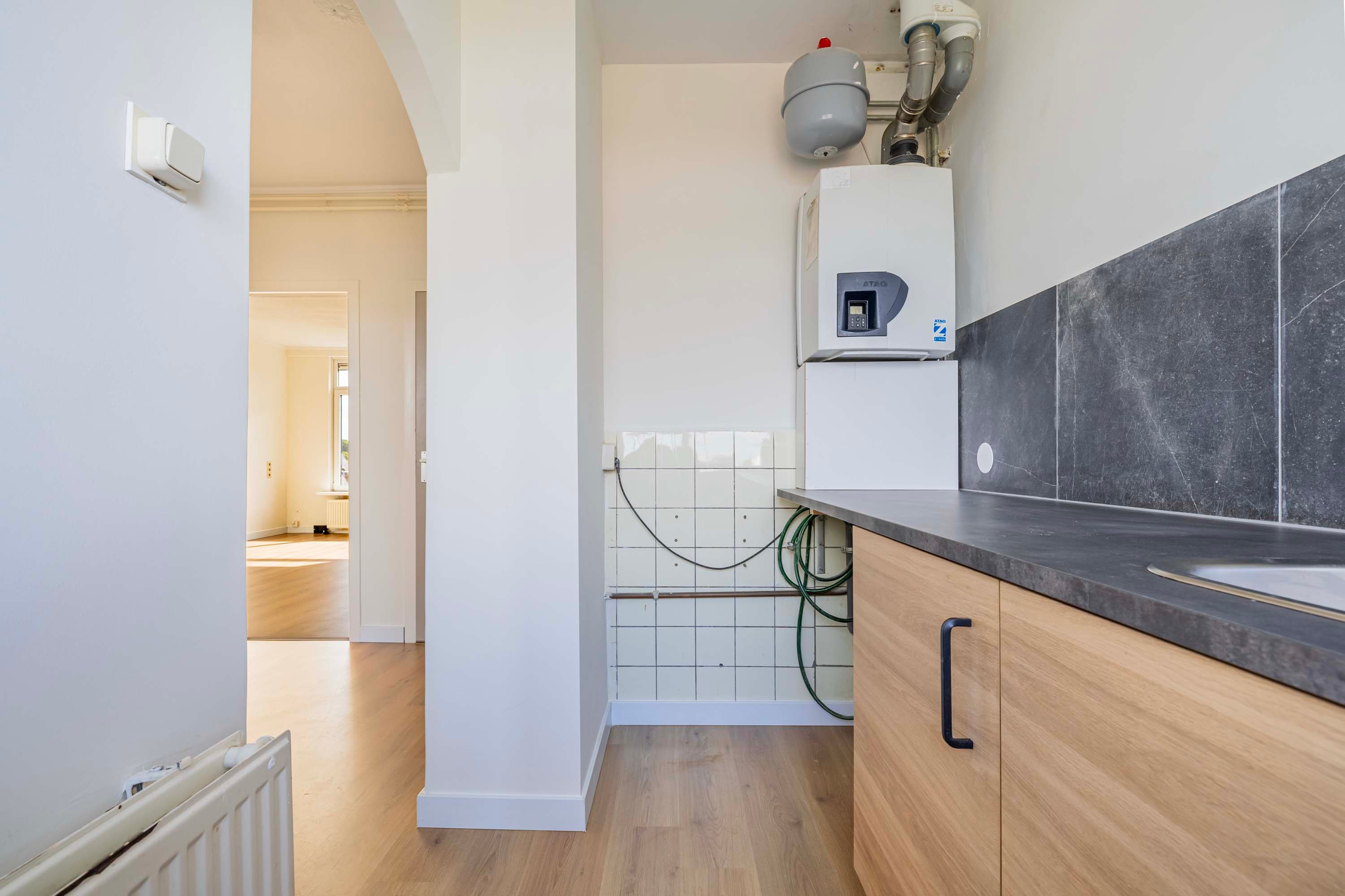 De keuken is eenvoudig, maar netjes afgewerkt en hier is plek voor je eigen losstaande apparatuur. Ook vind je hier de CV-combiketel en aansluiting voor je wasmachine.