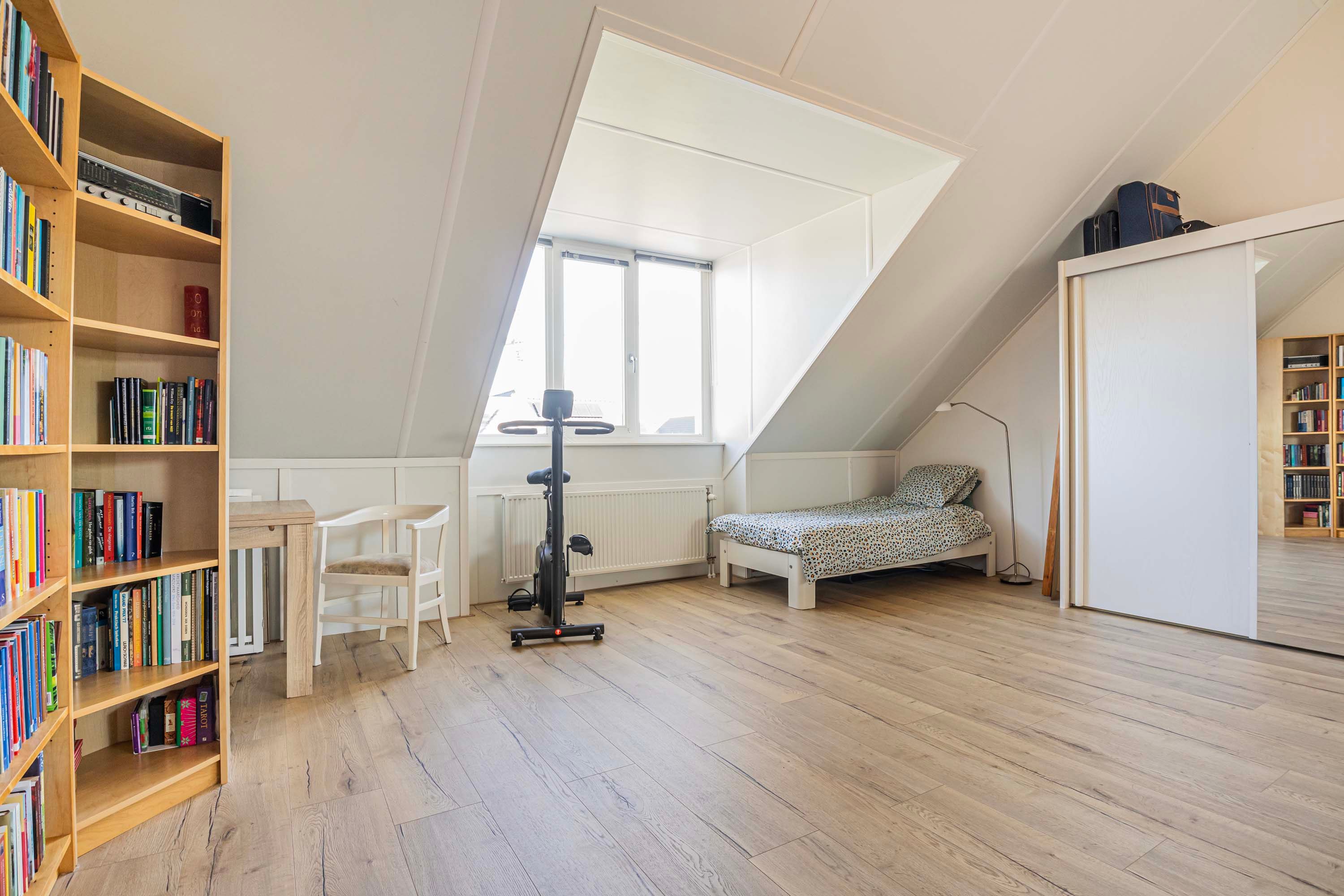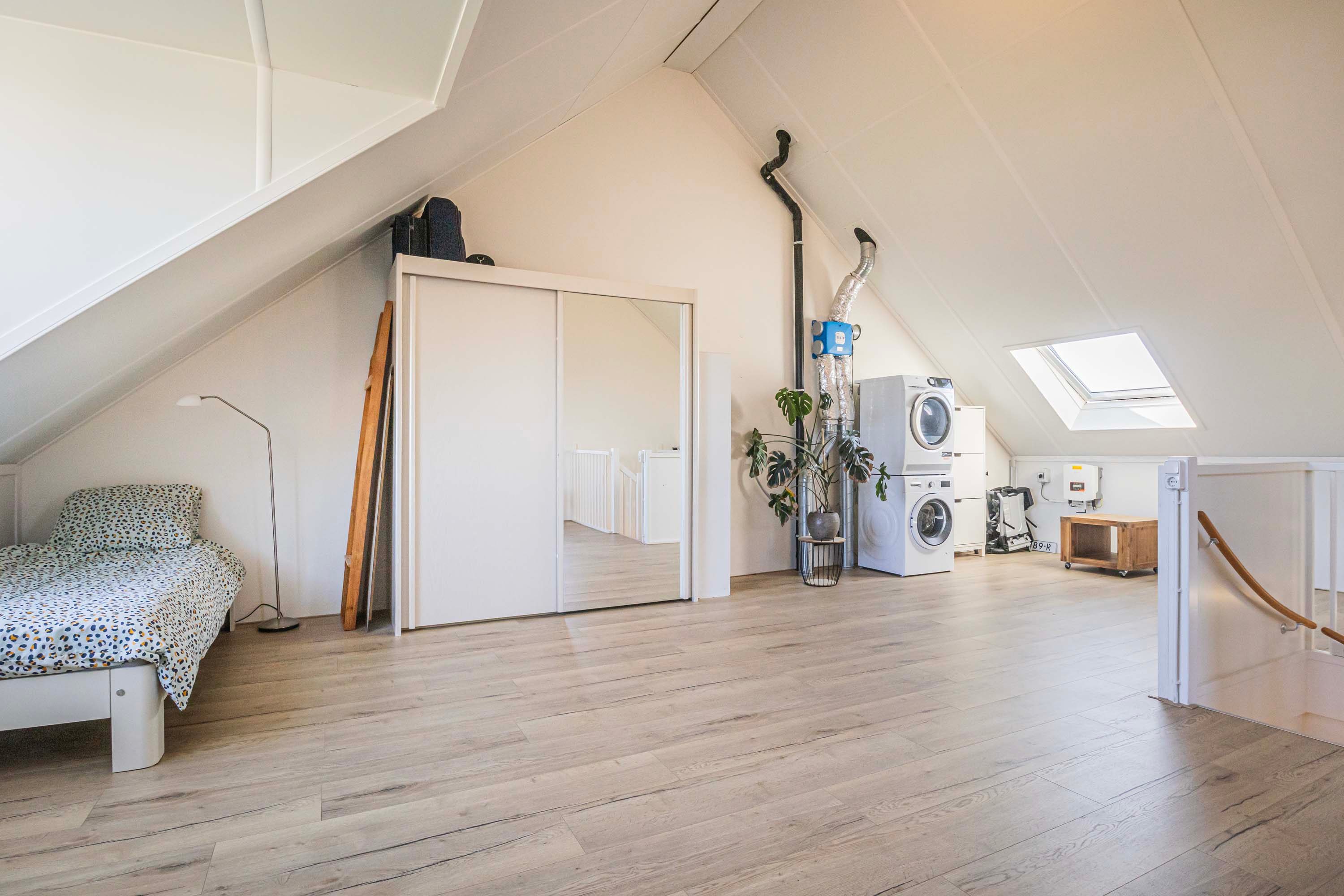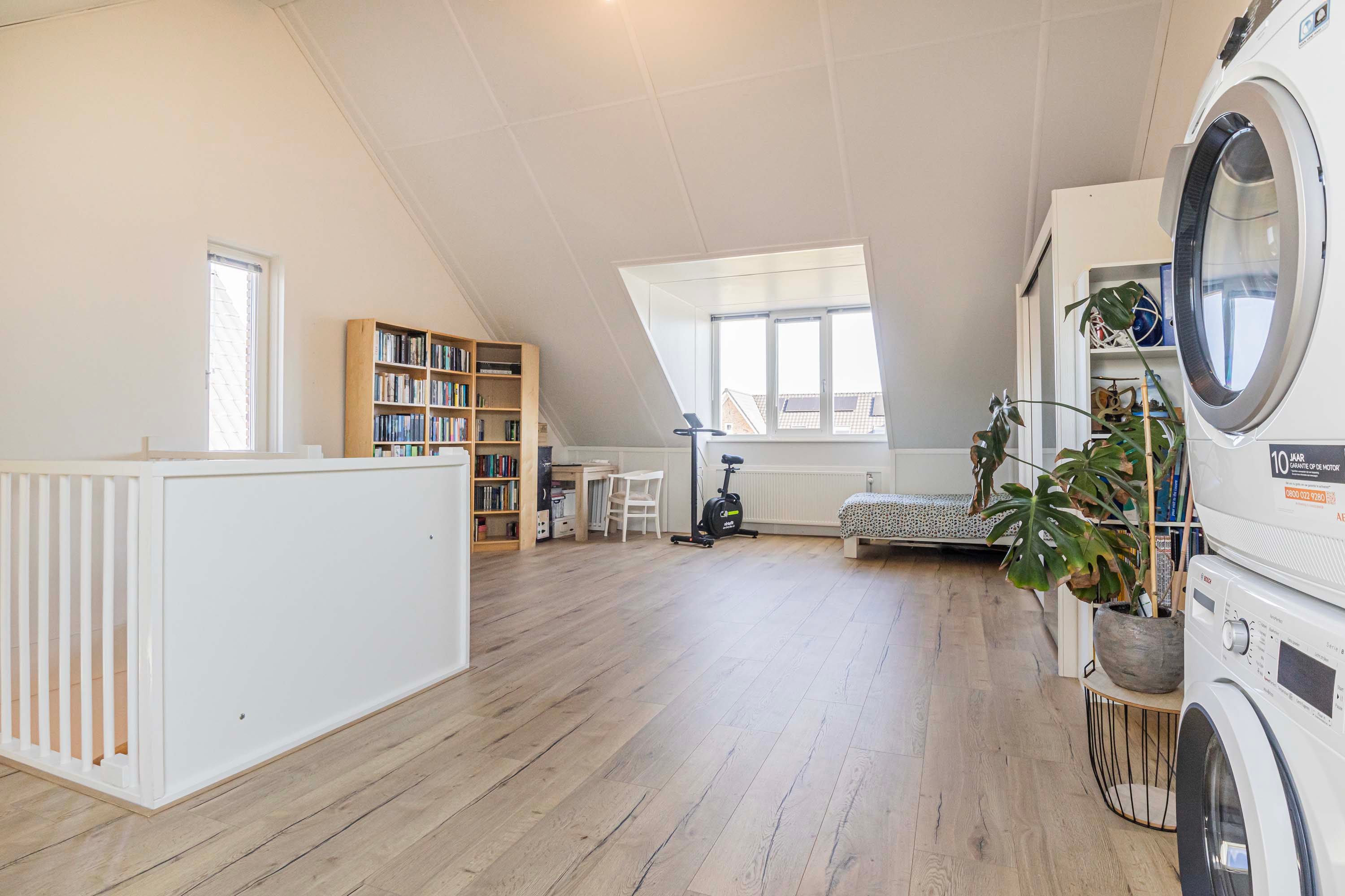 Via een vaste trap is de ruime tweede verdieping te bereiken, die mooi is afgewerkt en door de dakkapel en het dakraam extra licht en ruimte heeft. Hier bevinden zich de aansluitingen voor de wasmachine en droger. Deze etage biedt de mogelijkheid om een vierde slaapkamer te creëren of te gebruiken als werk-, kantoor- of sportruimte. Daarnaast zijn er handige opbergmogelijkheden achter de knieschotten.