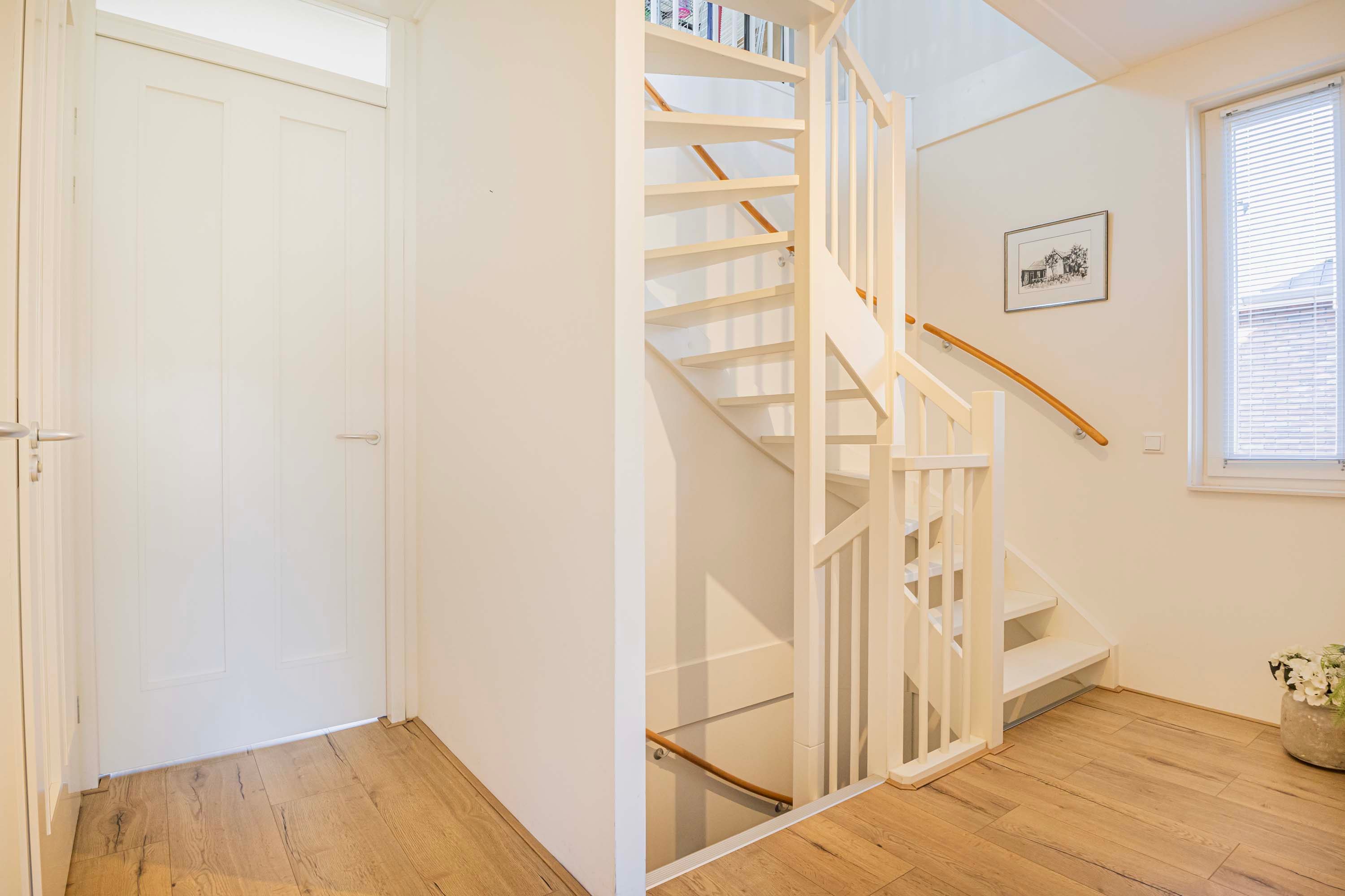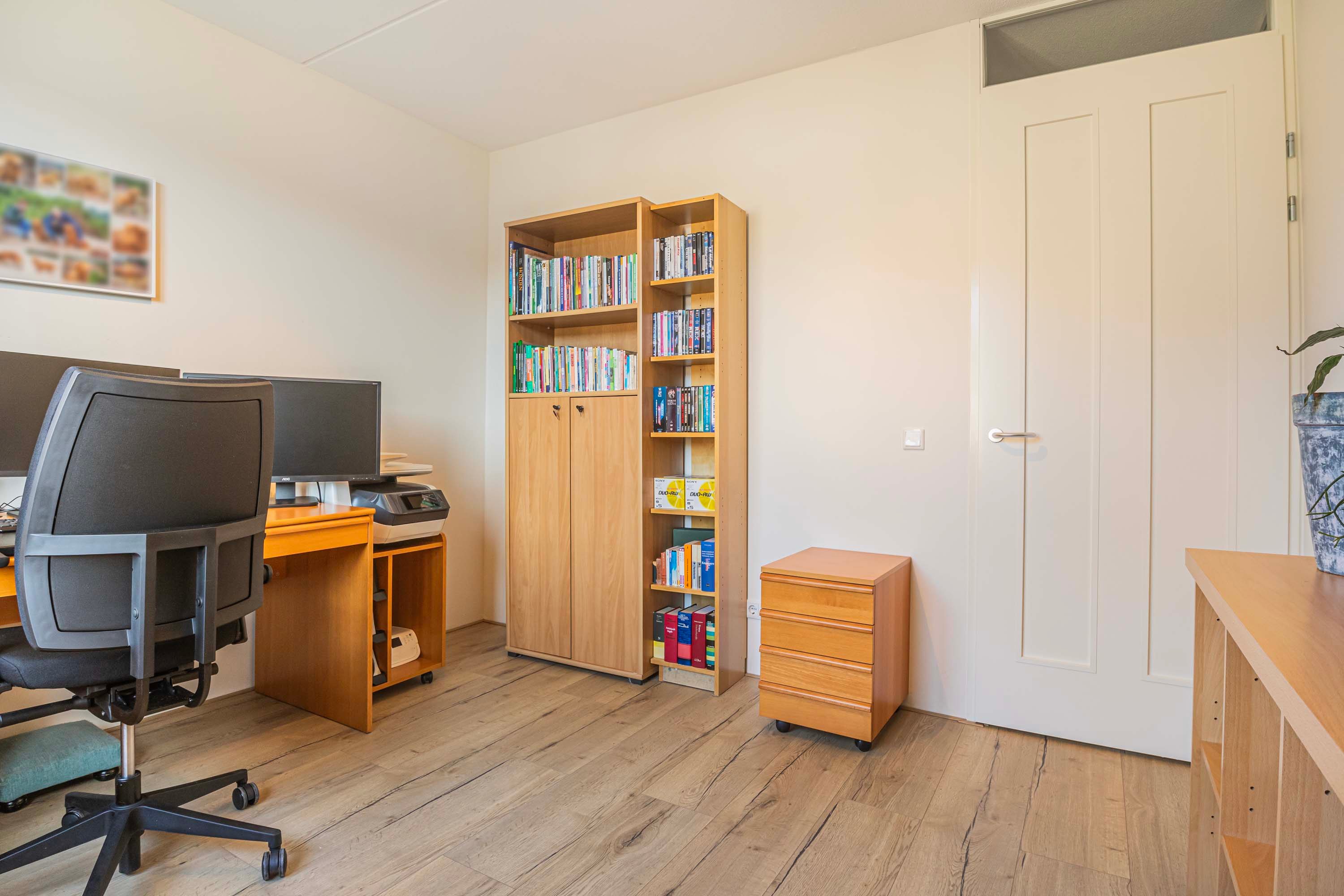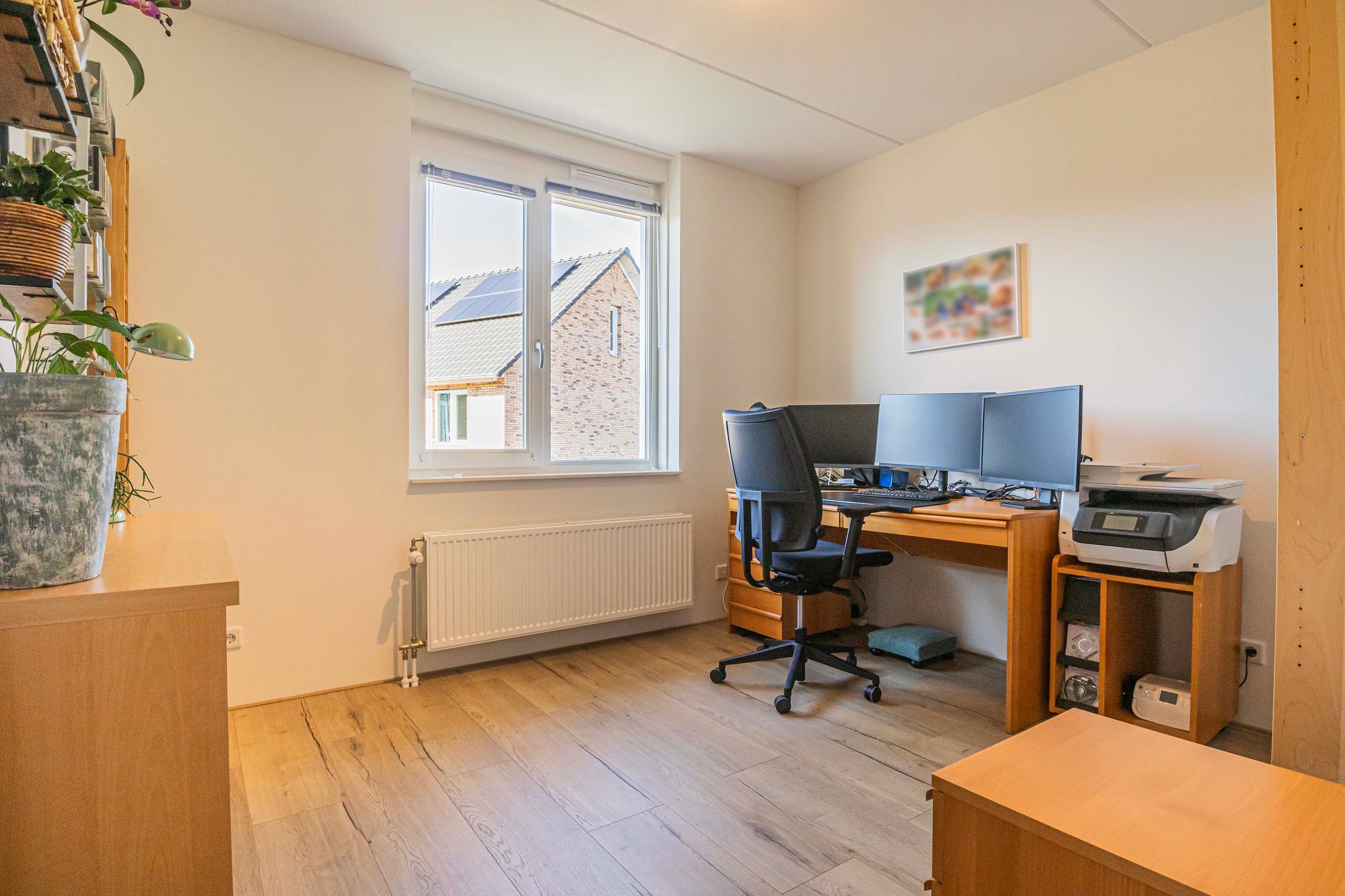 Via een vaste trap is de ruime tweede verdieping te bereiken, die mooi is afgewerkt en door de dakkapel en het dakraam extra licht en ruimte heeft. Hier bevinden zich de aansluitingen voor de wasmachine en droger. Deze etage biedt de mogelijkheid om een vierde slaapkamer te creëren of te gebruiken als werk-, kantoor- of sportruimte. Daarnaast zijn er handige opbergmogelijkheden achter de knieschotten.