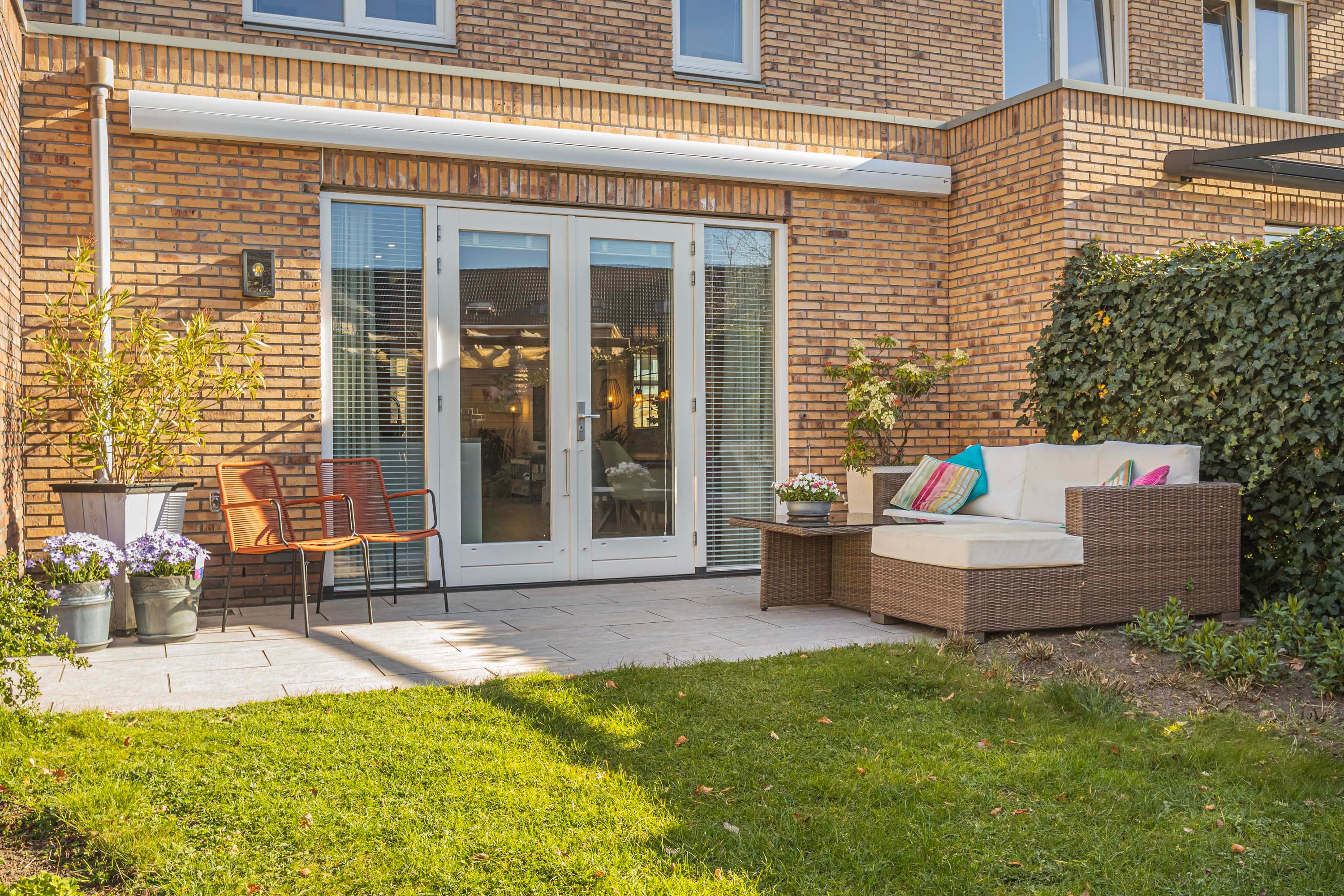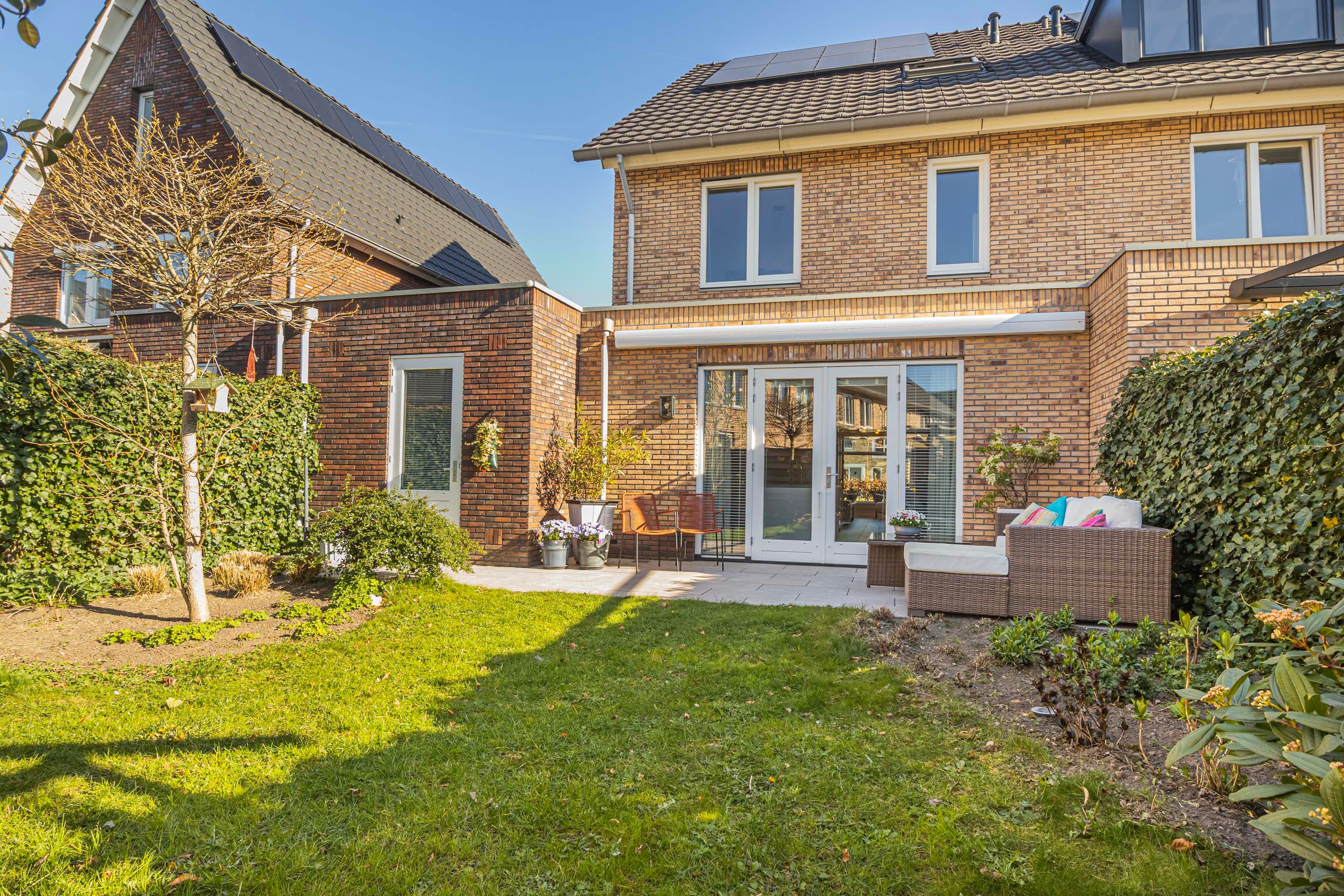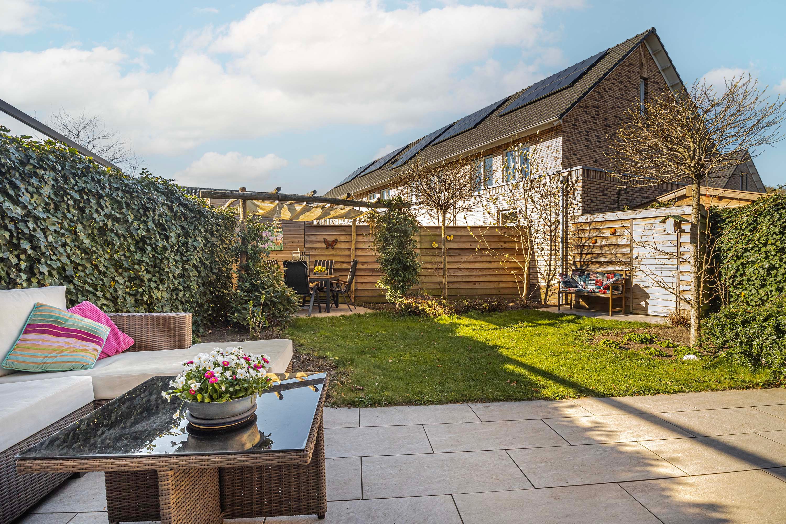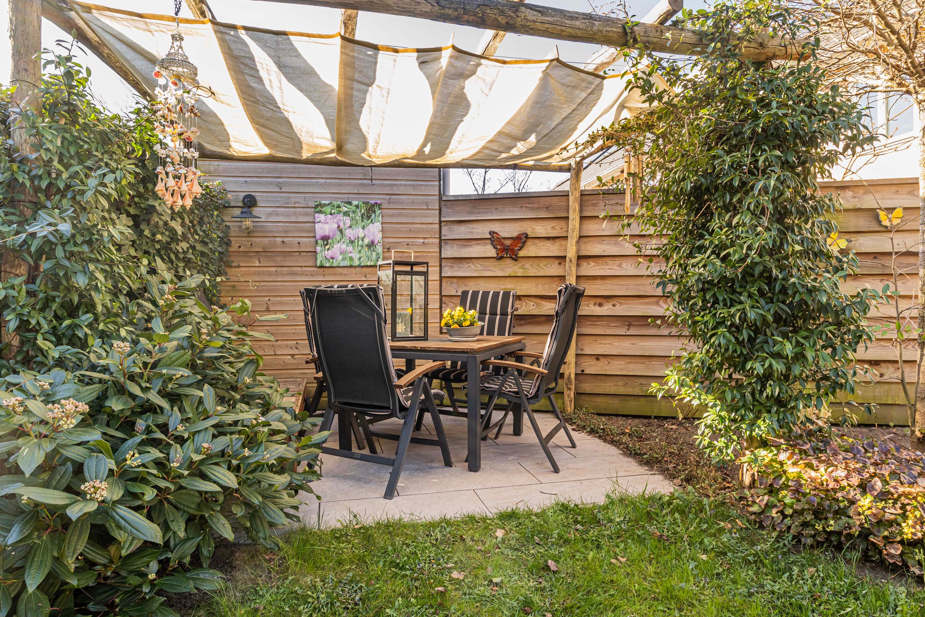 De tuin biedt veel rust en privacy en is voorzien van een tuinkast. De aangename tuin ligt op het zuidwesten en biedt door zijn goede afmetingen voldoende ruimte om zowel van de zon als van de schaduw te genieten. De tuin is voorzien van een pergola met schaduwdoek en een elektrisch zonnescherm.