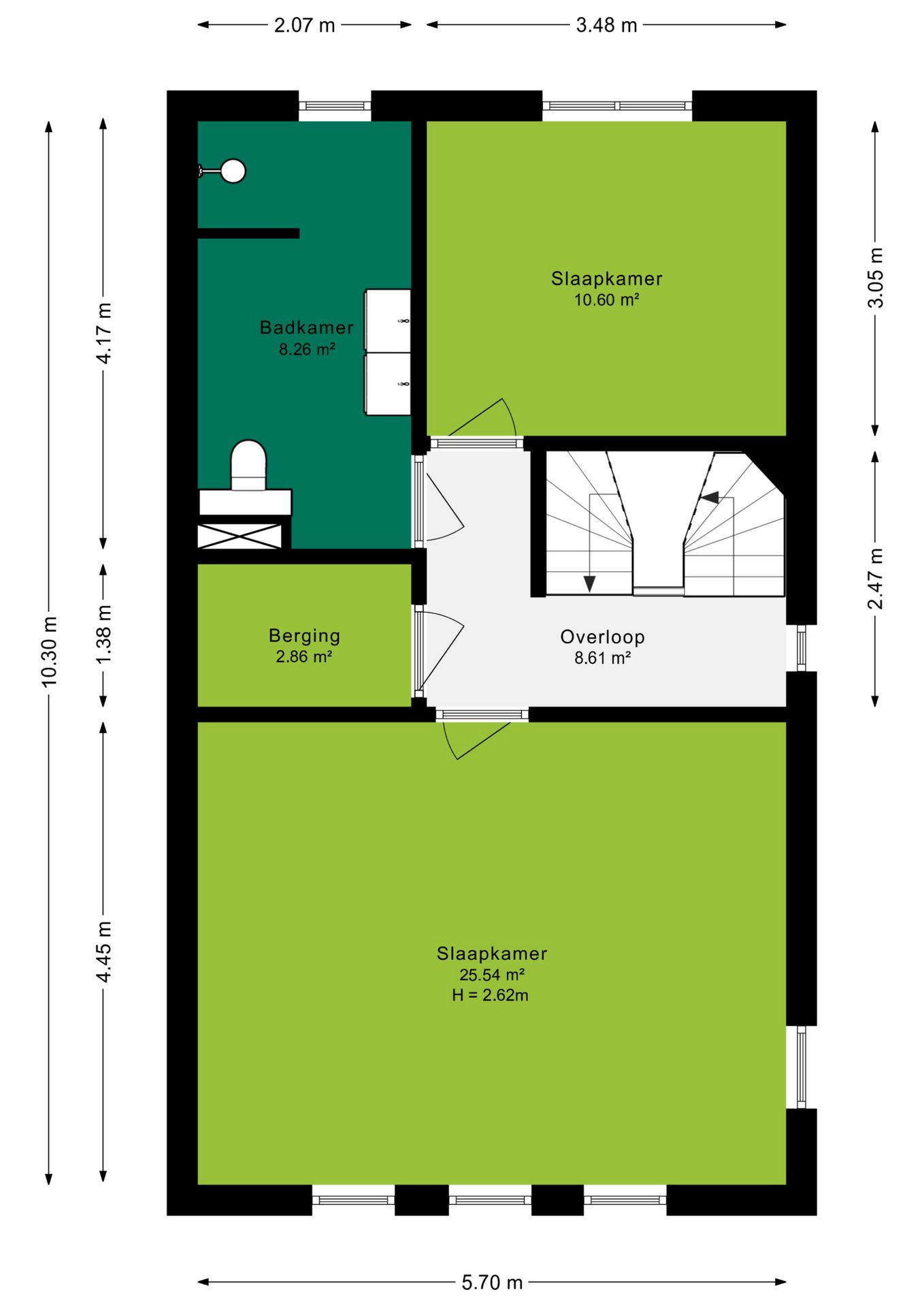 Vanaf de overloop is er toegang tot twee ruime slaapkamers, een inloopkast en de badkamer. De slaapkamers zijn respectievelijk circa 25m² en 11m². Deze kamers zijn voorzien van (grote) ramen en genieten van veel daglicht. Van de grote slaapkamer is met eenvoudige aanpassingen twee slaapkamers te maken.