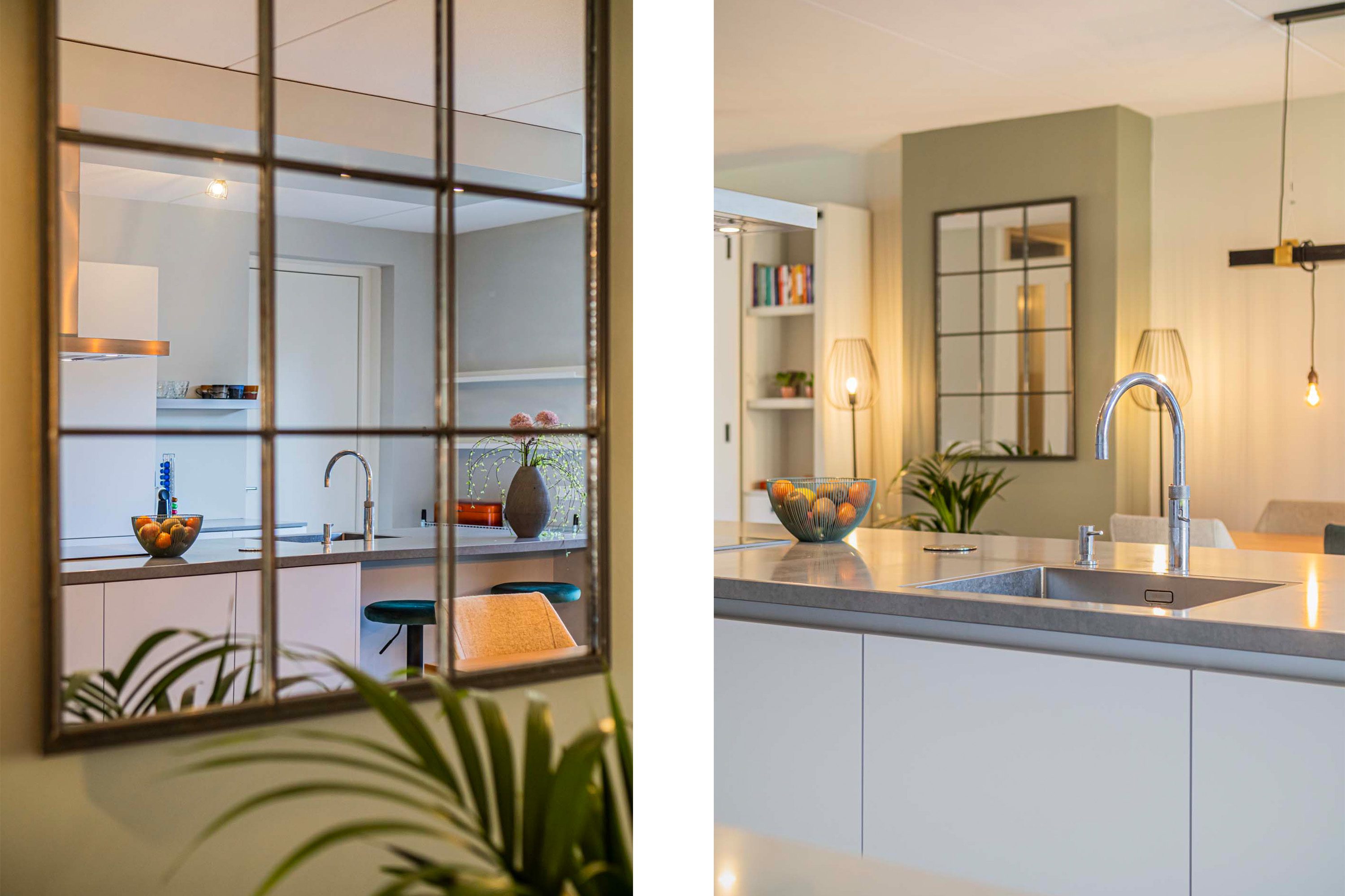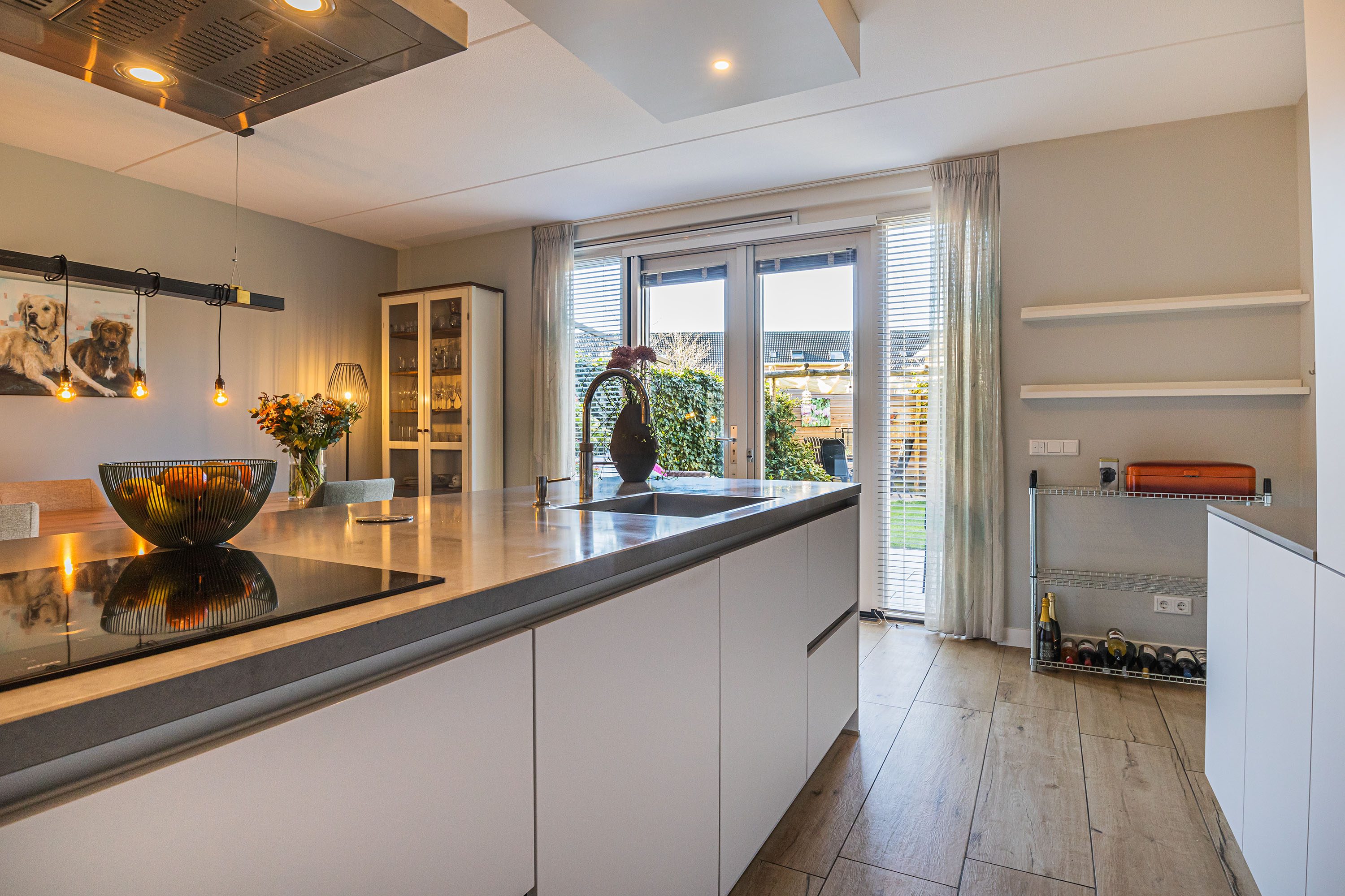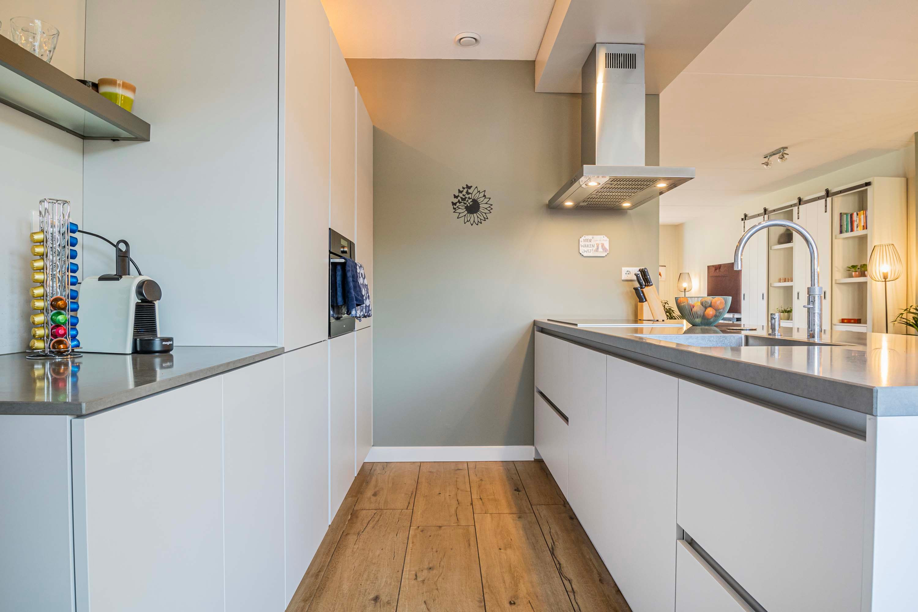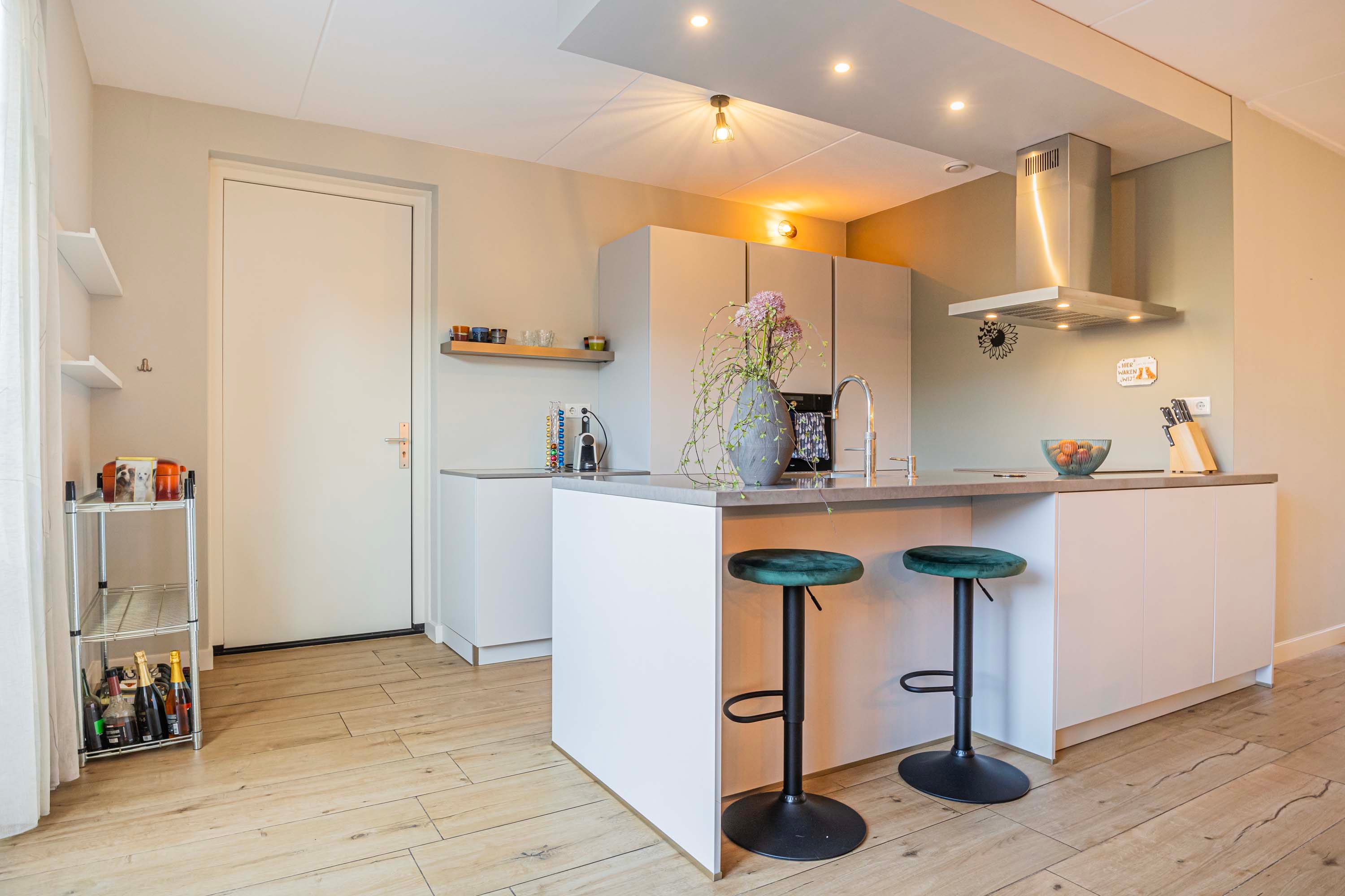 De luxe woonkeuken is speels in het hart van de woning gesitueerd. Uitgevoerd in een moderne kleurstelling en voorzien van een schiereiland met inductiekookplaat, rvs afzuigkap, vaatwasser en spoelbak met een Quooker. In de kastenwand bevinden zich een koelkast en stoomoven.