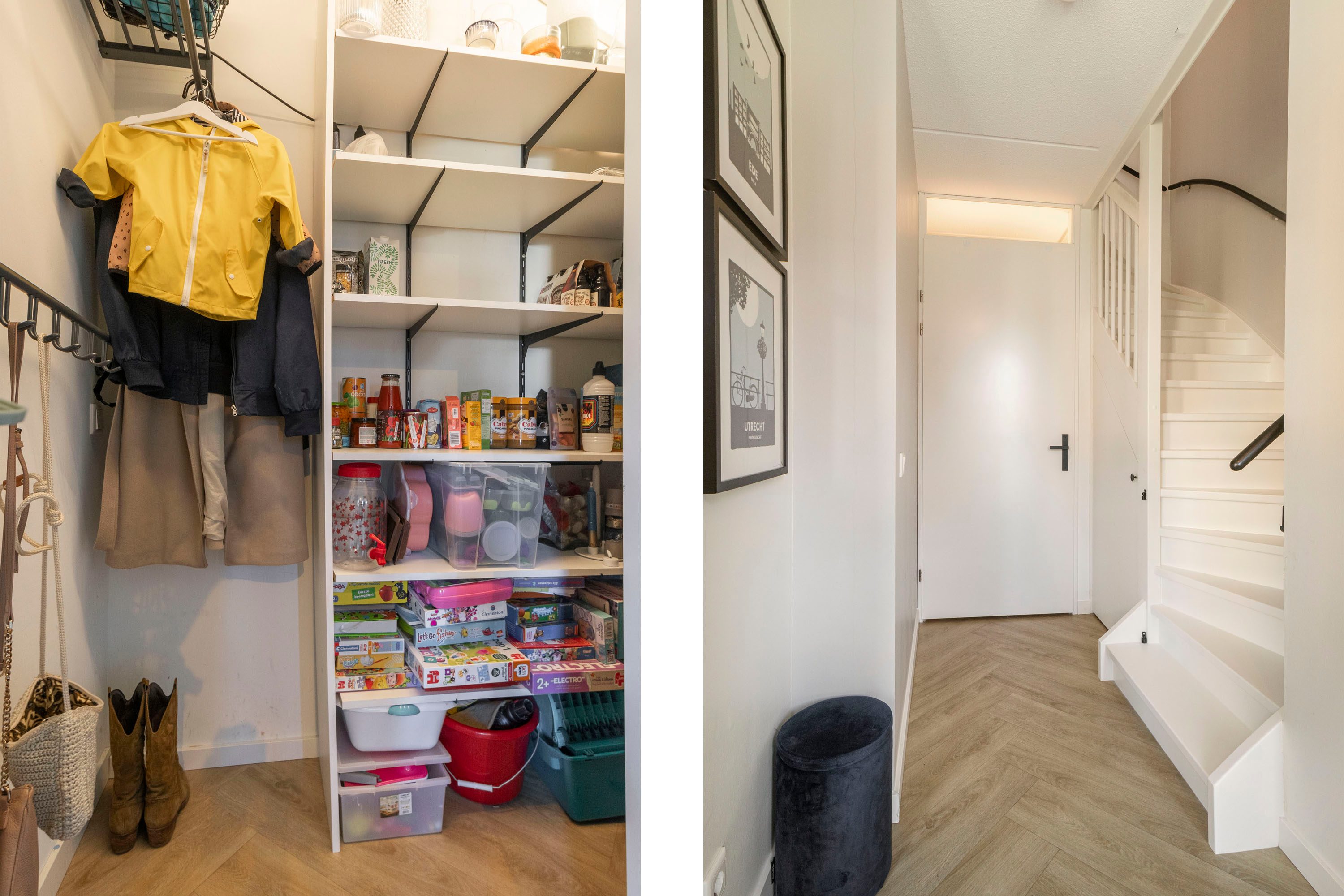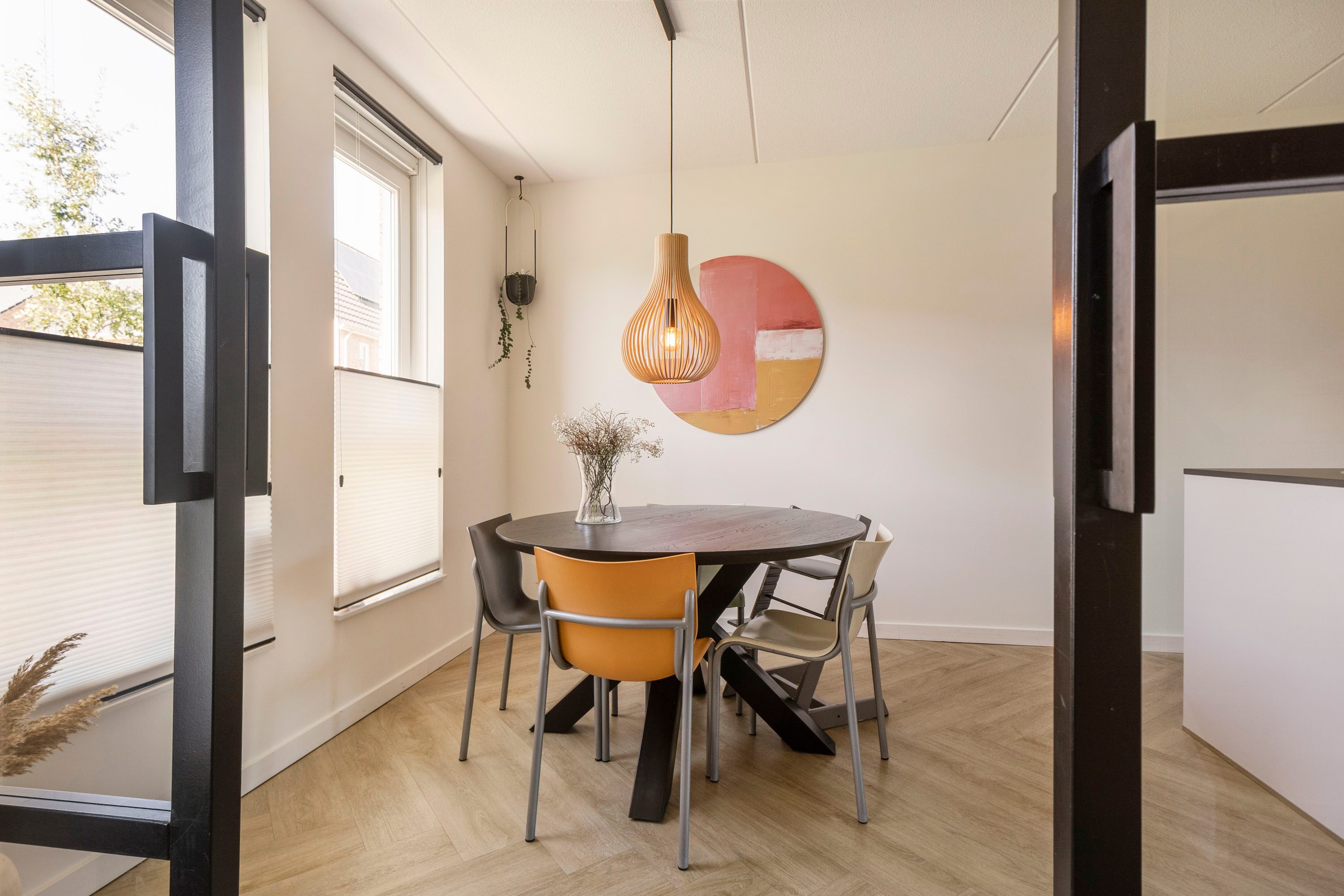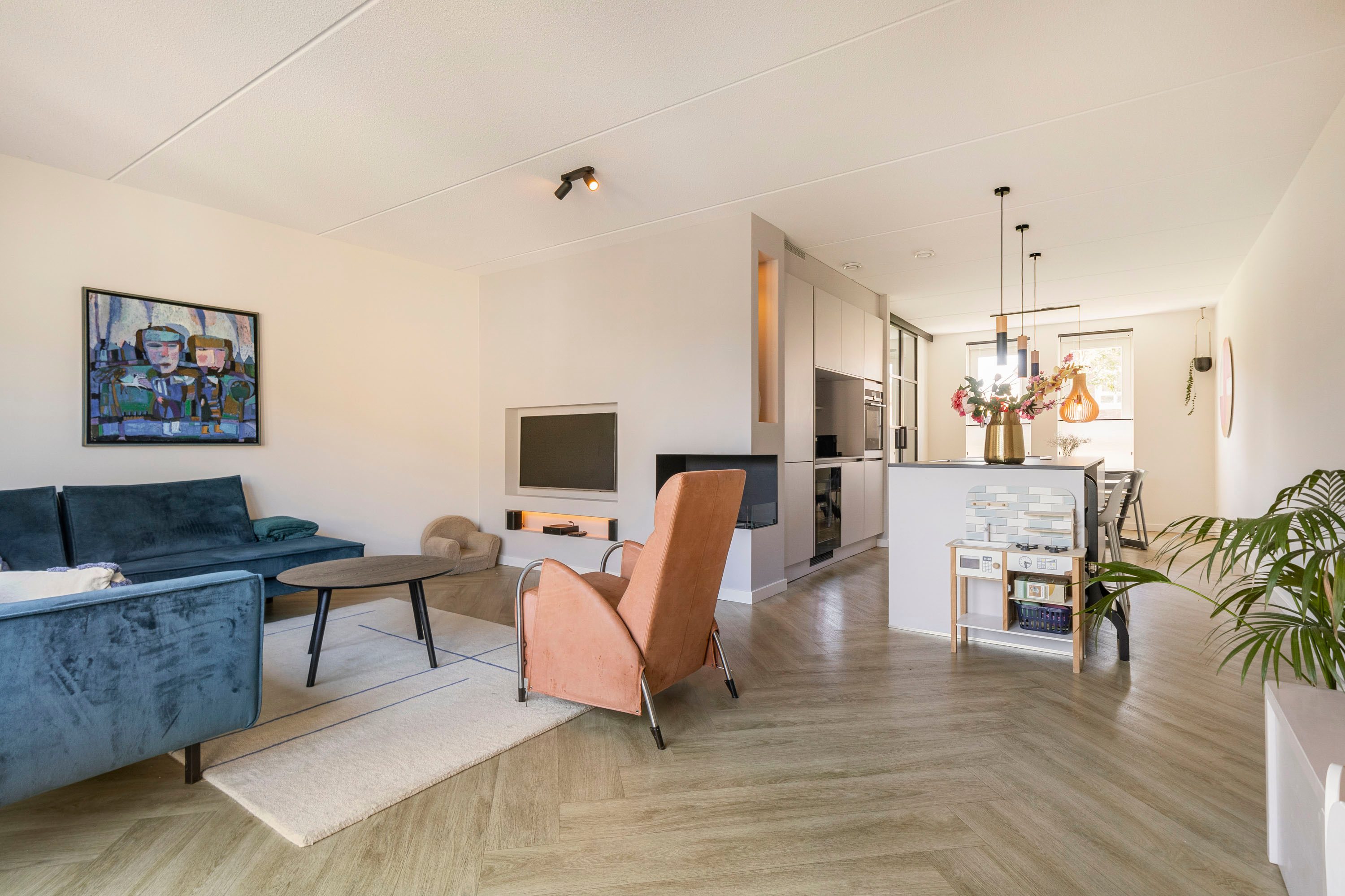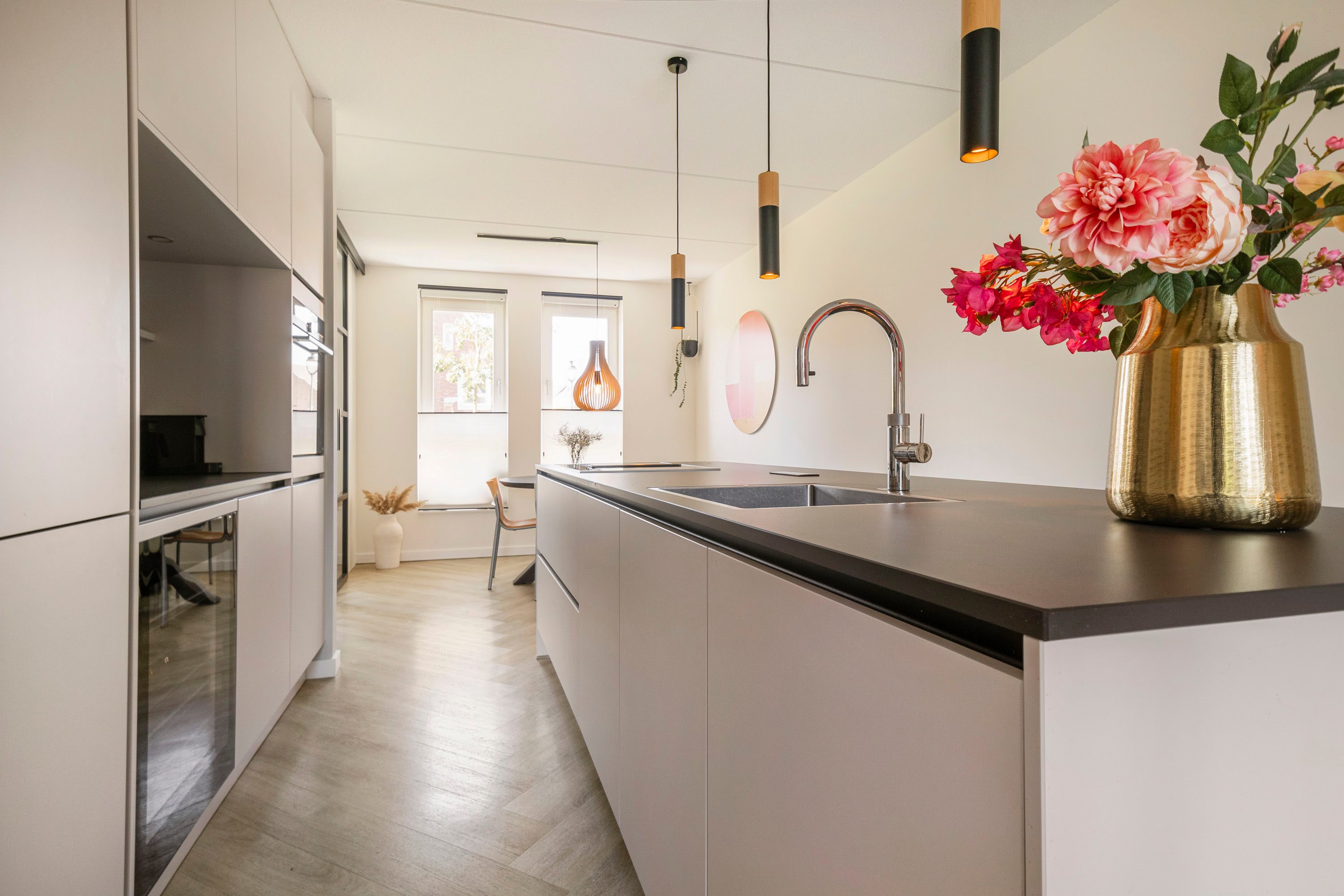 Bij binnenkomst in de hal springen de stijlvolle schuifdeuren direct in het oog, waarmee je toegang krijgt tot de prachtige leefruimte. Deze ruime en lichte leefruimte omvat een open keuken, eetkamer en woonkamer, die moeiteloos in elkaar overlopen. De lichte woonkamer, voorzien van een sfeervolle bio-ethanolhaard, biedt een prachtig uitzicht op de tuin, die bereikbaar is via openslaande deuren. De luxe keuken is ontworpen met oog voor detail en beschikt over een kookeiland, Quooker, combi-oven, geïntegreerde inductieplaat met afzuiging, vaatwasser, koel-vriescombinatie en een wijnkoelkast. Daarnaast biedt de keuken voldoende opbergruimte en kun je extra spullen gemakkelijk kwijt in de praktische trapkast die zich in de hal bevindt.