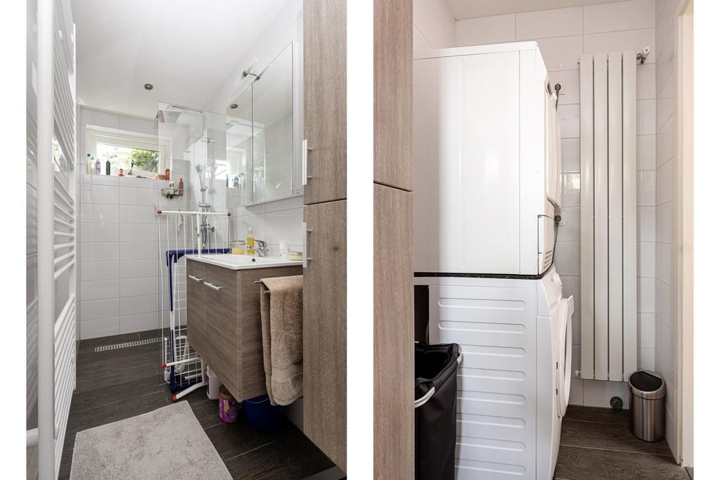 Via de tussenhal is er toegang naar de badkamer, separaat toilet en naar de achtertuin. De volledig getegelde badkamer is in 2020 vernieuwd en voorzien van een inloopdouche, wastafelmeubel, designradiator en aansluiting voor wasmachine- en droger.
