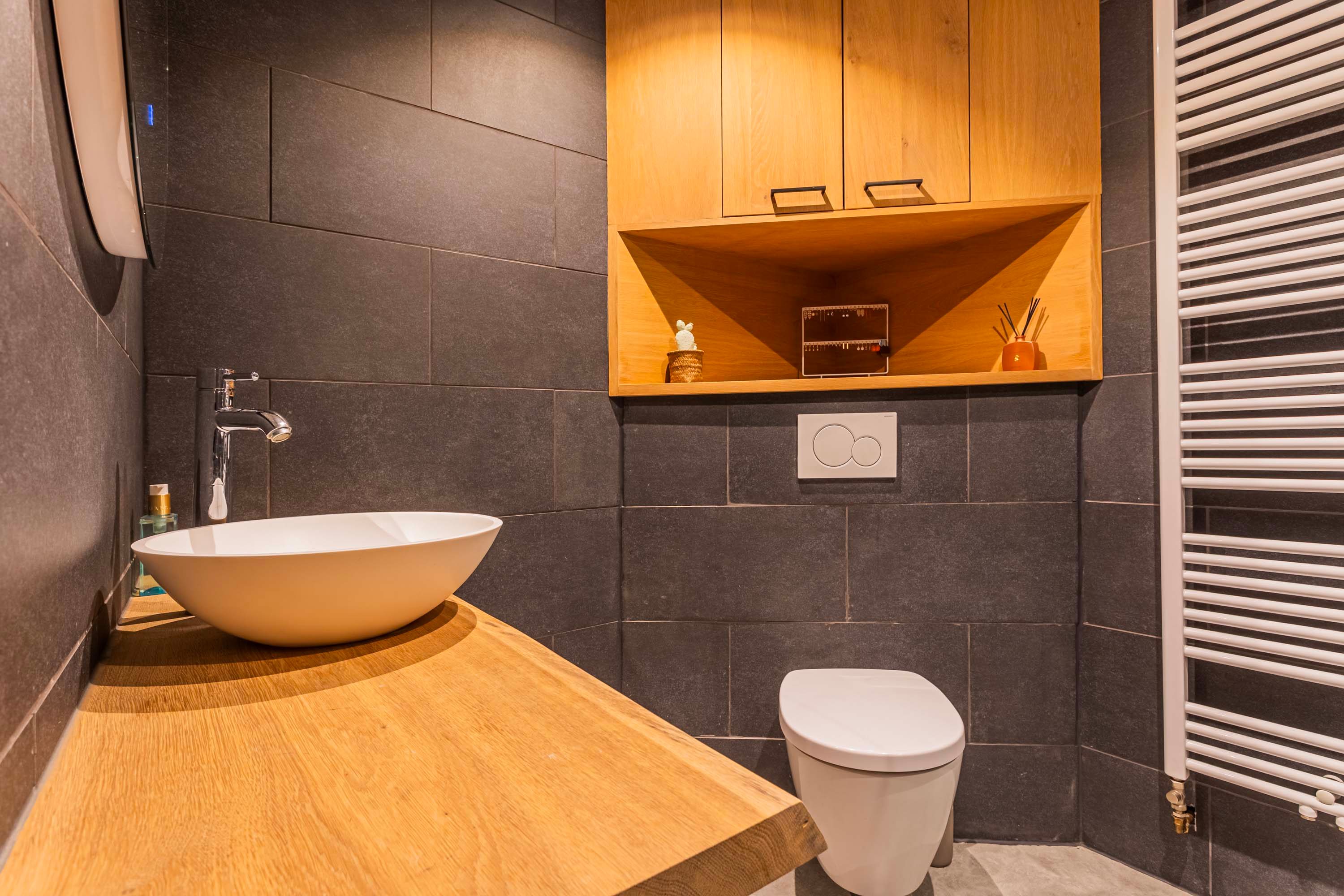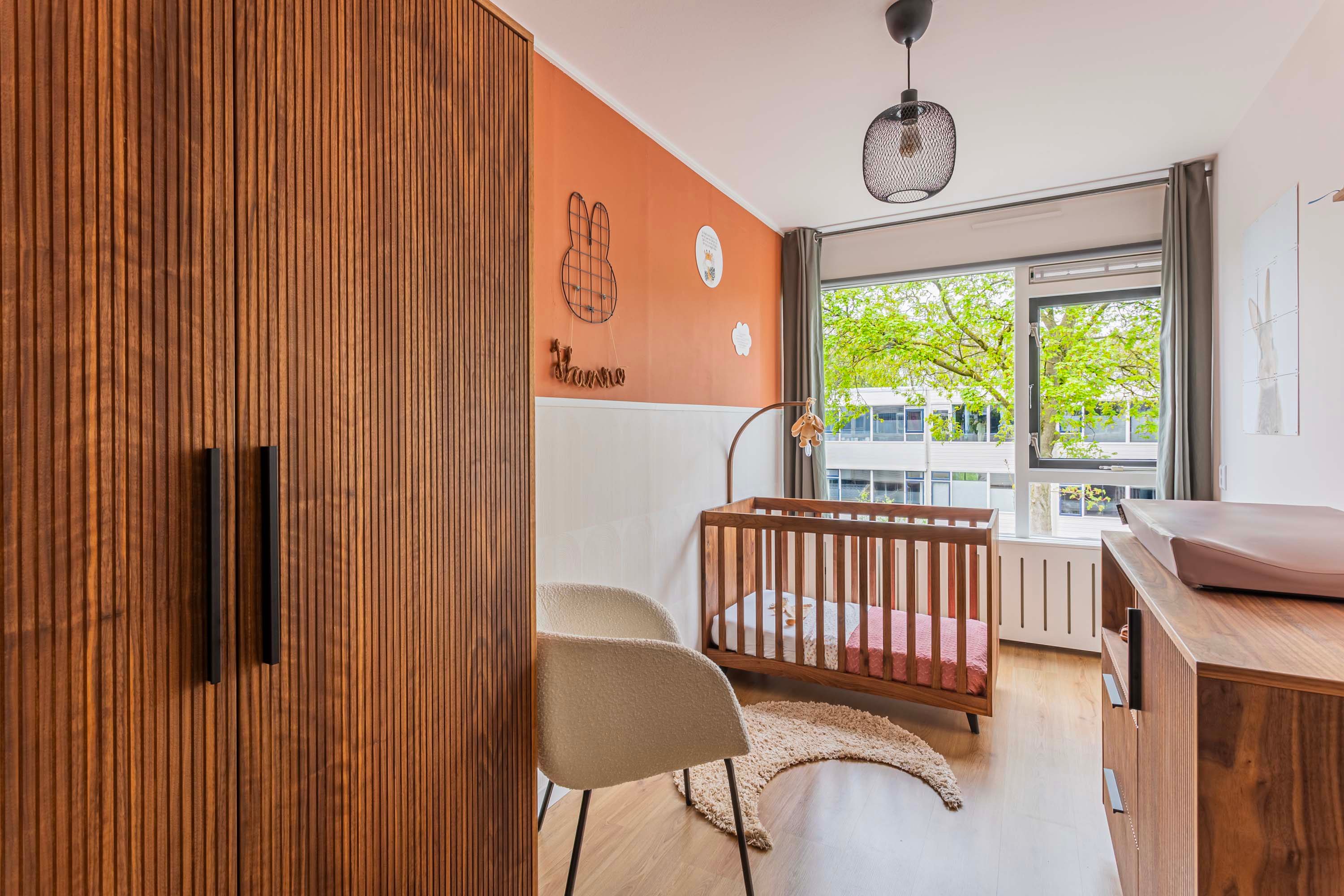 Via de trap kom je op de tweede verdieping, waar je drie ruime slaapkamers tegenkomt. Elk van deze kamers biedt volop natuurlijk licht en diverse mogelijkheden. De moderne badkamer straalt luxe uit door het gebruik van donkere tegels en is uitgerust met een douche, een toilet, een designradiator en een stijlvolle wastafel.