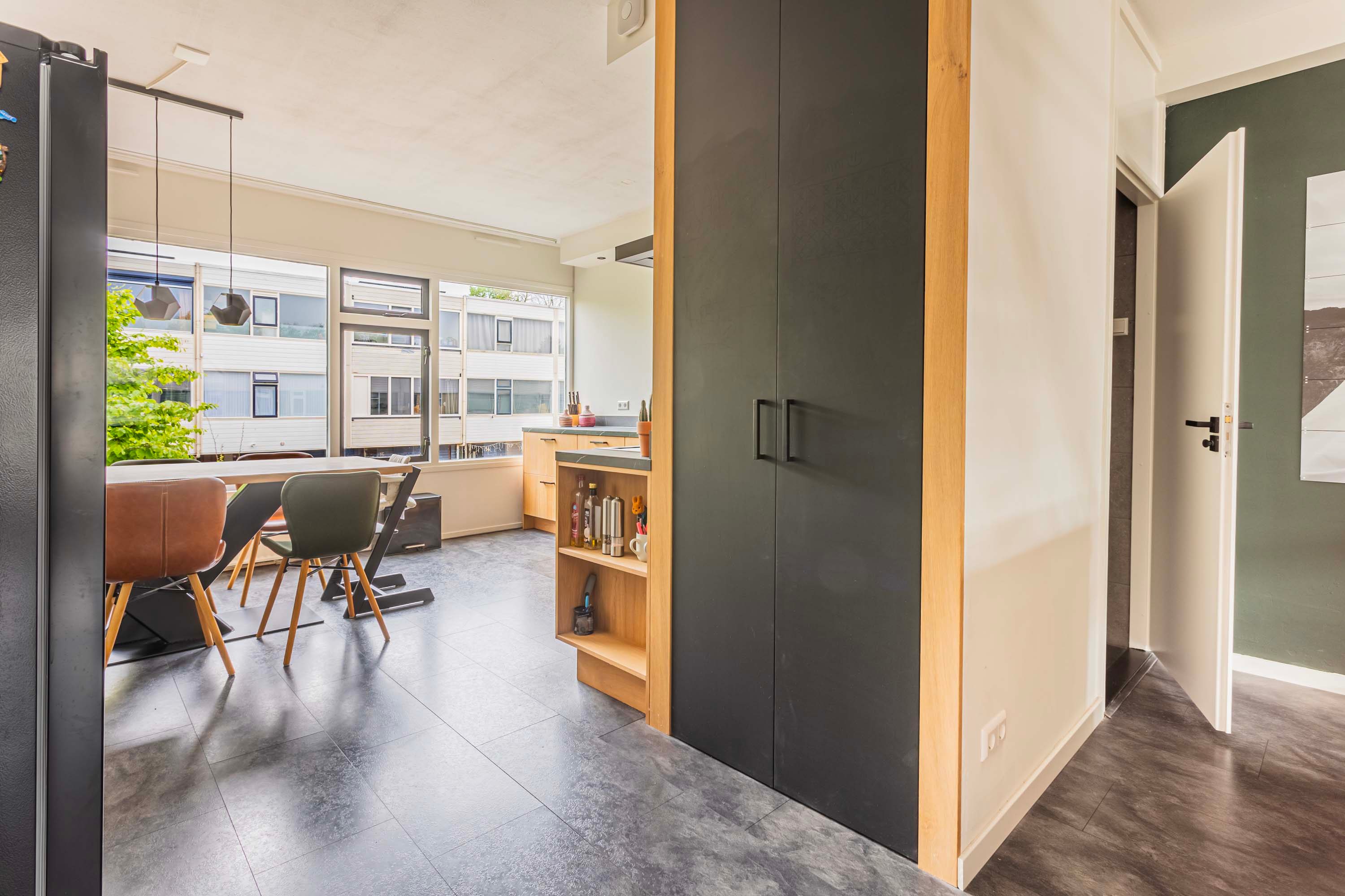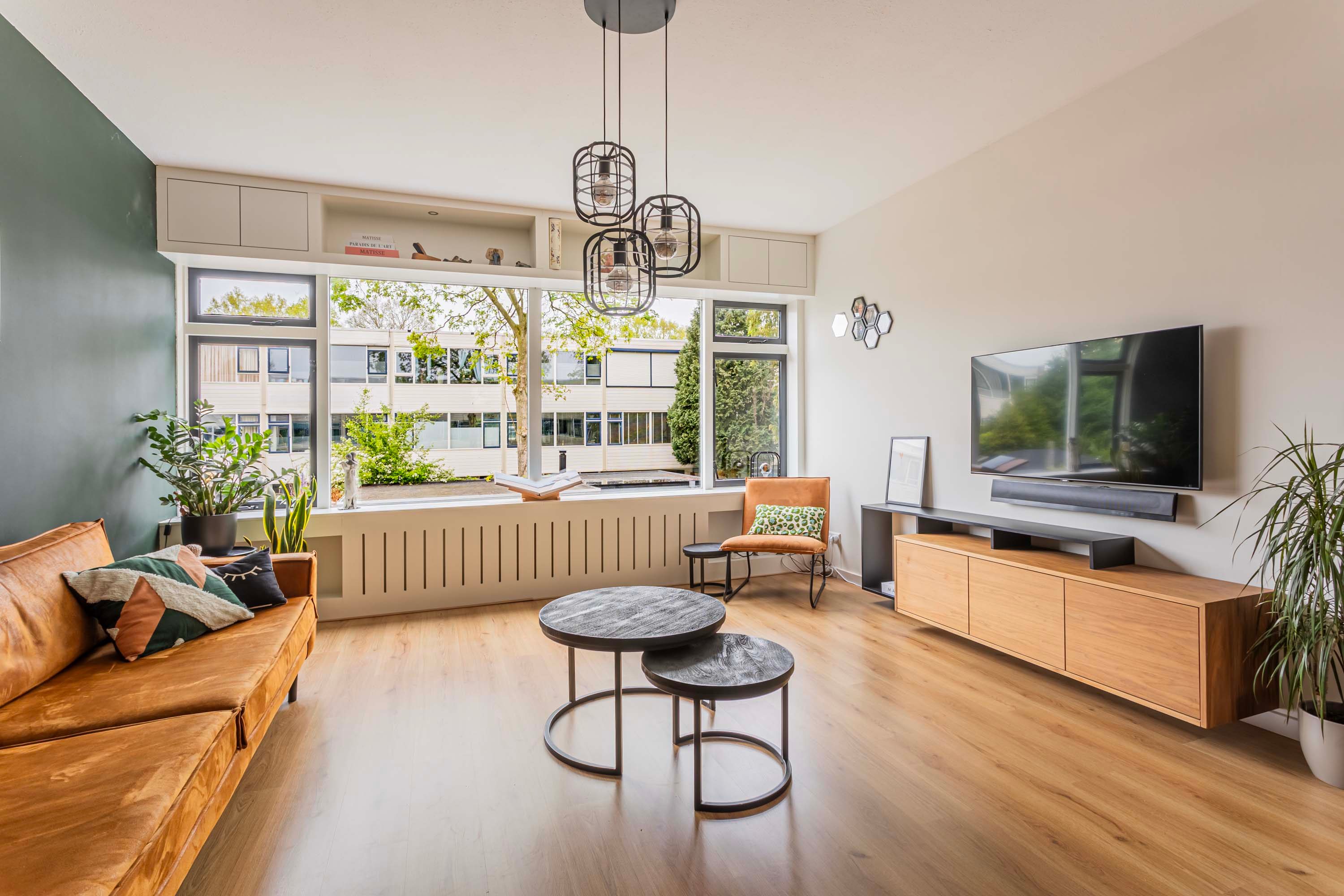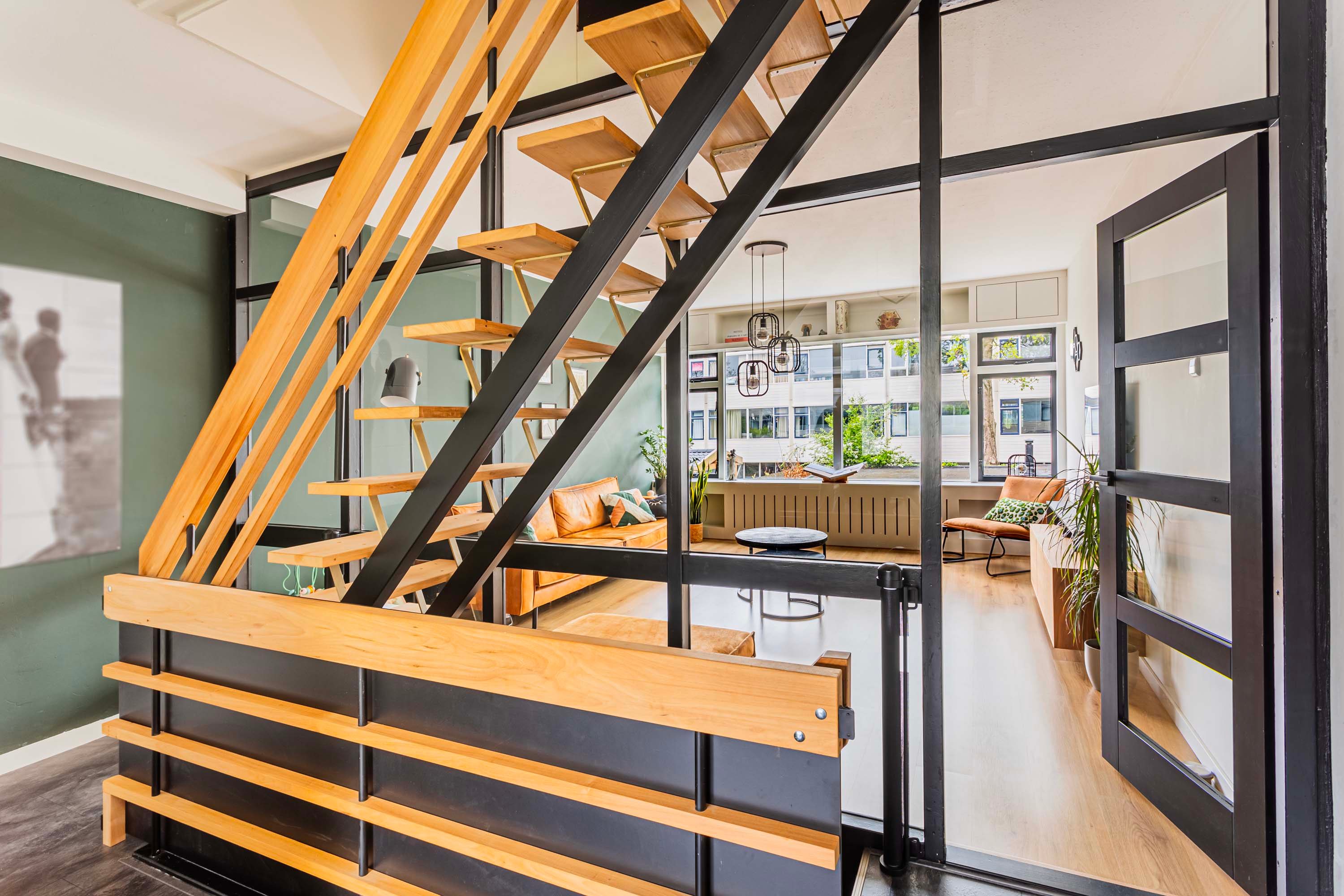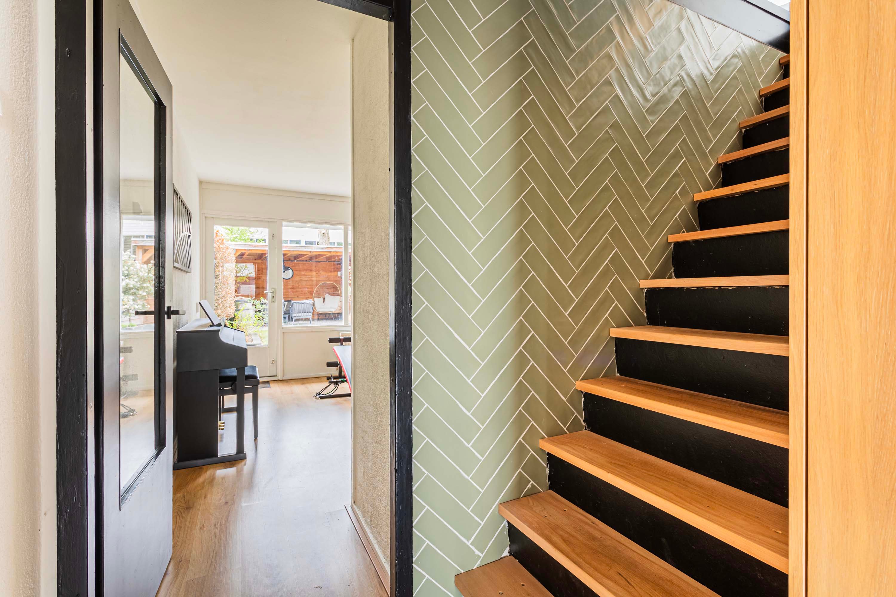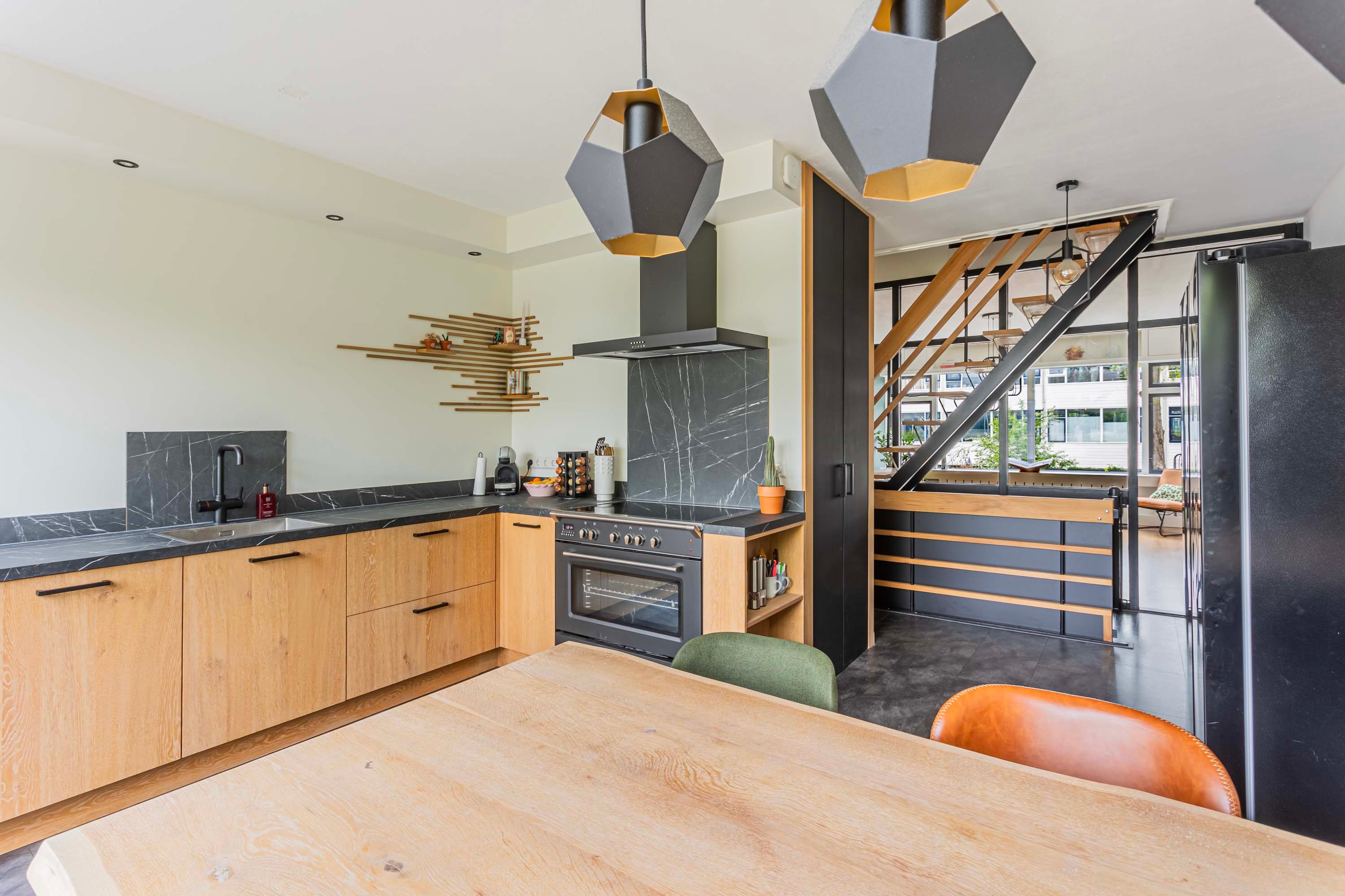 Via de trap kom je op de eerste verdieping. Aan de voorzijde bevindt zich de moderne keuken, uitgevoerd met een donker werkblad en houten kastjes, wat zorgt voor een warme en stijlvolle uitstraling. De keuken beschikt over diverse inbouwapparatuur, zoals een inductiekookplaat, een afzuigkap, quooker, een oven en een vaatwasser. Vanuit de hal loop je door naar de achterzijde van de woning naar de ruime woonkamer. De grote raampartijen zorgen voor veel natuurlijk licht, waardoor de woonkamer een lichte en uitnodigende uitstraling heeft.