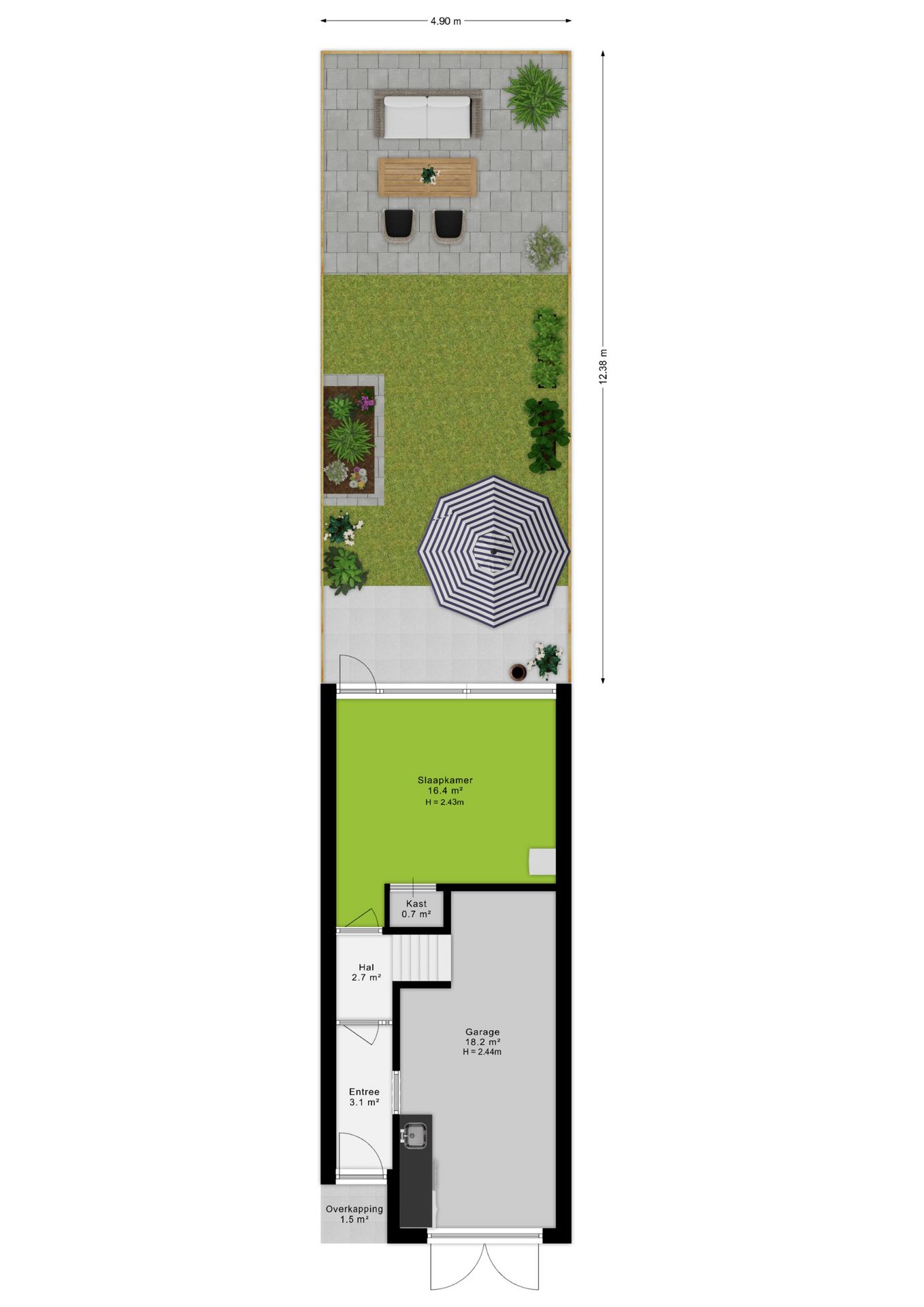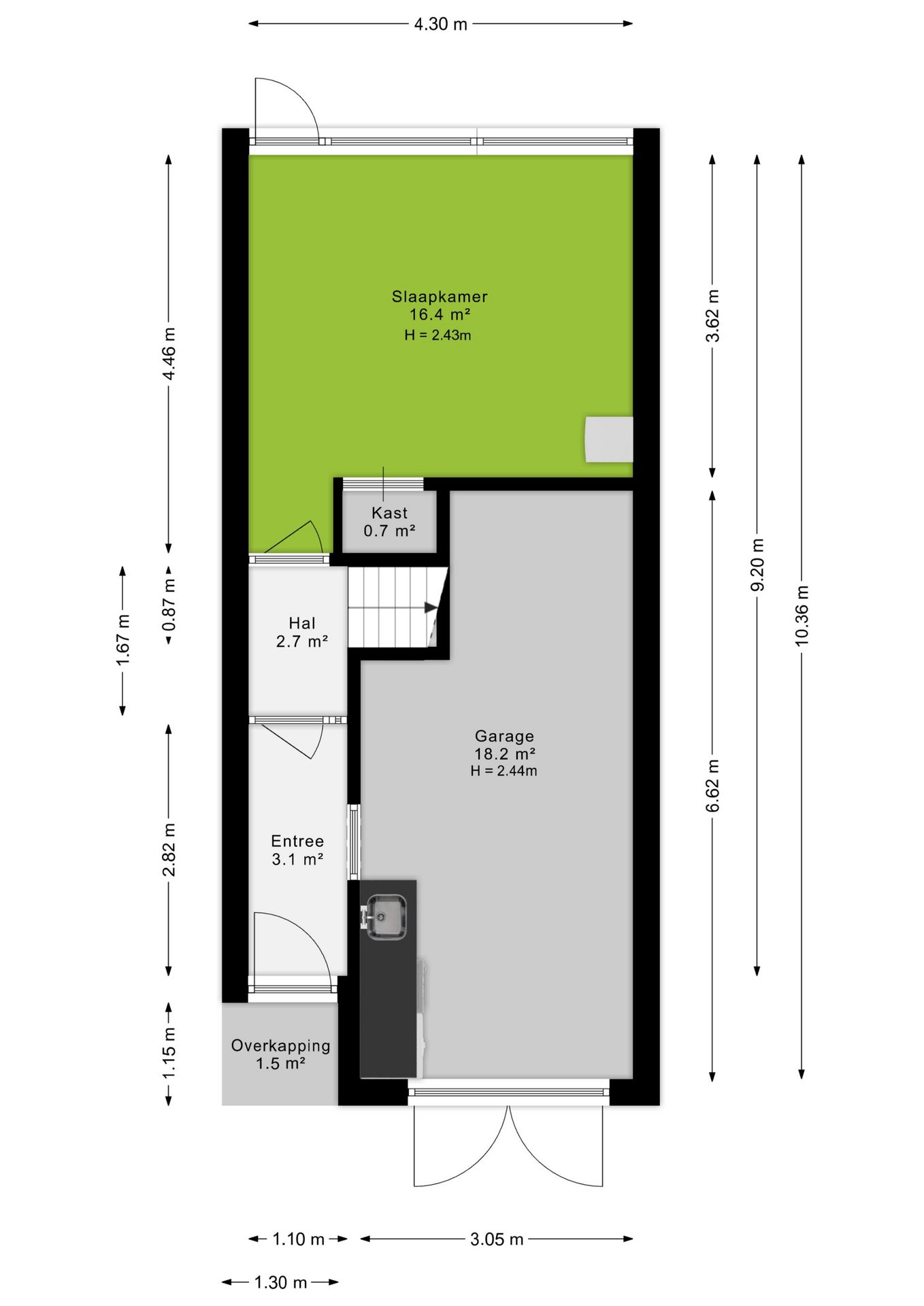 Bij binnenkomst kom je in de entree, aan de rechterzijde bevindt zich de garage van circa 18 m² in de garage bevindt zich ook een wastafel. Terugkerend in de hal bereiken we de trapopgang naar de eerste verdieping, verderop is er een slaapkamer.