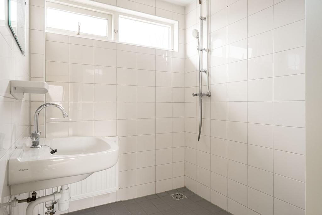 De overloop biedt toegang tot drie slaapkamers, de badkamer en via de vaste trap is de zolder bereikbaar. De badkamer is volledig betegeld en voorzien van een inloopdouche en wastafel. Het raam in de badkamer biedt een fijn daglicht en de mogelijkheid om op een natuurlijke manier te ventileren.