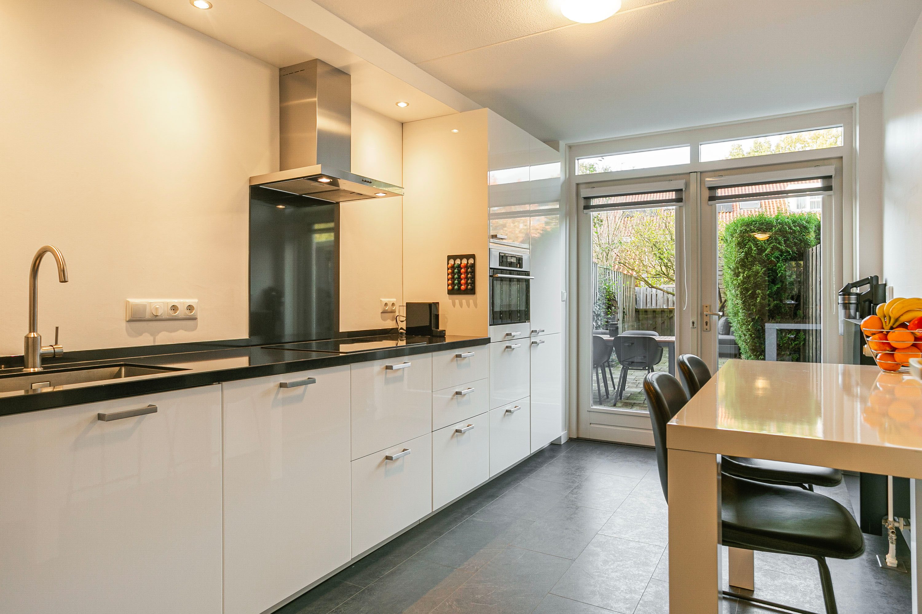 Je komt binnen in een ruime hal met meterkast en toiletruimte. Loop je door, dan kom je in de moderne keuken, voorzien van combi-oven, vaatwasser, kookplaat en koel-vriescombinatie. Er is plek voor een ontbijthoek of eettafel. De openslaande deuren geven direct toegang tot de diepe tuin, waardoor binnen en buiten prettig met elkaar verbonden zijn.