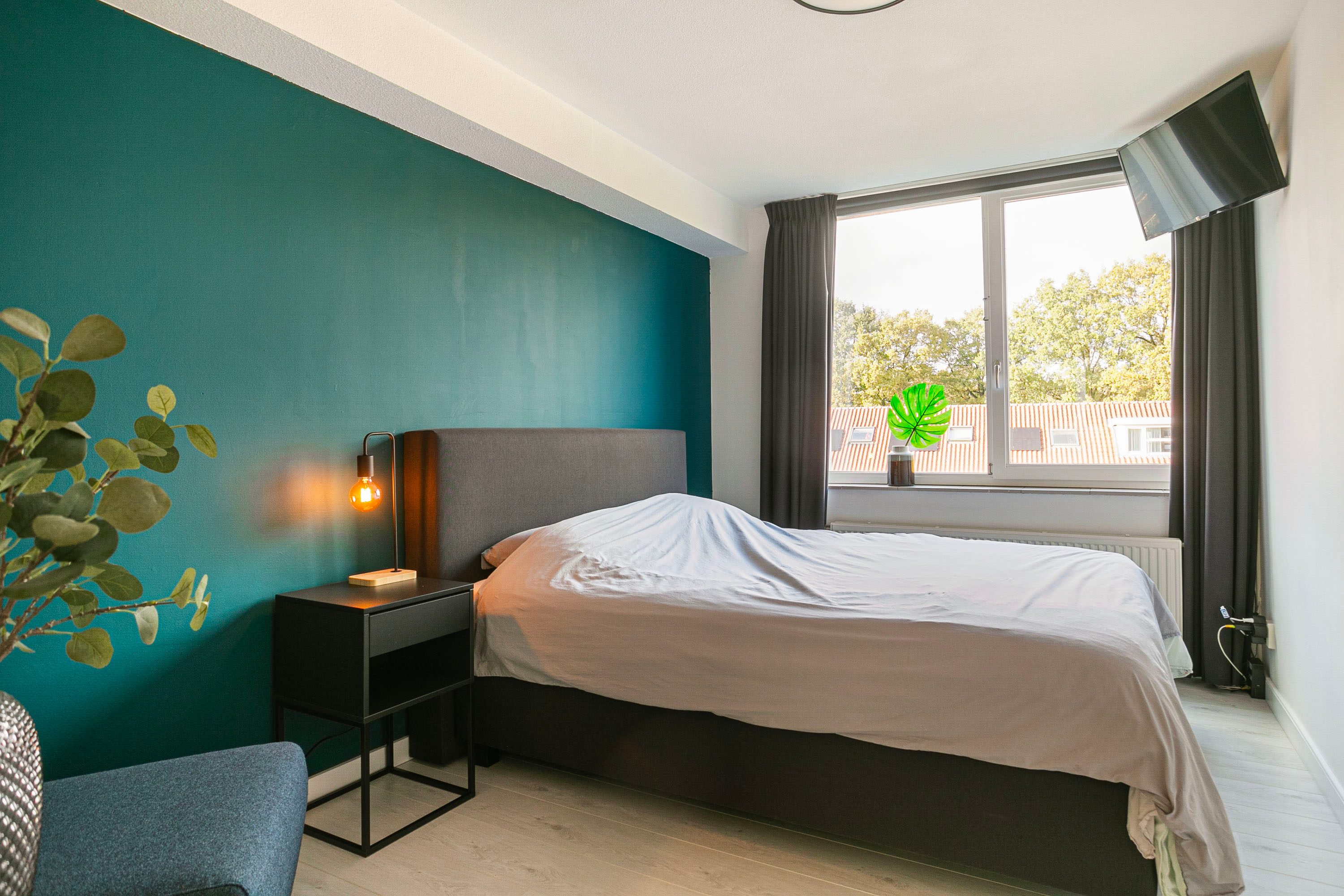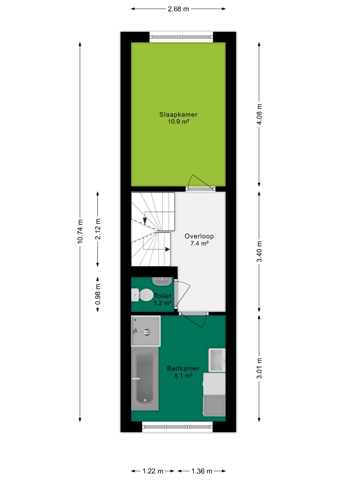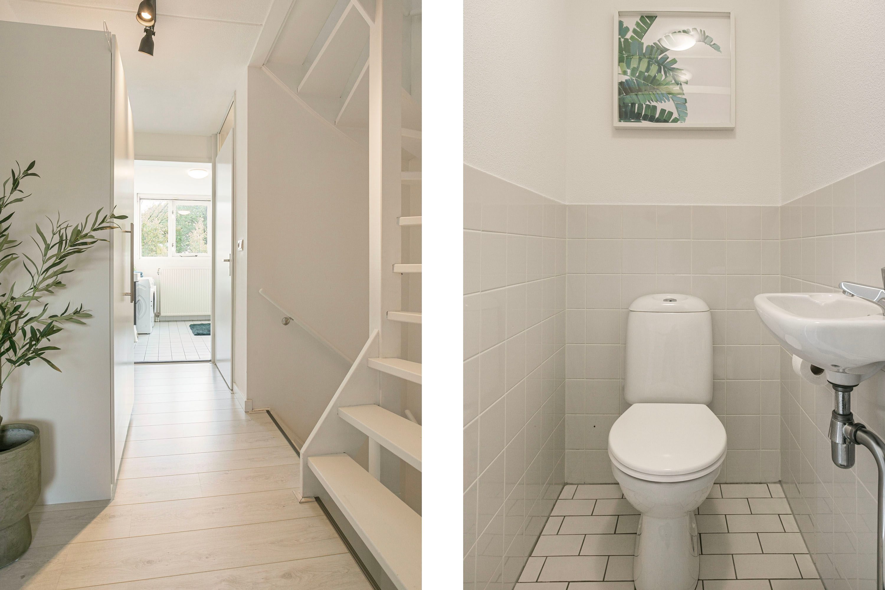 Vanaf de overloop heb je toegang tot een slaapkamer van circa 11 m² gelegen aan de rustige achterzijde. Daarnaast vind je op deze verdieping een apart toilet en de verzorgde badkamer, voorzien van een ligbad, douche en wastafelmeubel. De aansluitingen voor de wasmachine en droger zijn hier praktisch weggewerkt.