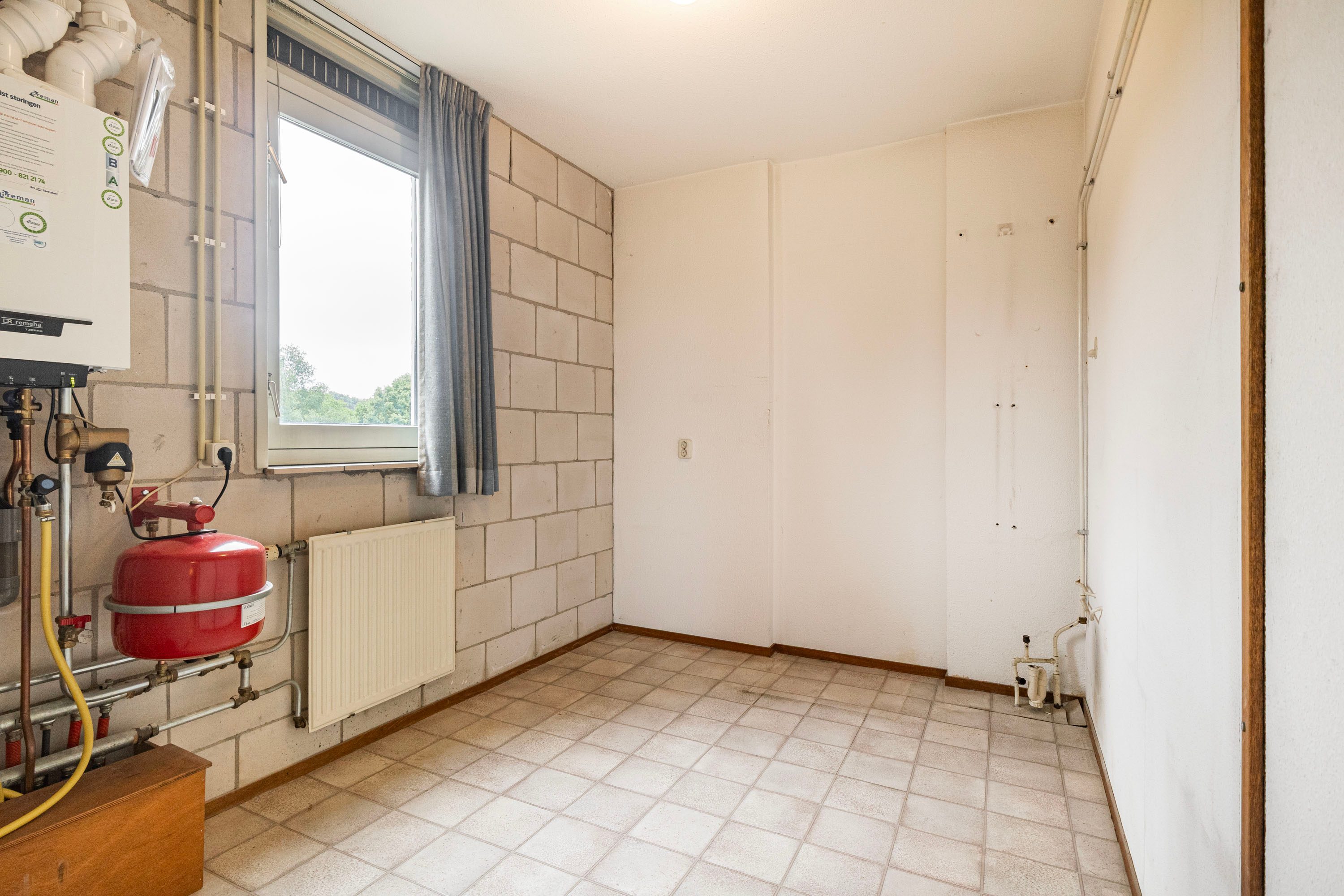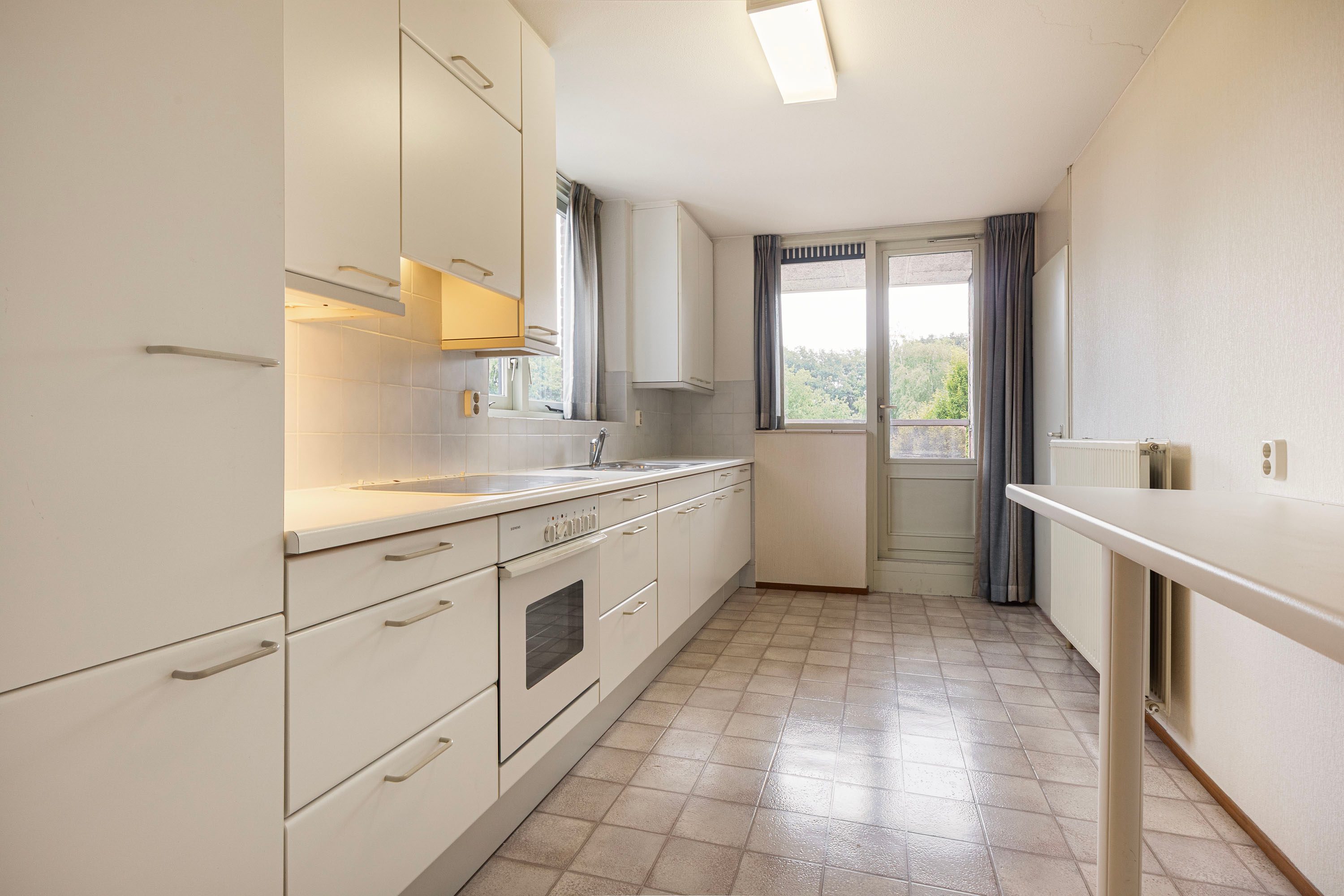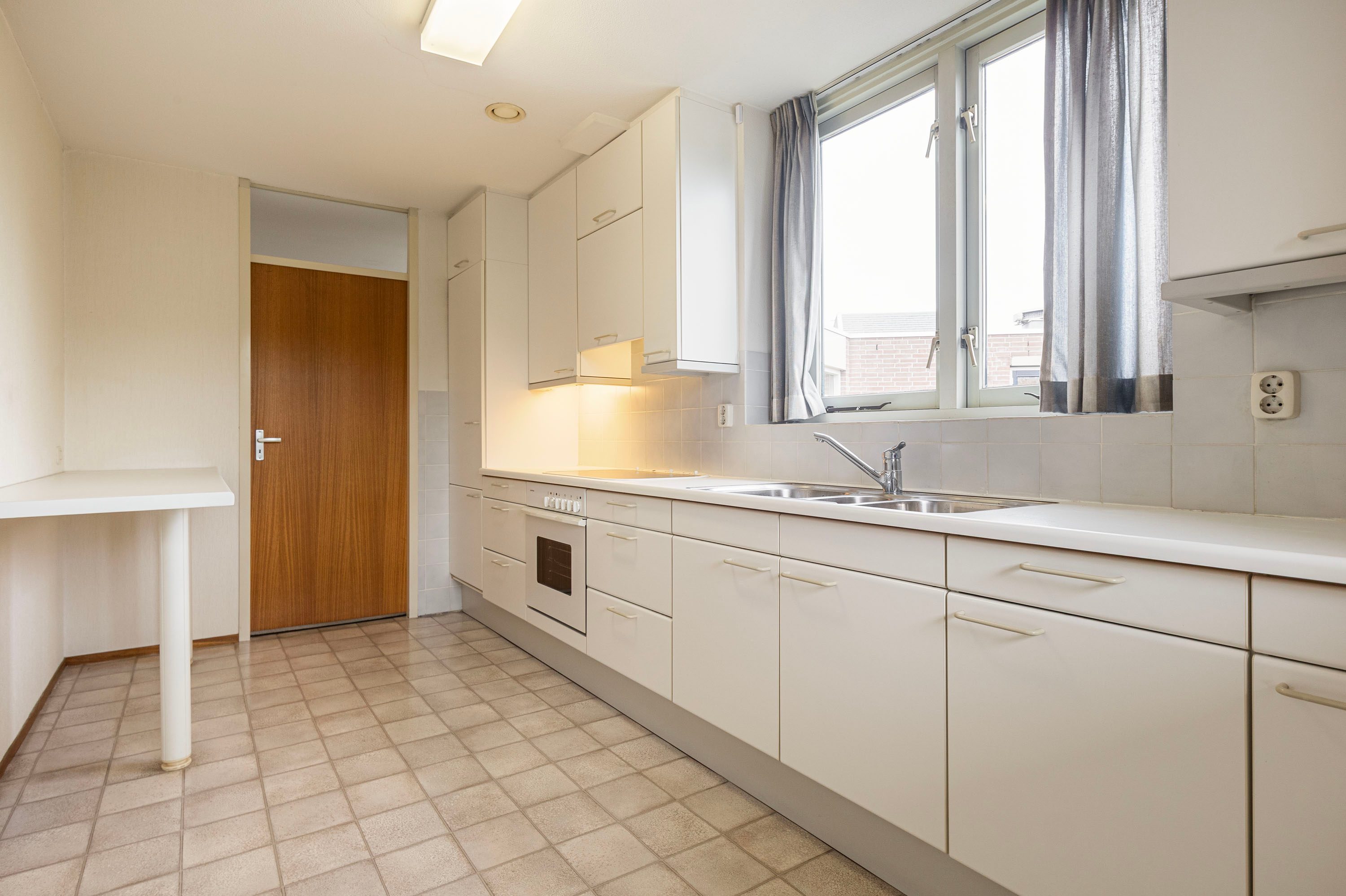 De keuken is praktisch ingericht met een elektrische kookplaat, oven en koelkast. Vanuit hier loop je door naar het tweede balkon, gelegen aan de voorzijde (noordoosten), én vanuit de keuken heb je toegang tot de bijkeuken met cv-opstelling.