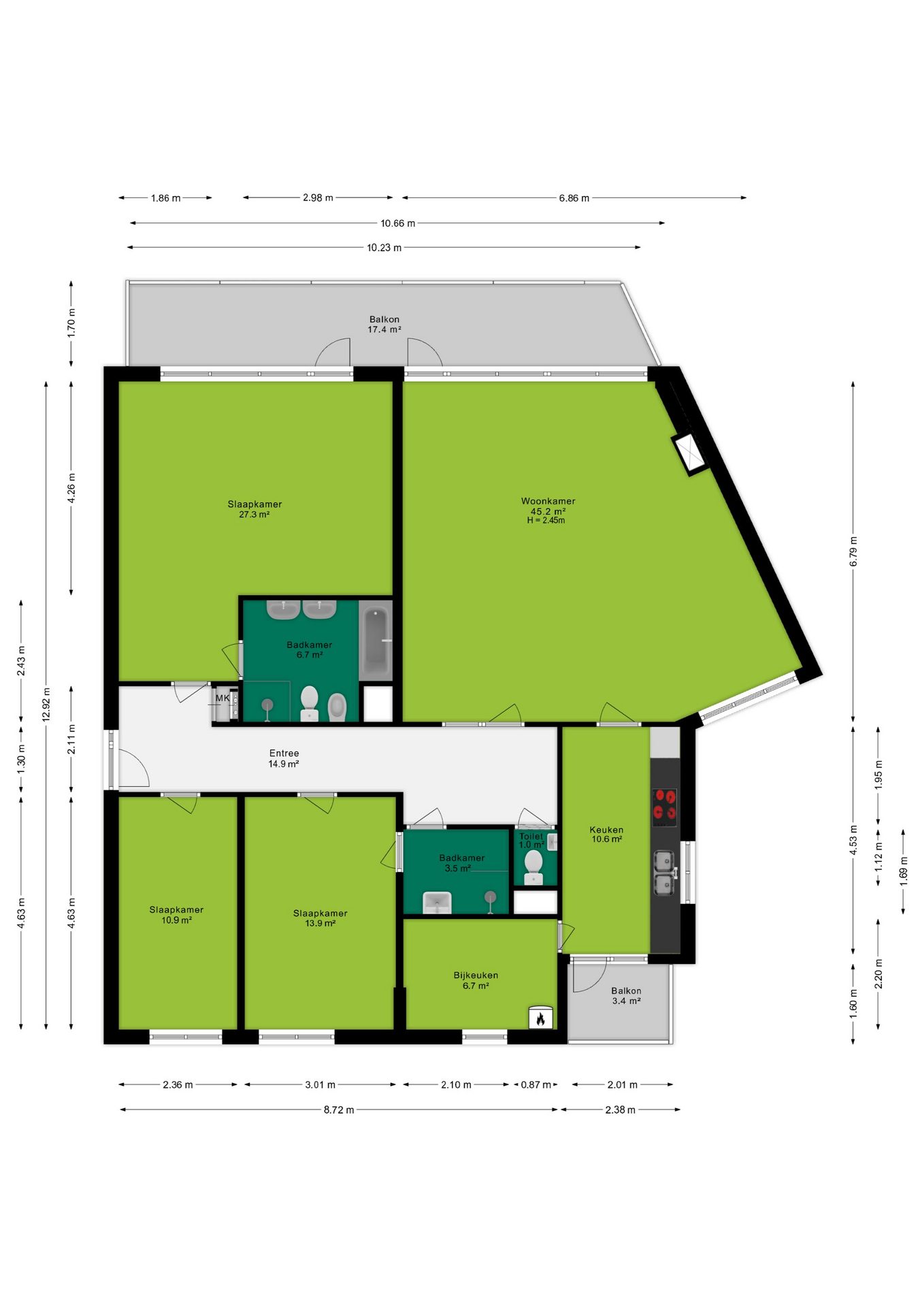 Via de centrale hal bereik je de drie slaapkamers van circa 27 m², 14 m² en 11 m². De grootste slaapkamer biedt directe toegang tot het balkon én de ruime badkamer met ligbad, dubbele wastafel, douche, toilet en bidet.