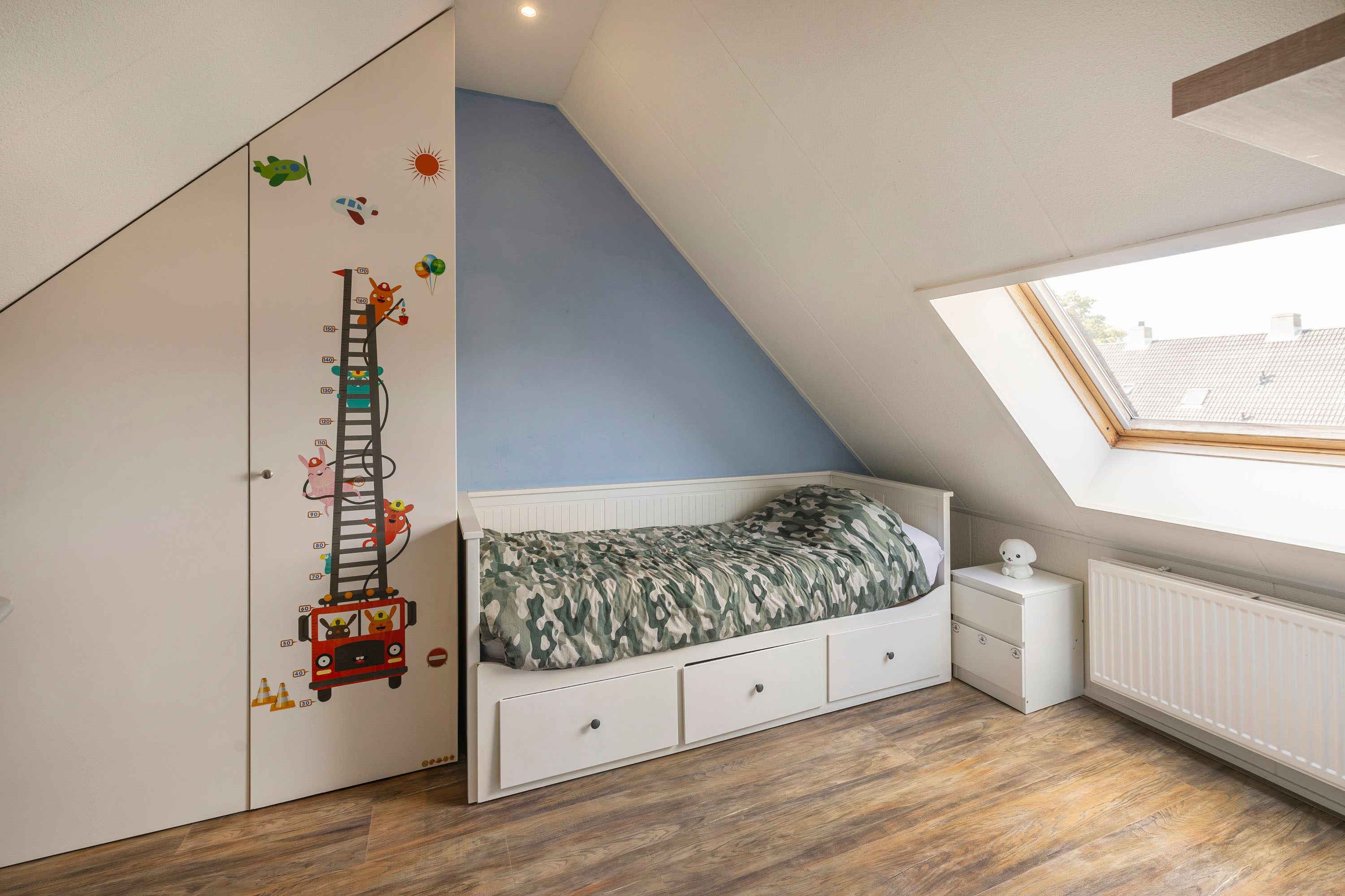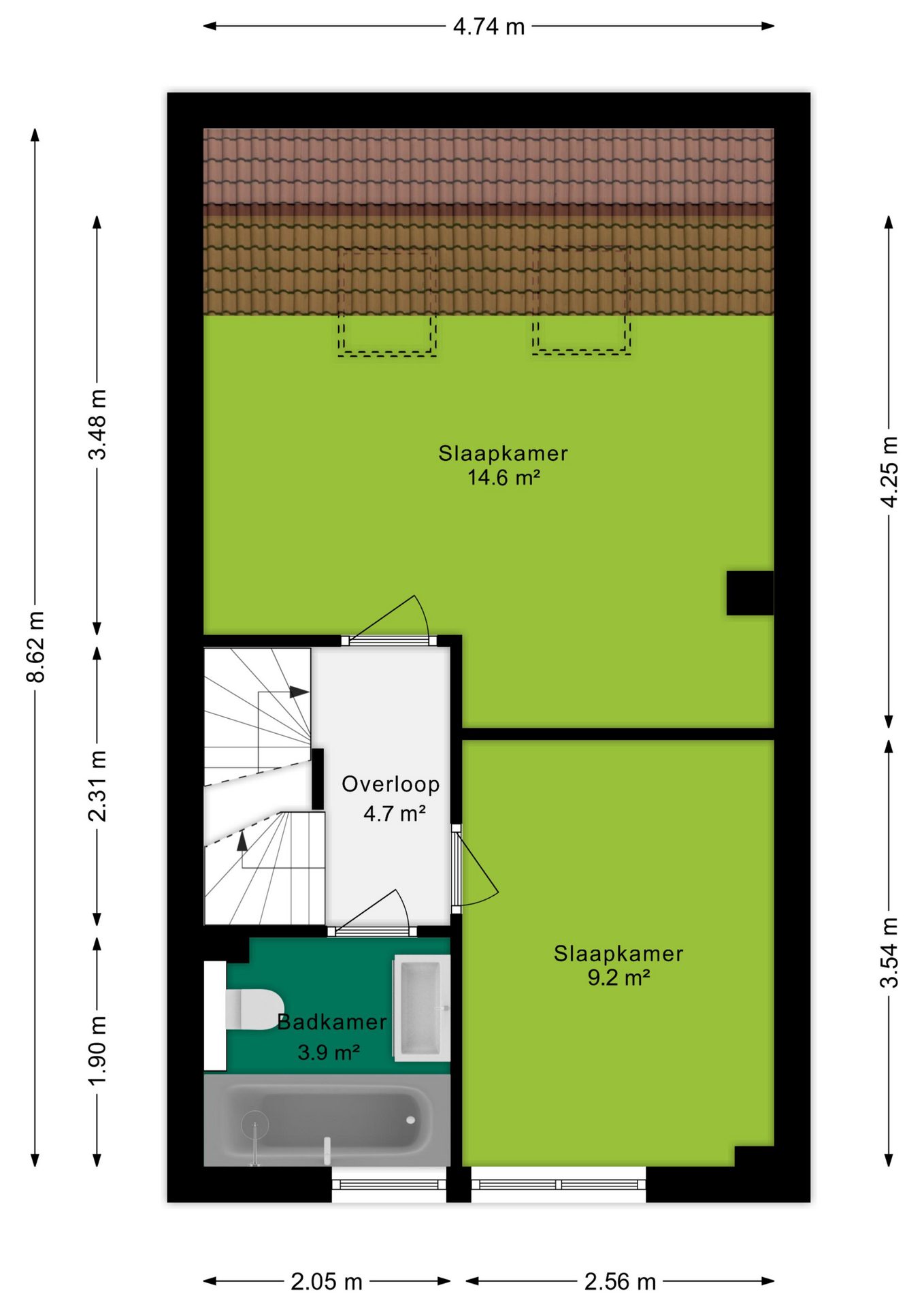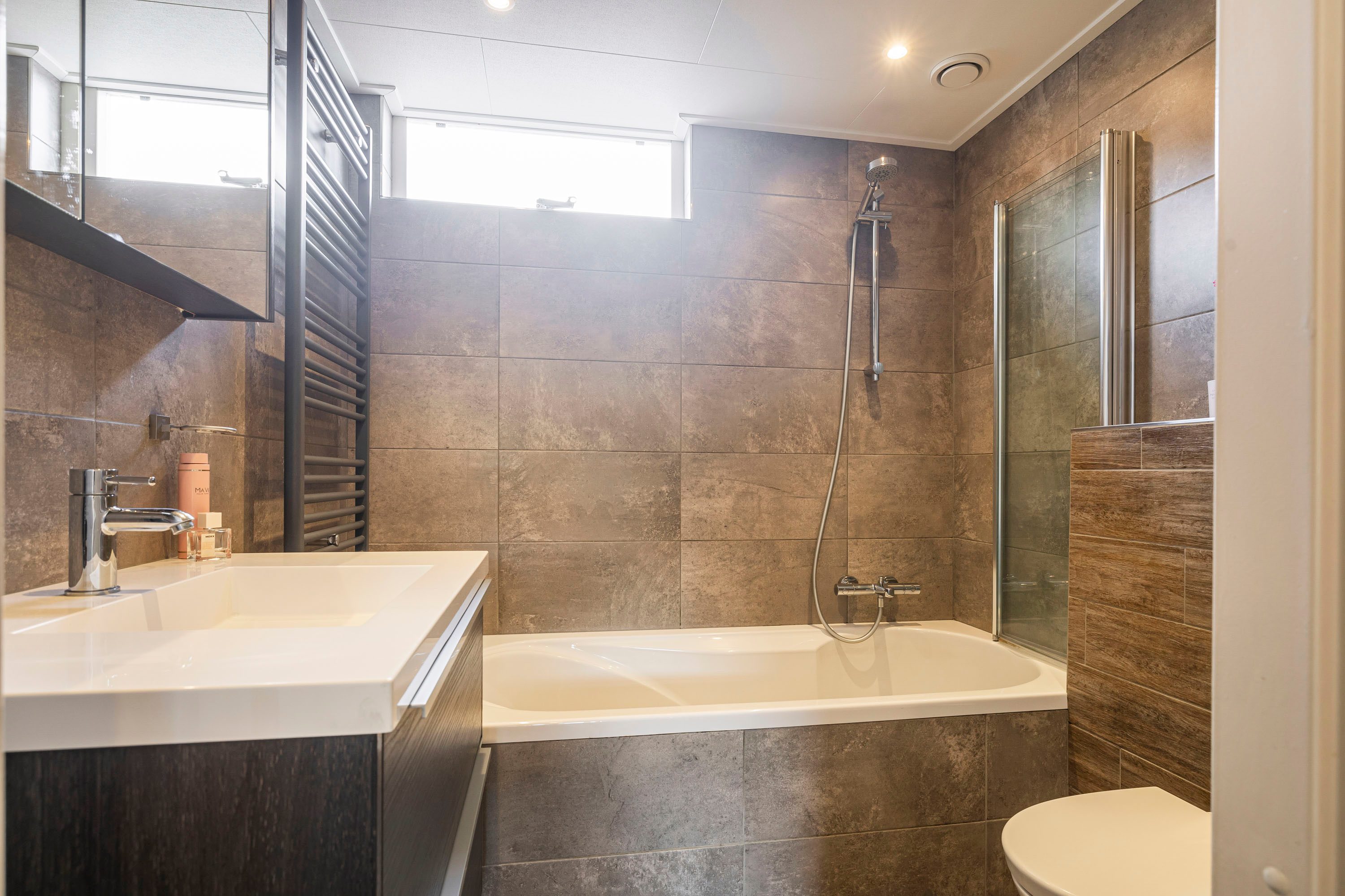 Hier vind je twee slaapkamers. De grootste slaapkamer van 14,6 m² ligt aan de achterzijde en heeft twee dakramen voor extra licht. Deze slaapkamer beschikt tevens over praktische bergruimte onder het schuine dak. De tweede slaapkamer aan de voorzijde is 9,2 m² groot. De badkamer van 3,9 m² is modern ingericht en voorzien van een ligbad met douche, zwevend toilet en wastafelmeubel.