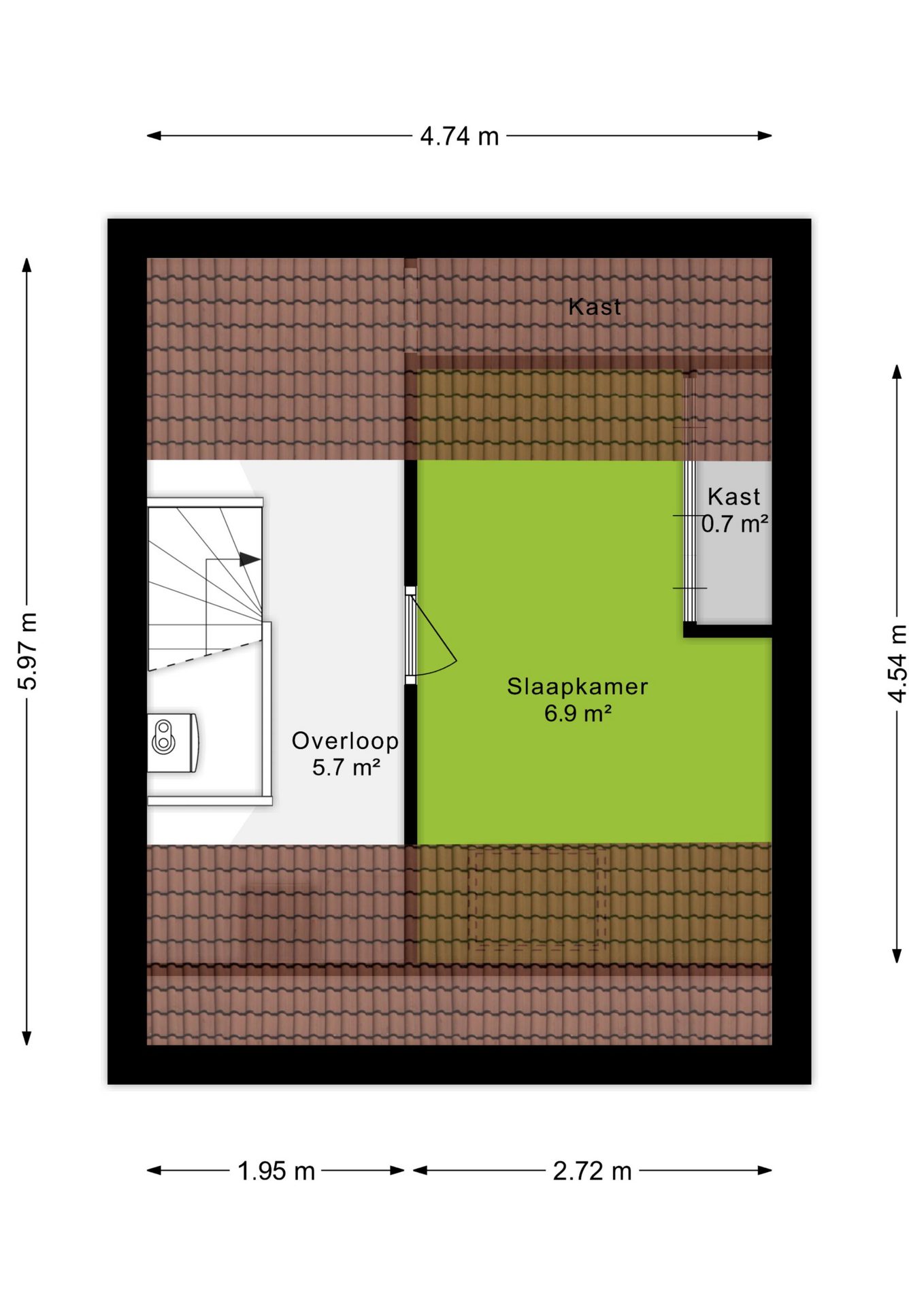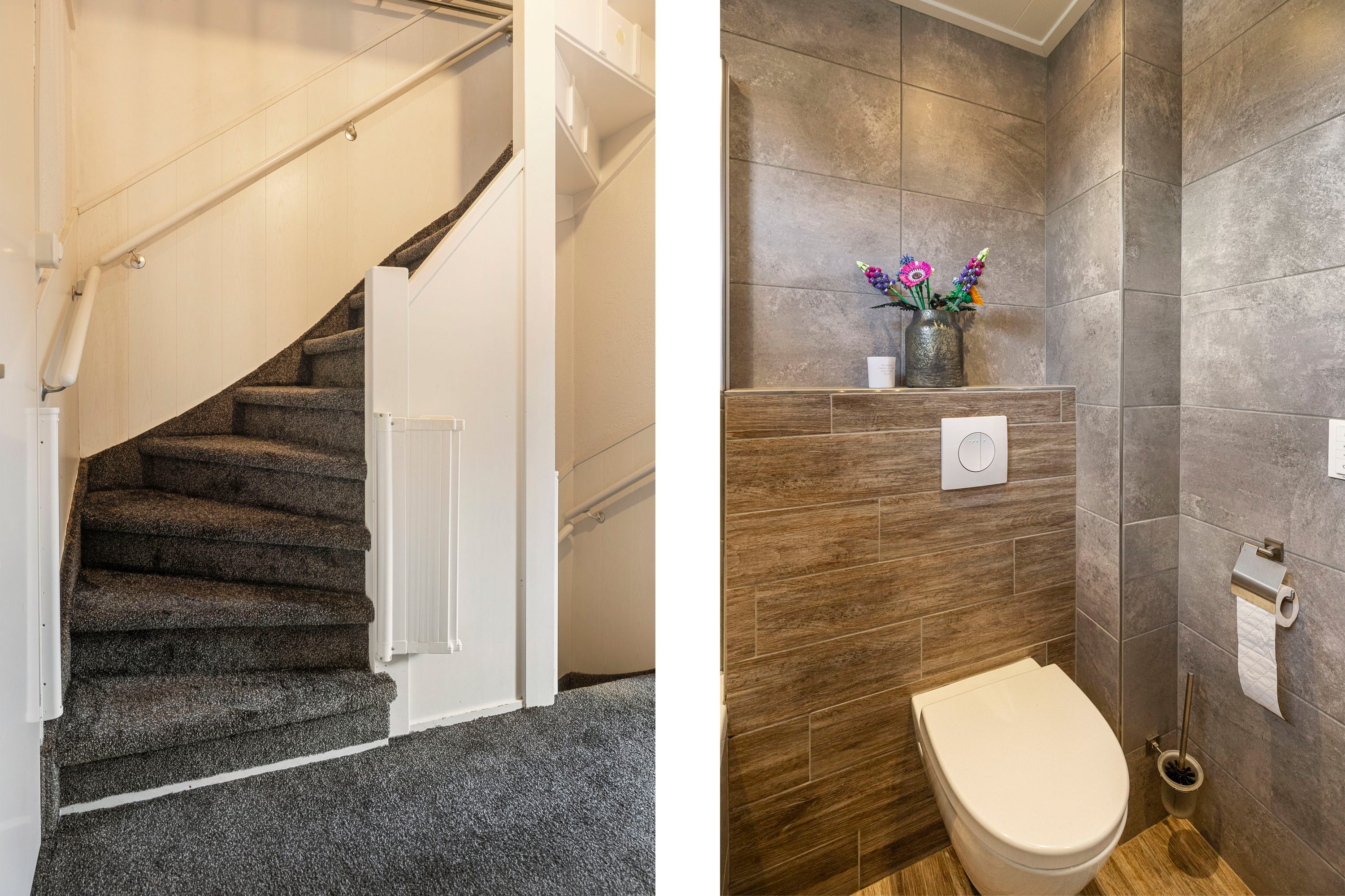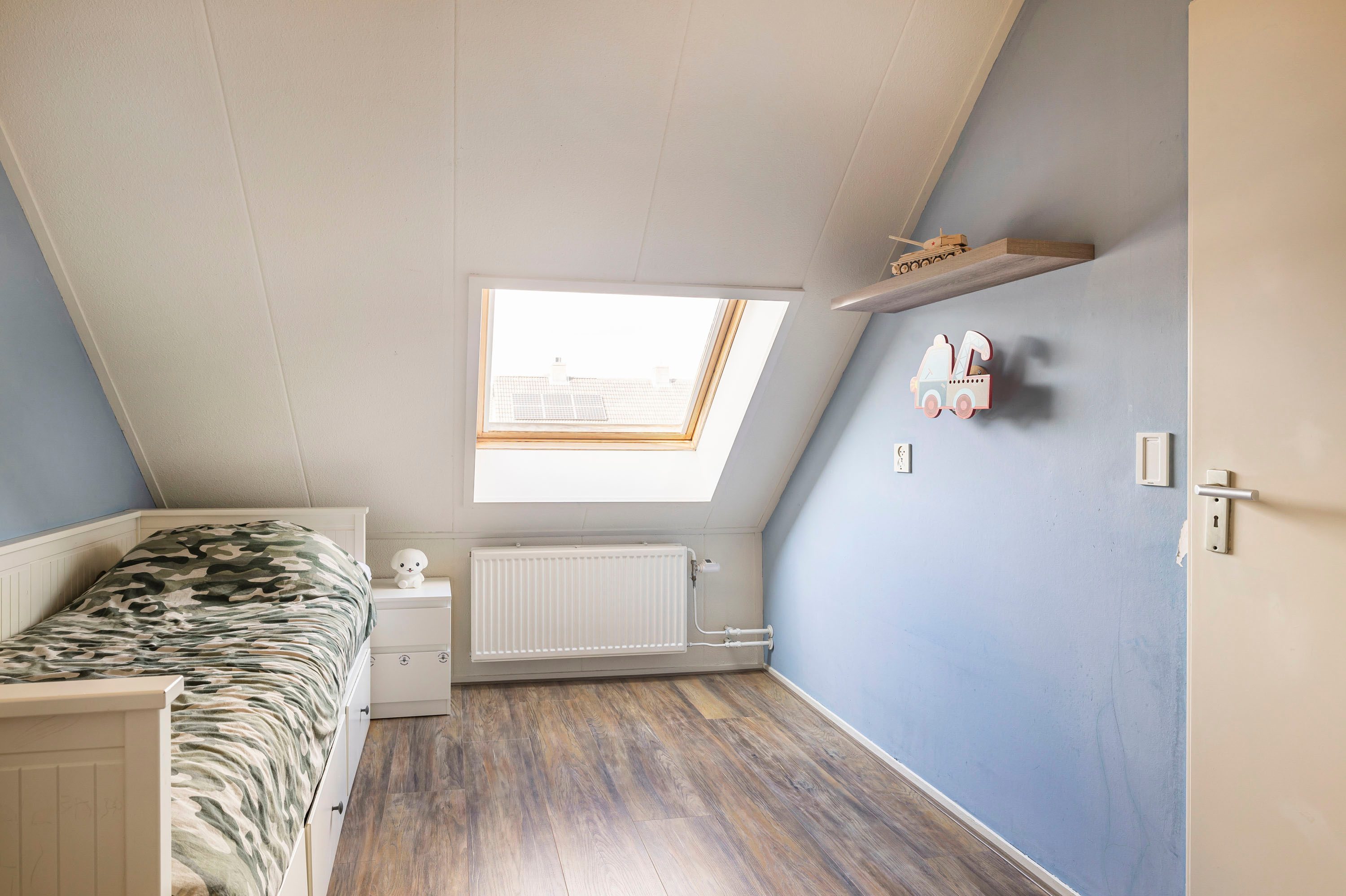 Via de vaste trap kom je op een ruime overloop van 5,7 m² met de cv-opstelling en extra bergruimte achter de schotten. Ook bevindt zich hier een derde slaapkamer van 6,9 m² met een inbouwkast.