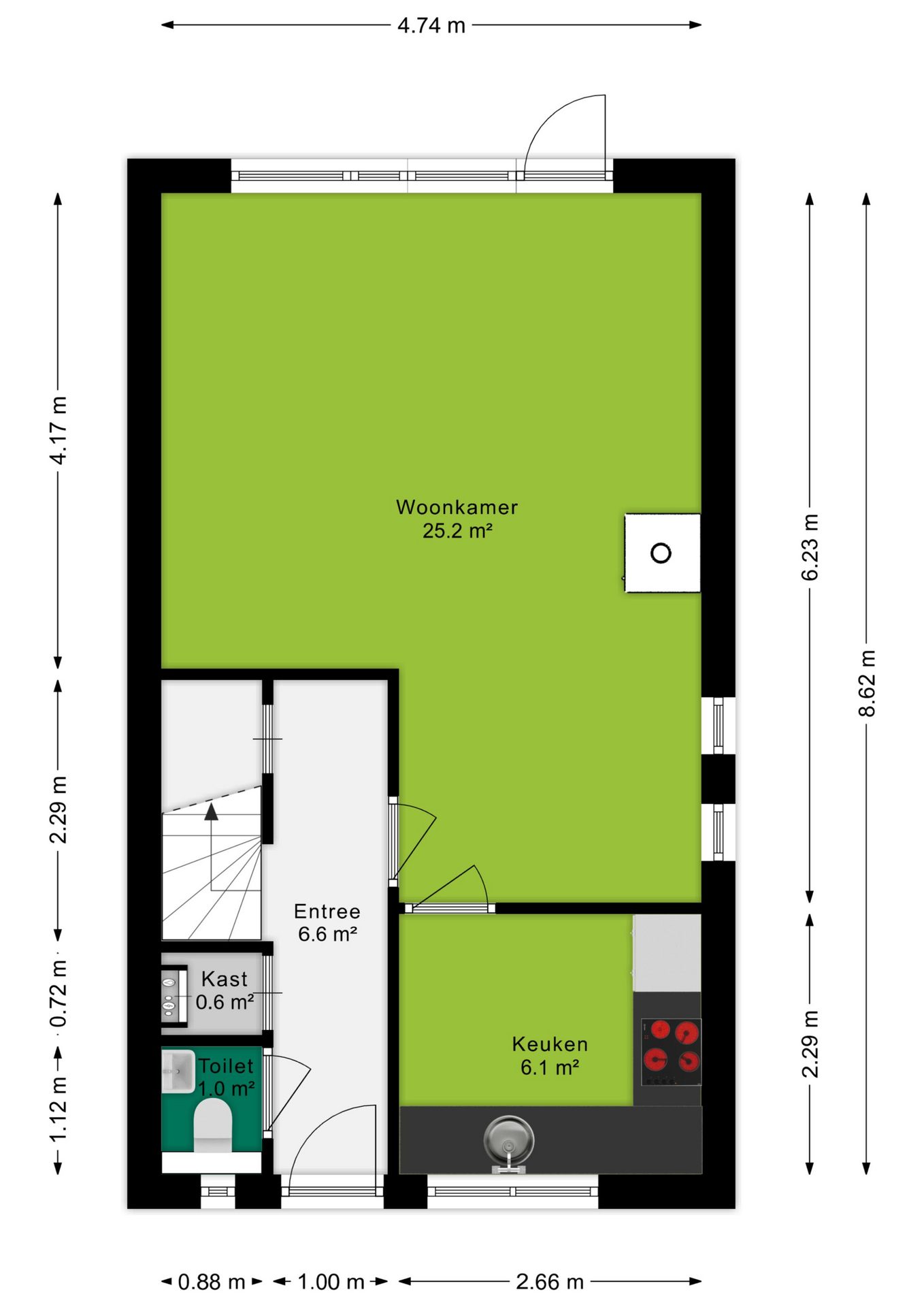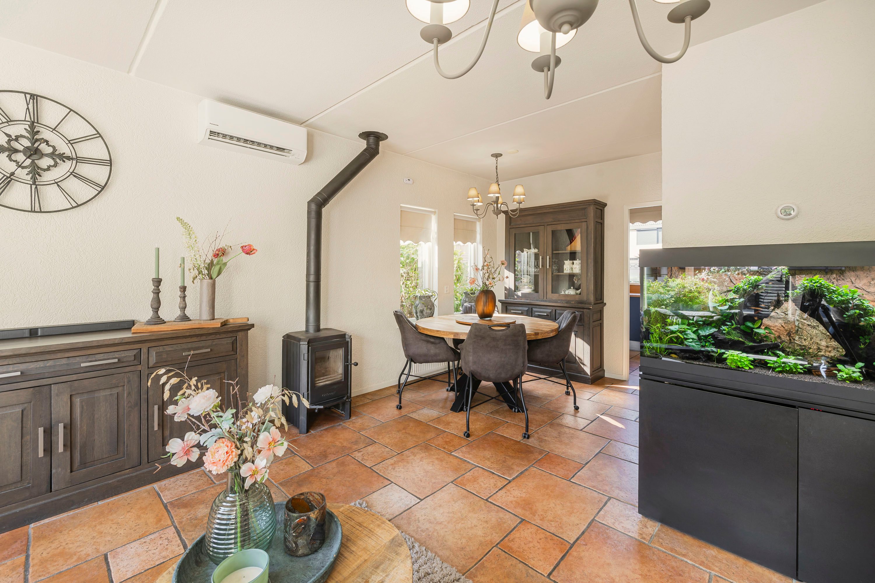 Bij binnenkomst kom je in een ruime entree van 6,6 m² met toilet, fonteintje, berging en trapopgang. Vanuit de hal bereik je de woonkamer van 25,2 m², die dankzij de grote ramen aan de achterzijde veel lichtinval heeft. De houtkachel zorgt hier voor extra sfeer. Aan de voorzijde ligt de keuken, uitgerust met een inductiekookplaat, afzuigkap, koelkast, vaatwasser en combi-oven/magnetron.