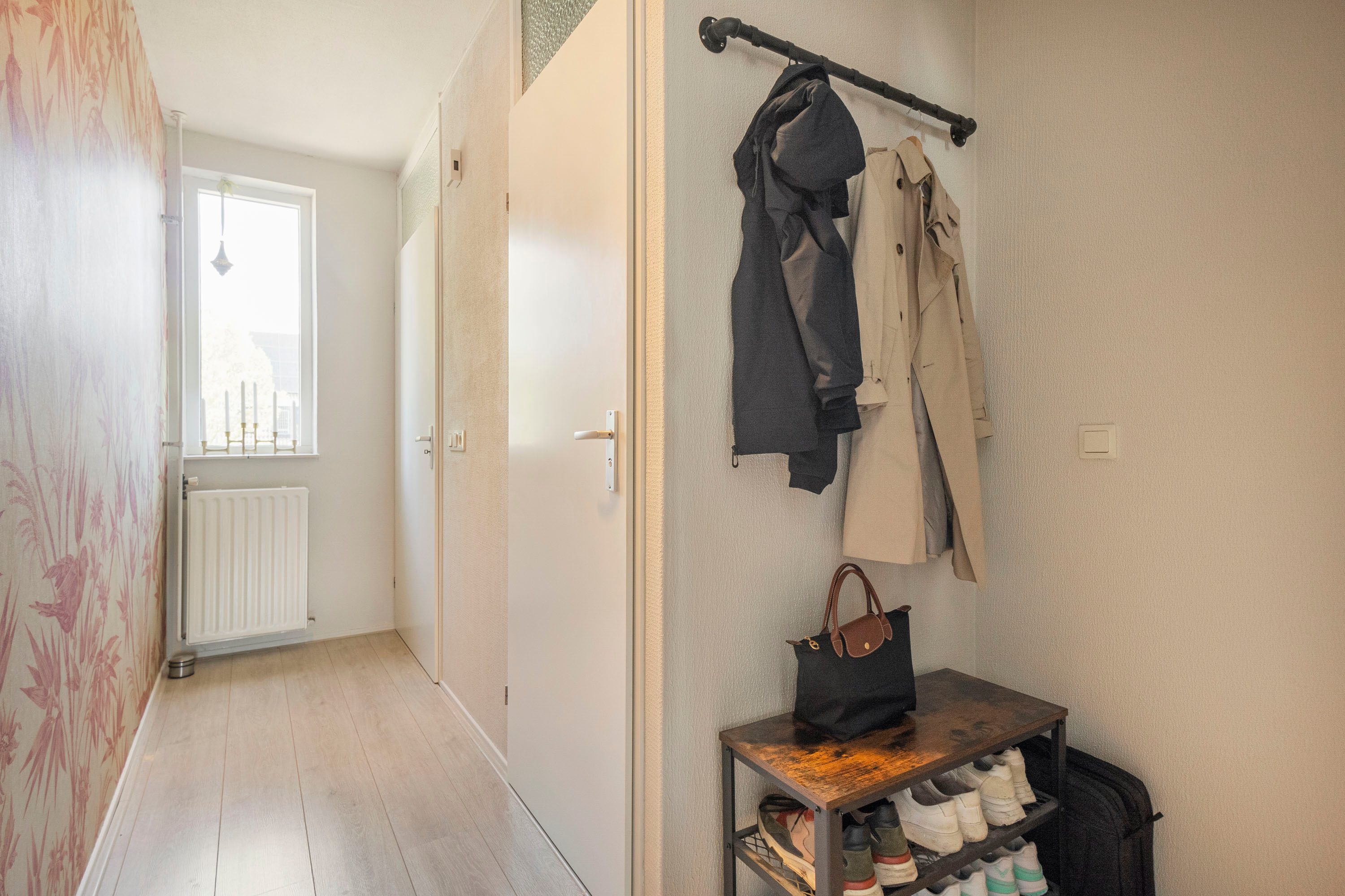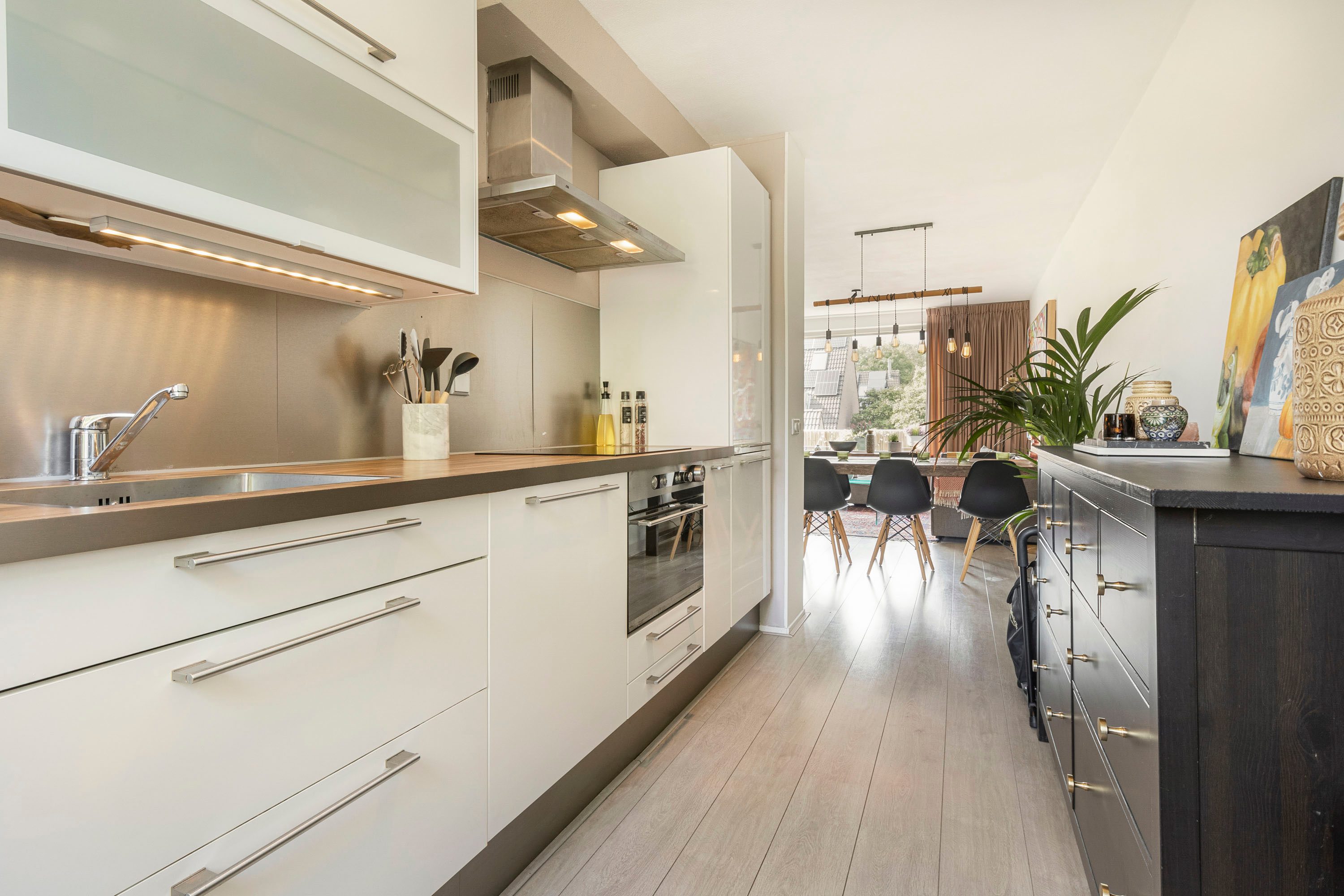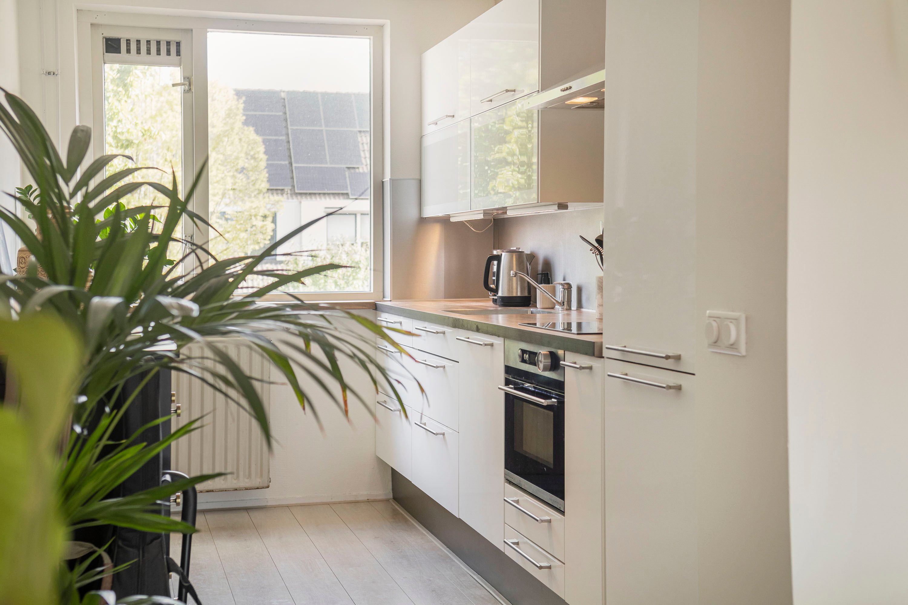 Via de eigen voordeur op de begane grond bereik je de trap naar boven. In de hal vind je het toilet en de trapopgang. De lichte woonkamer, met een royaal raampartij aan de achterzijde, biedt toegang tot het balkon. Centraal ligt het eetgedeelte met ruimte voor een grote eettafel. De keuken met hoogglans witte kasten is voorzien van diverse inbouwapparatuur zoals: de kookplaat, afzuigkap, combi-oven, koel-vriescombinatie en vaatwasser.