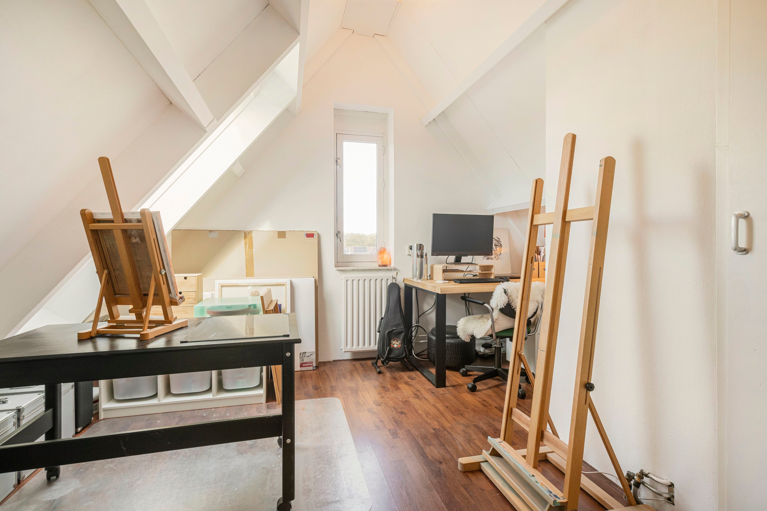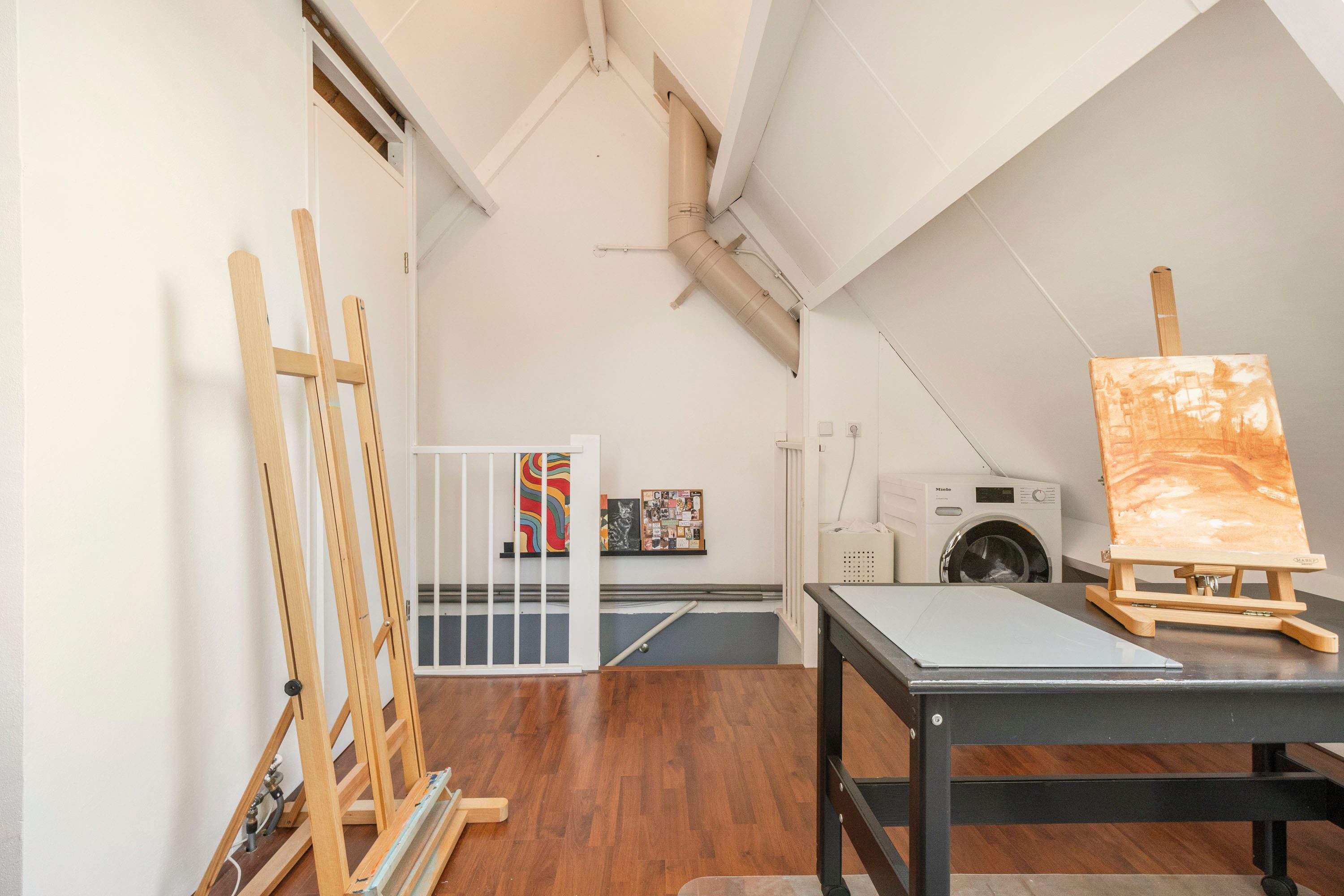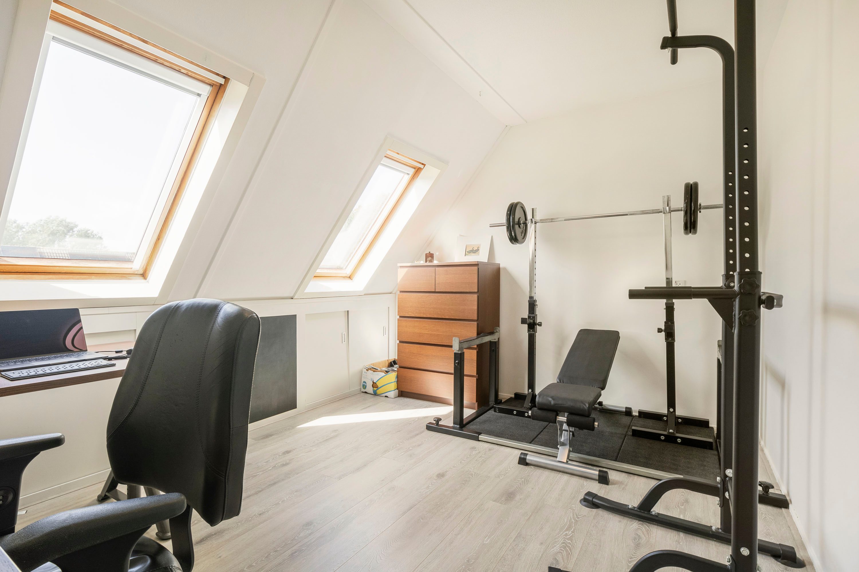 Via de vaste trap kom je op de zolderverdieping met een derde kamer van 11,1 m², geschikt als slaap-, werk- of sportruimte. Een dakraam op het westen en een raam aan de noordzijde zorgen voor een fijne lichtinval. Verder bevindt zich hier ook de C.V.-ketel en de aansluiting voor de wasmachine.