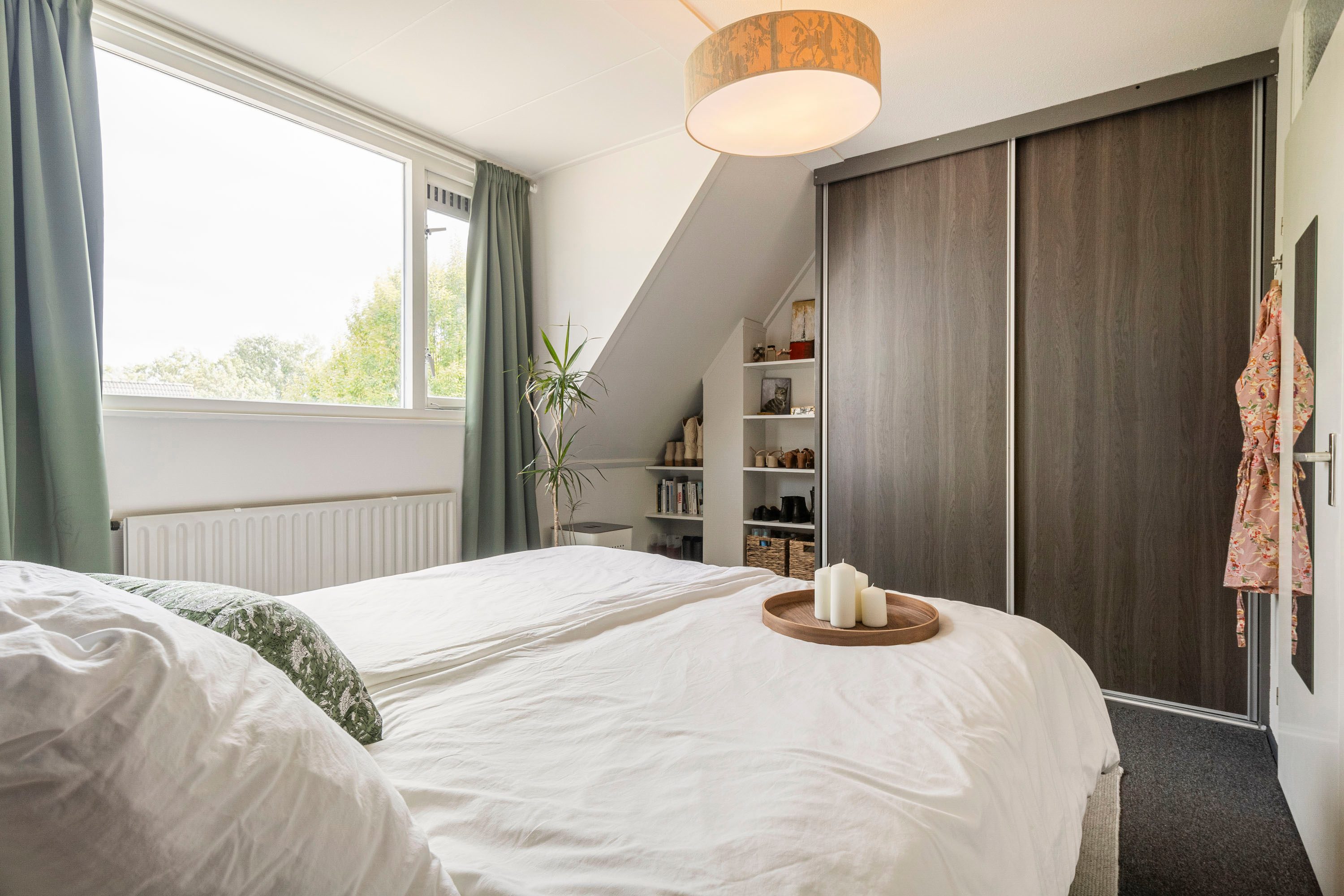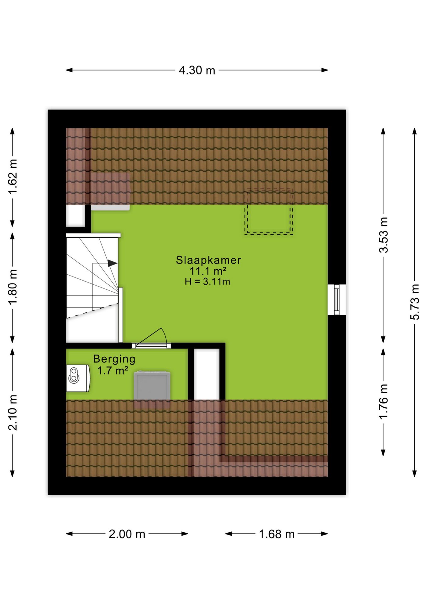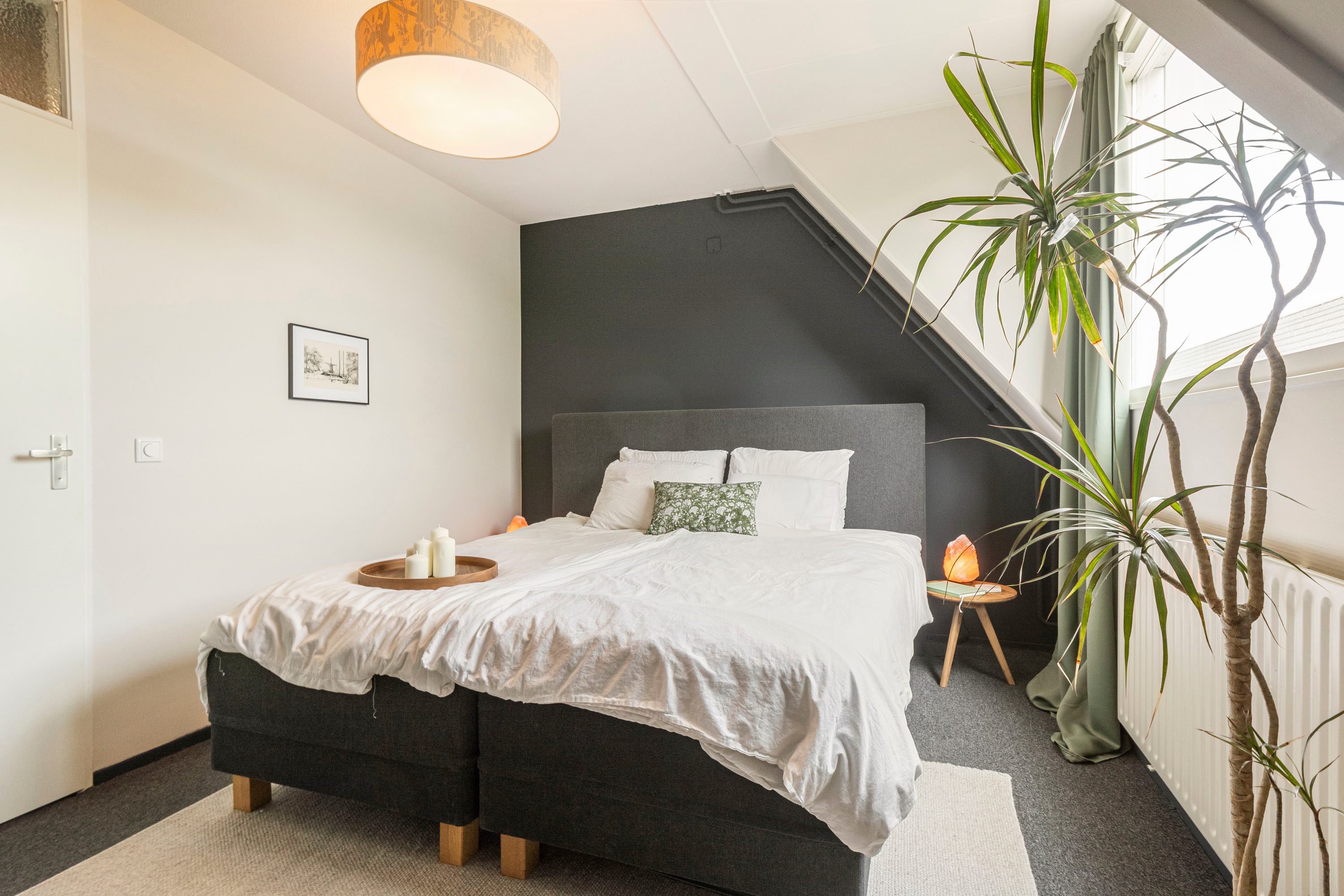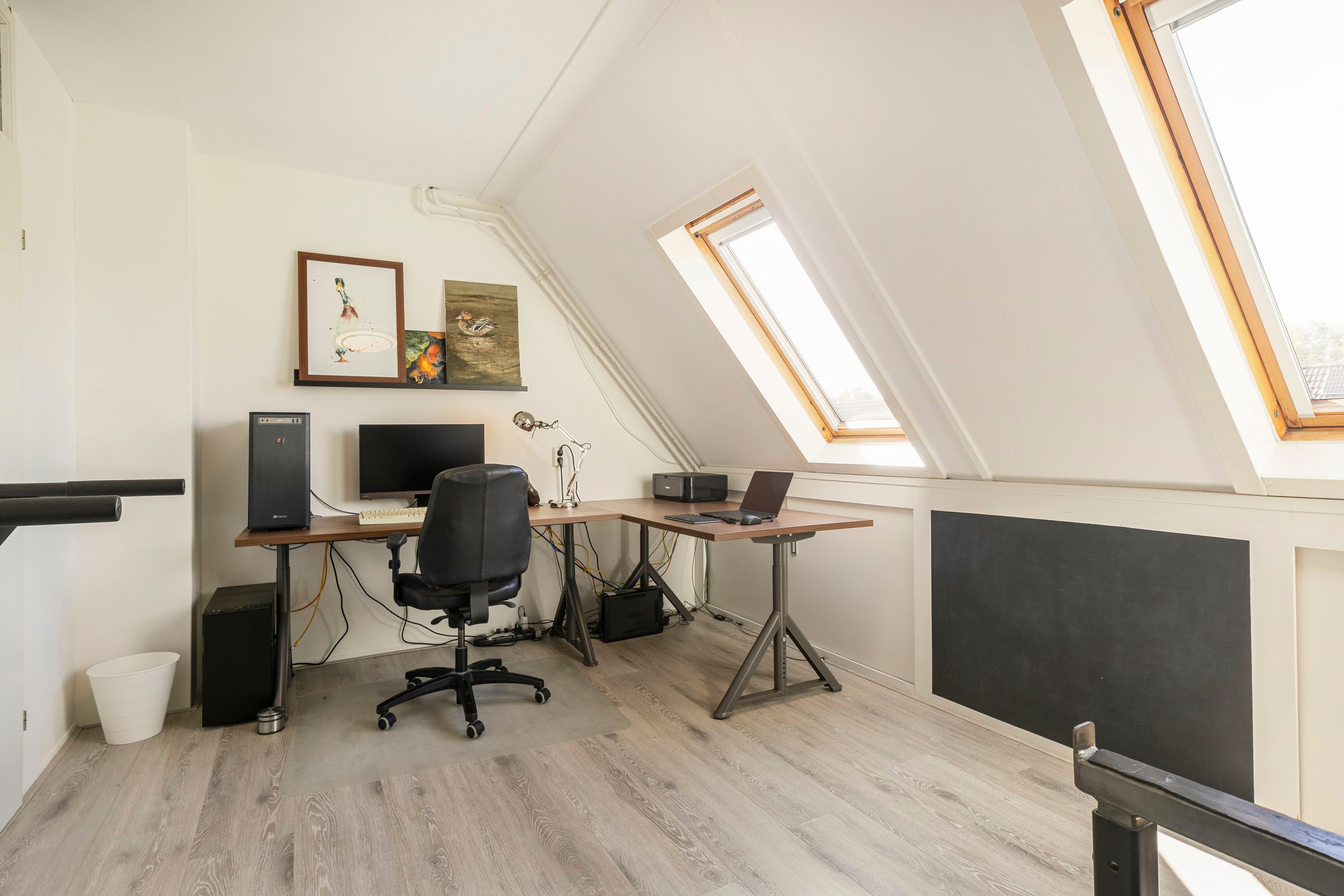 Via de vaste trap kom je op de zolderverdieping met een derde kamer van 11,1 m², geschikt als slaap-, werk- of sportruimte. Een dakraam op het westen en een raam aan de noordzijde zorgen voor een fijne lichtinval. Verder bevindt zich hier ook de C.V.-ketel en de aansluiting voor de wasmachine.