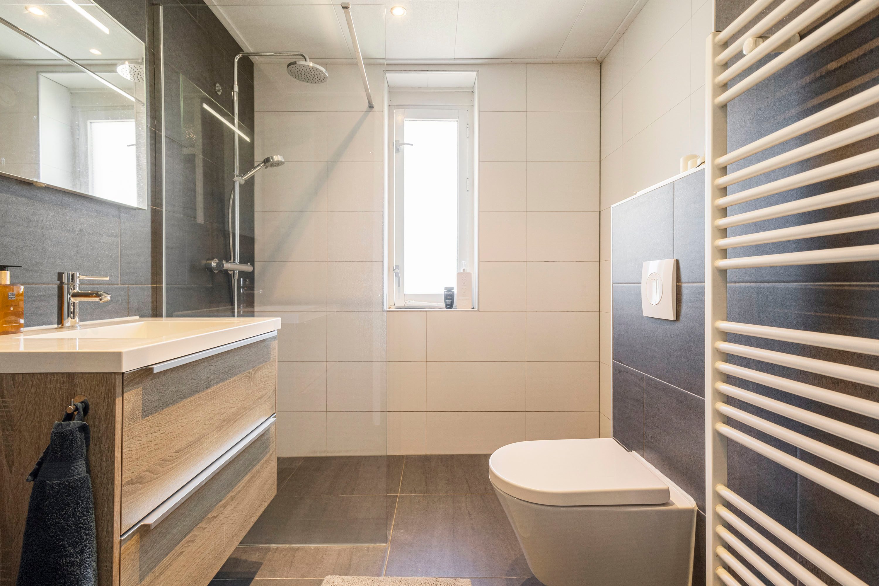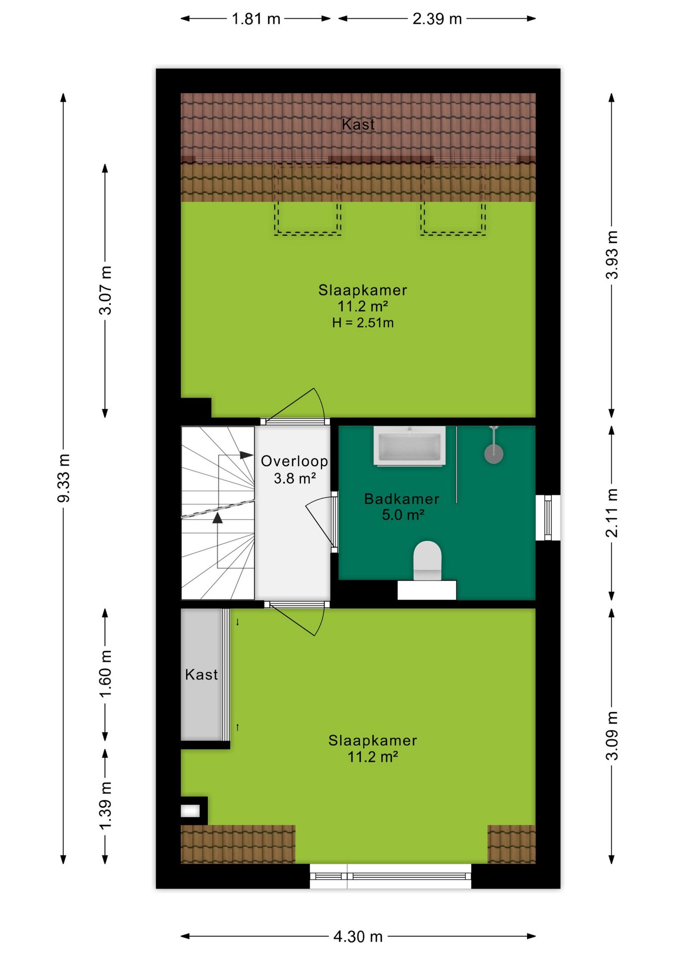 Door middel van de vaste trap kom je op de tweede verdieping. Hier liggen twee slaapkamers van ieder 11,2 m². De kamer aan de voorzijde heeft een dakkapel en een inbouwkast; de kamer aan de achterzijde beschikt over twee dakramen en knieschotten. De moderne badkamer is uitgerust met een ruim wastafelmeubel, toilet en inloopdouche. Een te openen raam aan de noordzijde zorgt voor natuurlijke ventilatie.
