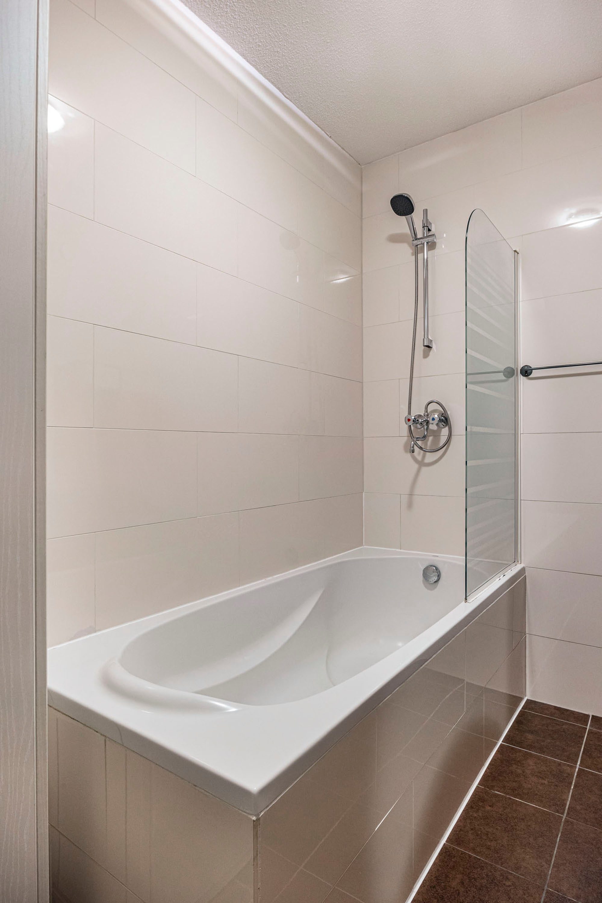 Vanuit de hal bereik je de grote slaapkamer van ca. 16 m². De badkamer is volledig betegeld en uitgerust met: