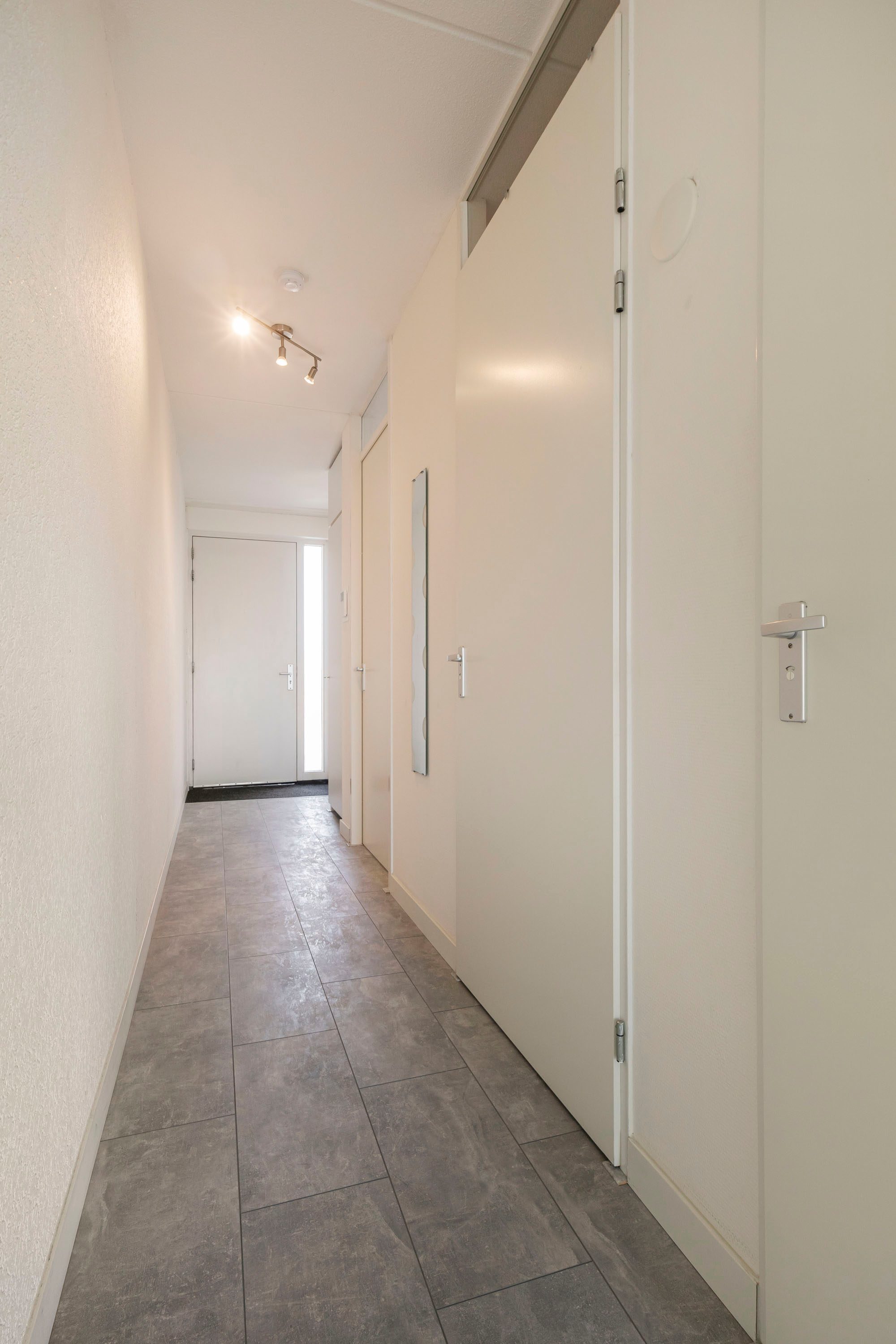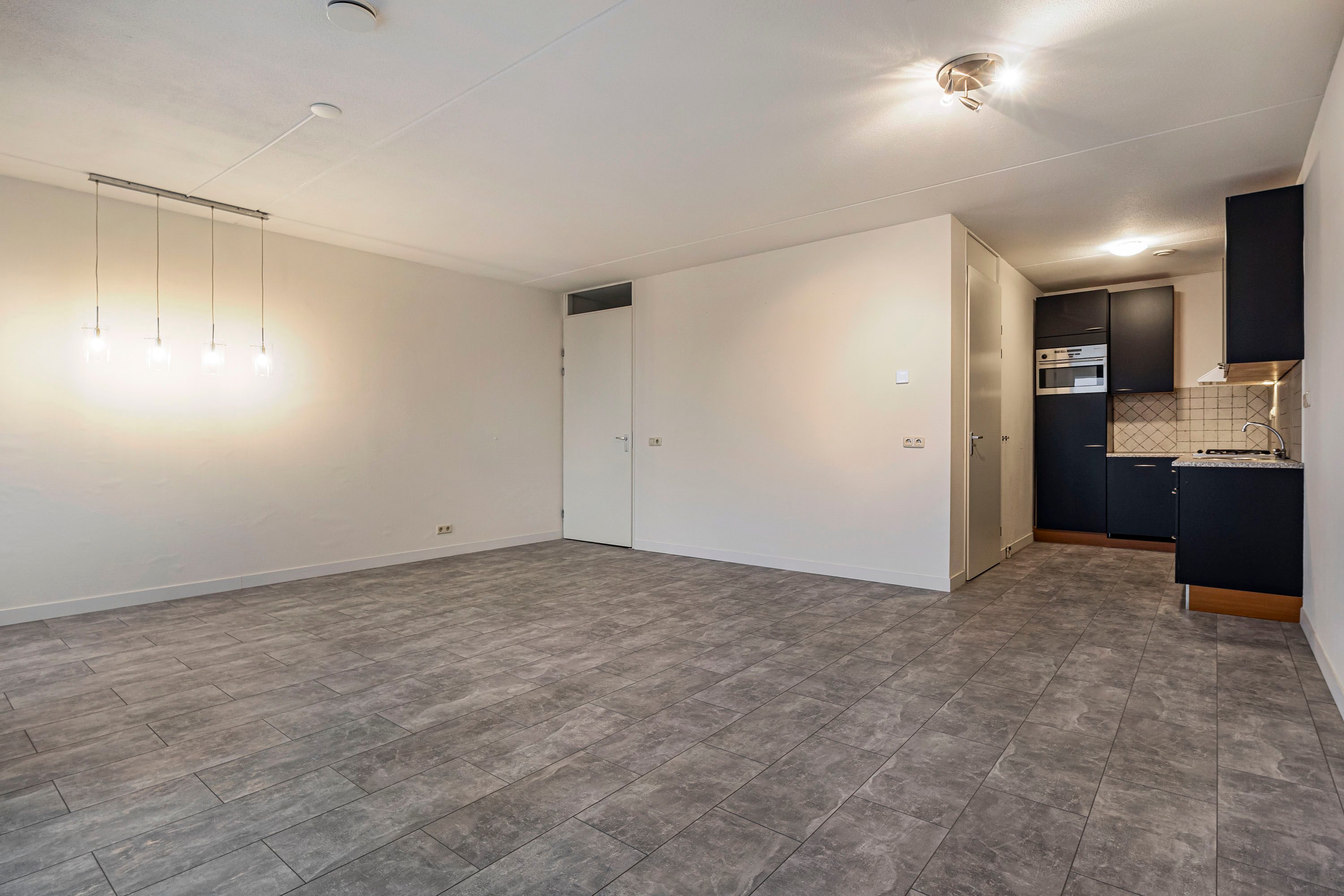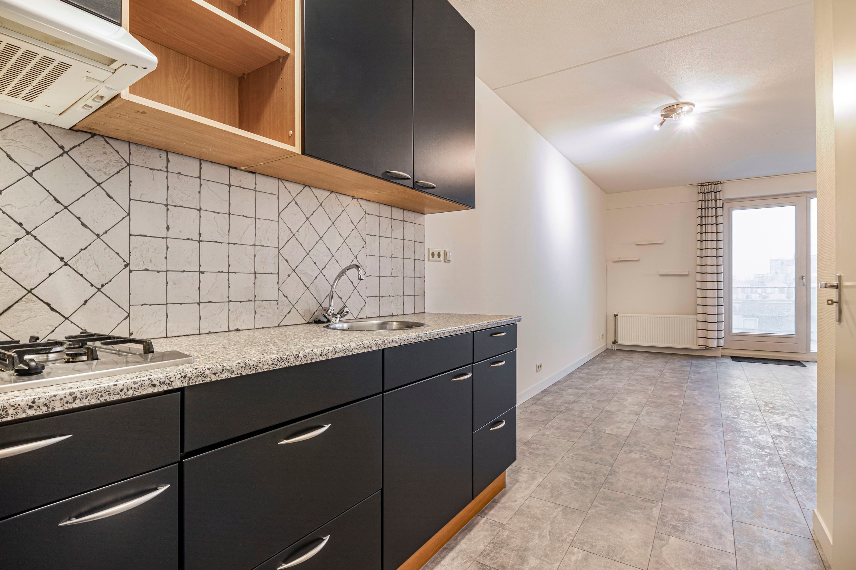 Bij binnenkomst kom je in een ruime hal met videofoon-installatie, toiletruimte met hangend toilet en fonteintje, en toegang tot alle vertrekken. De lichte woonkamer is royaal opgezet en geeft via een draai-/kiepdeur toegang tot het balkon. Je kijkt vanuit de woonkamer en vanaf het balkon prettig weg door de hoogte van het appartement.