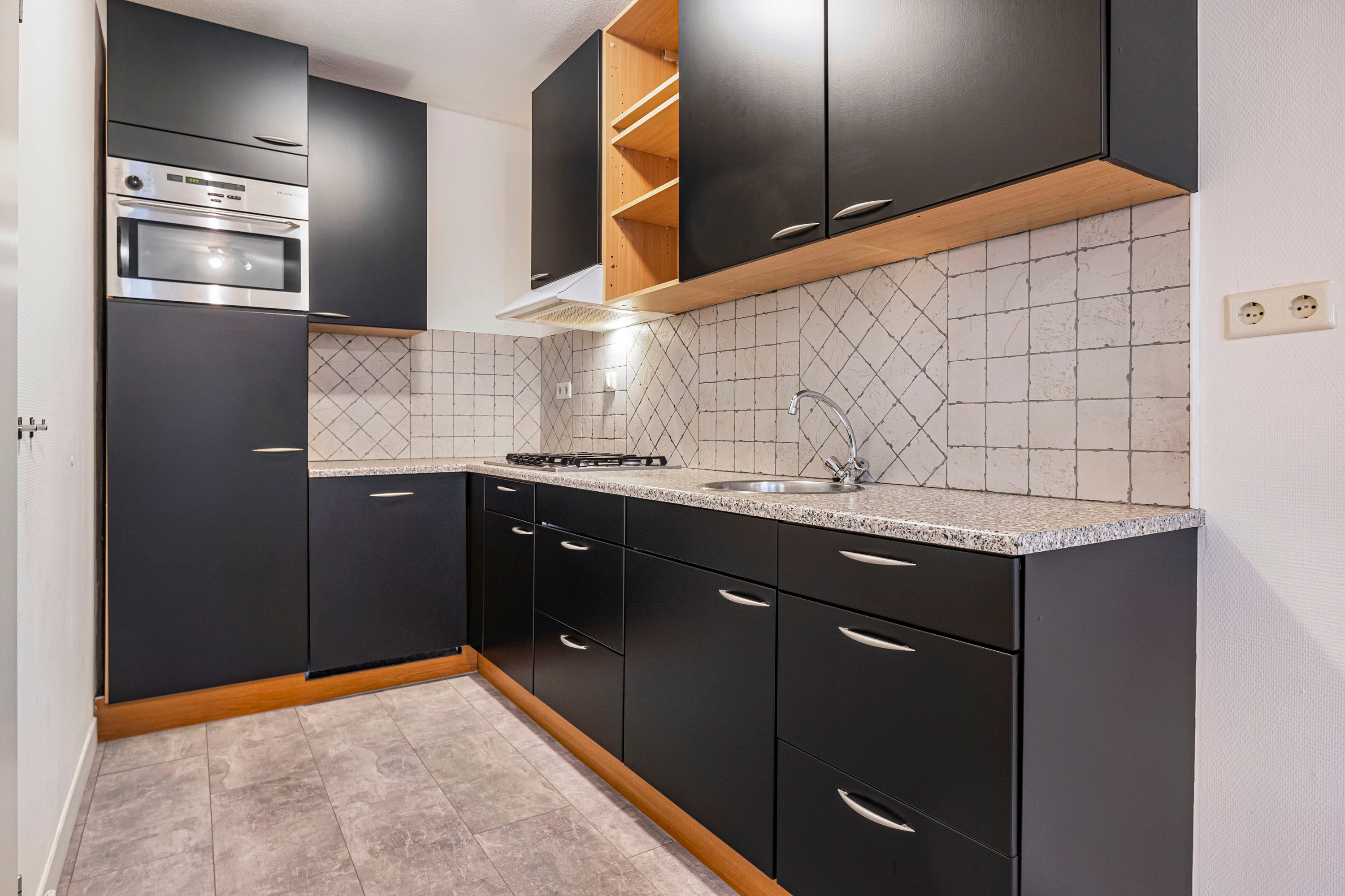 De open keuken is uitgevoerd in een L-opstelling en voorzien van diverse inbouwapparatuur. In een aparte kast vind je de opstelling van de cv-ketel, wasmachineaansluiting, de balansventilatie en extra bergruimte.