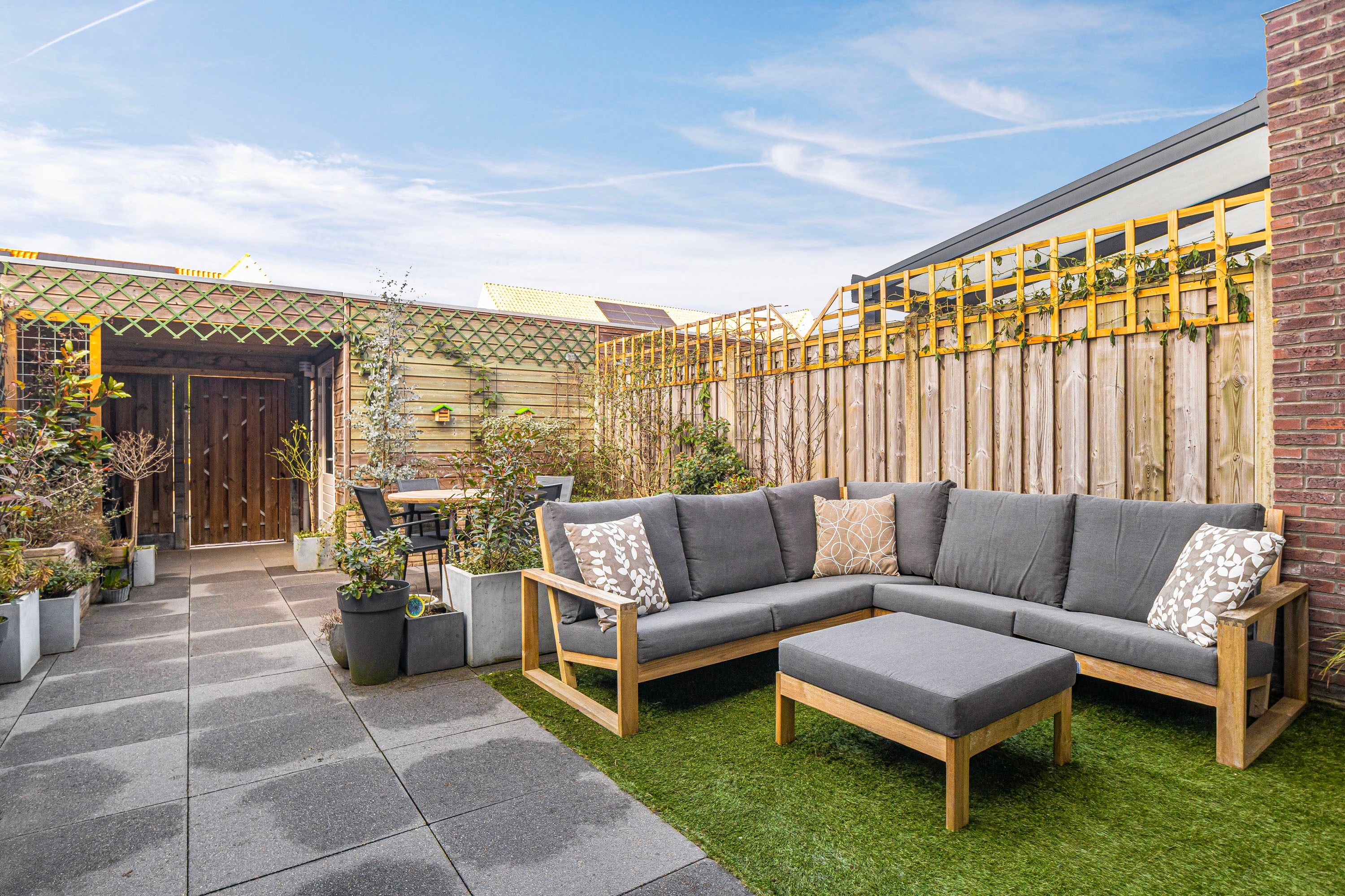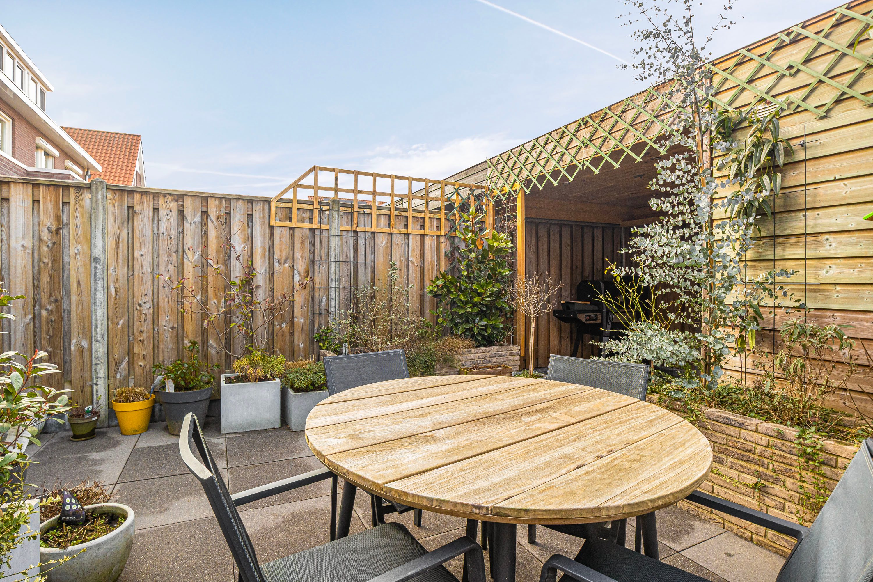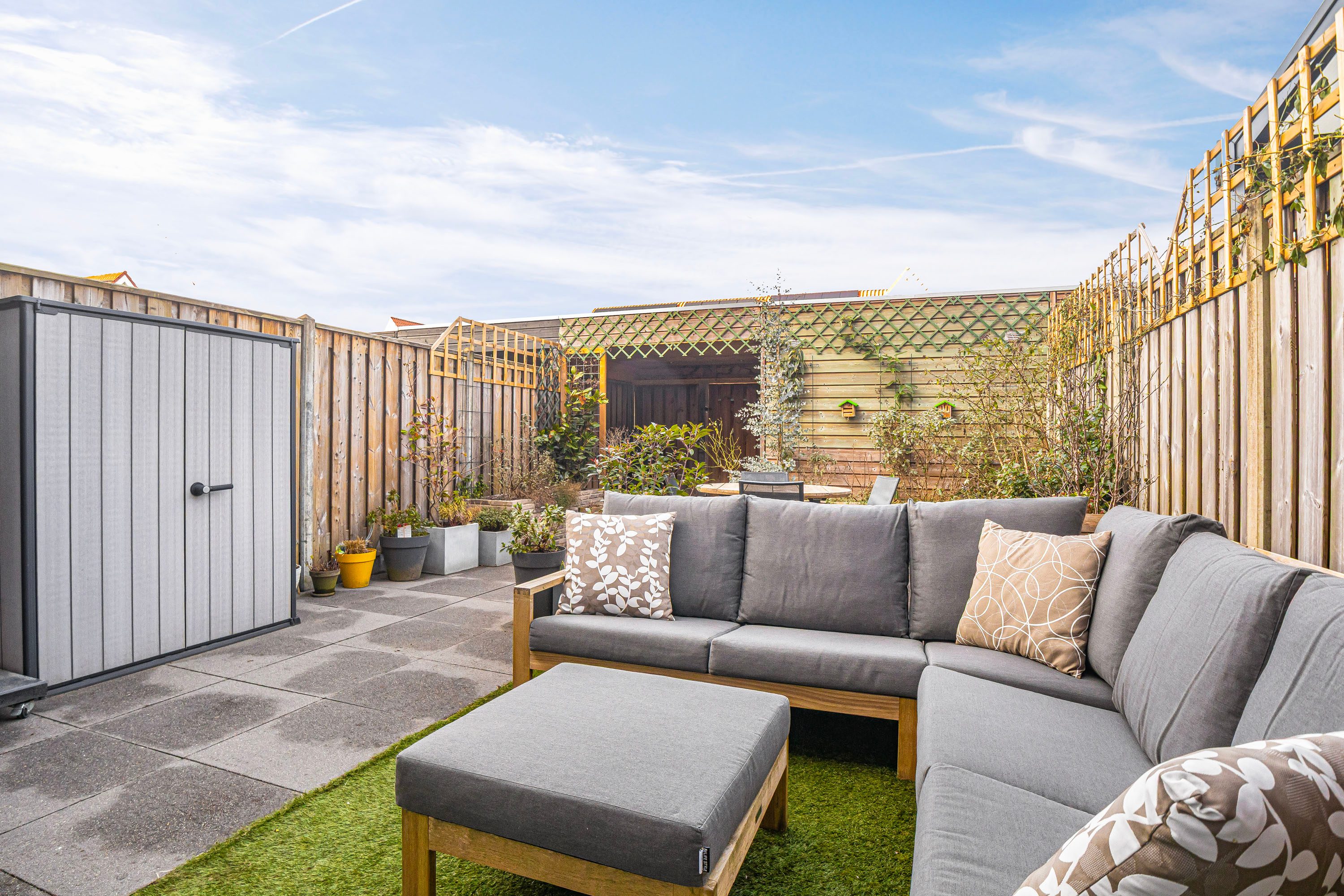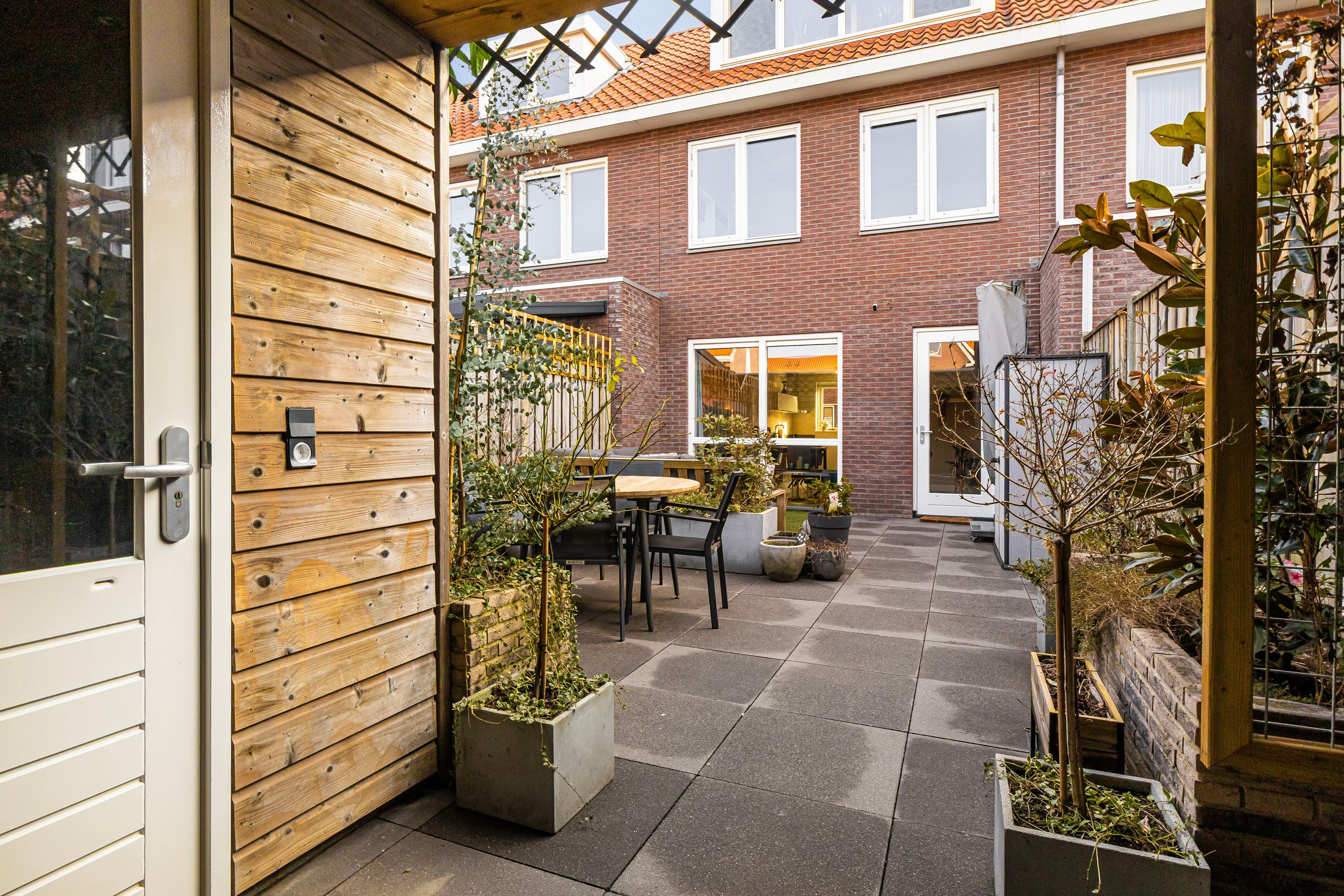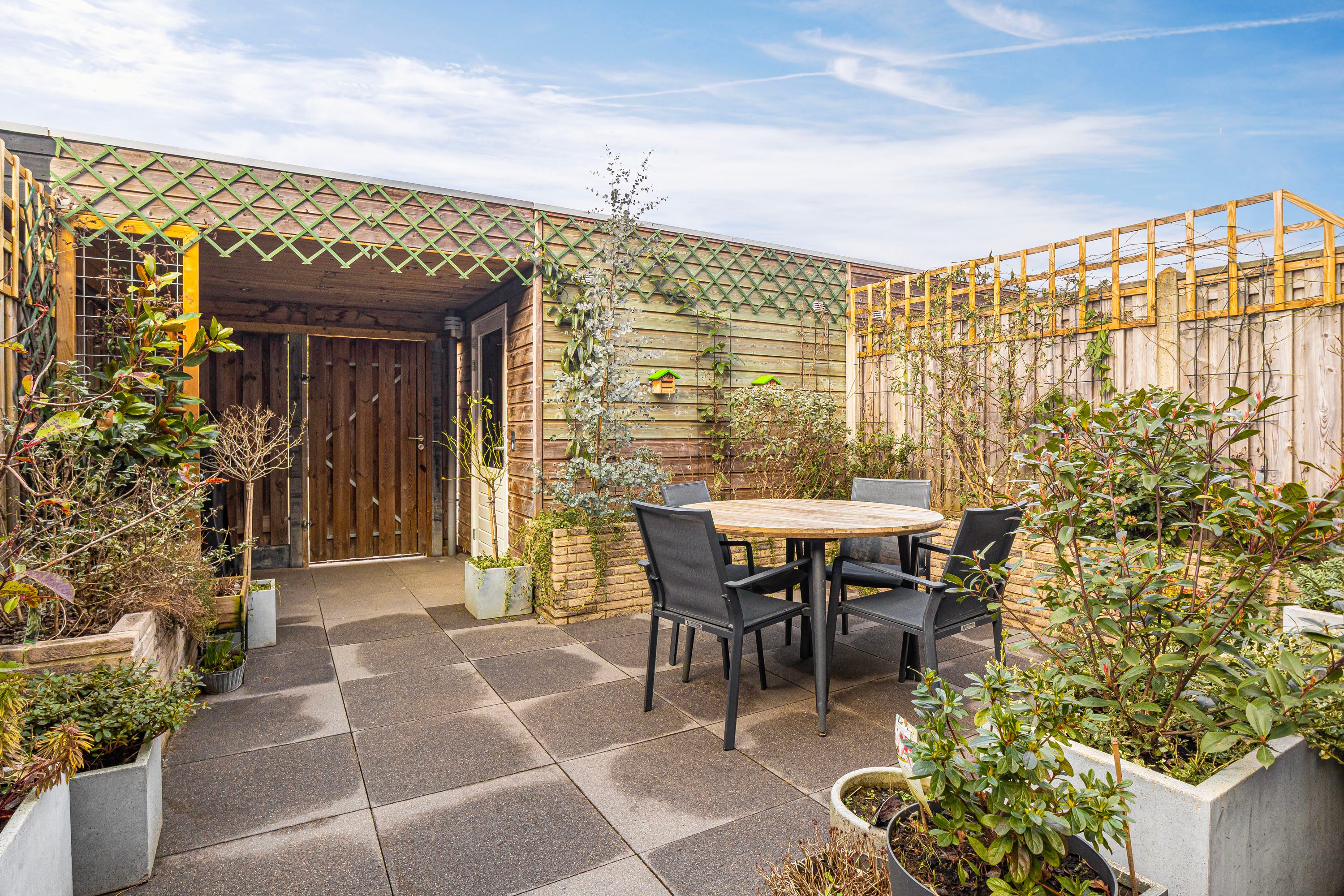 Prettige achtertuin, fraai aangelegd, voorzien van grote tegels, plantenbakken en vrijstaande houten berging. Er is een mogelijkheid tot achterom en op het achtergelegen parkeerterrein beschik je over een eigen parkeerplek. Deze is direct achter de tuin gelegen, fijn om direct te kunnen in en uit te laden aan de poort.