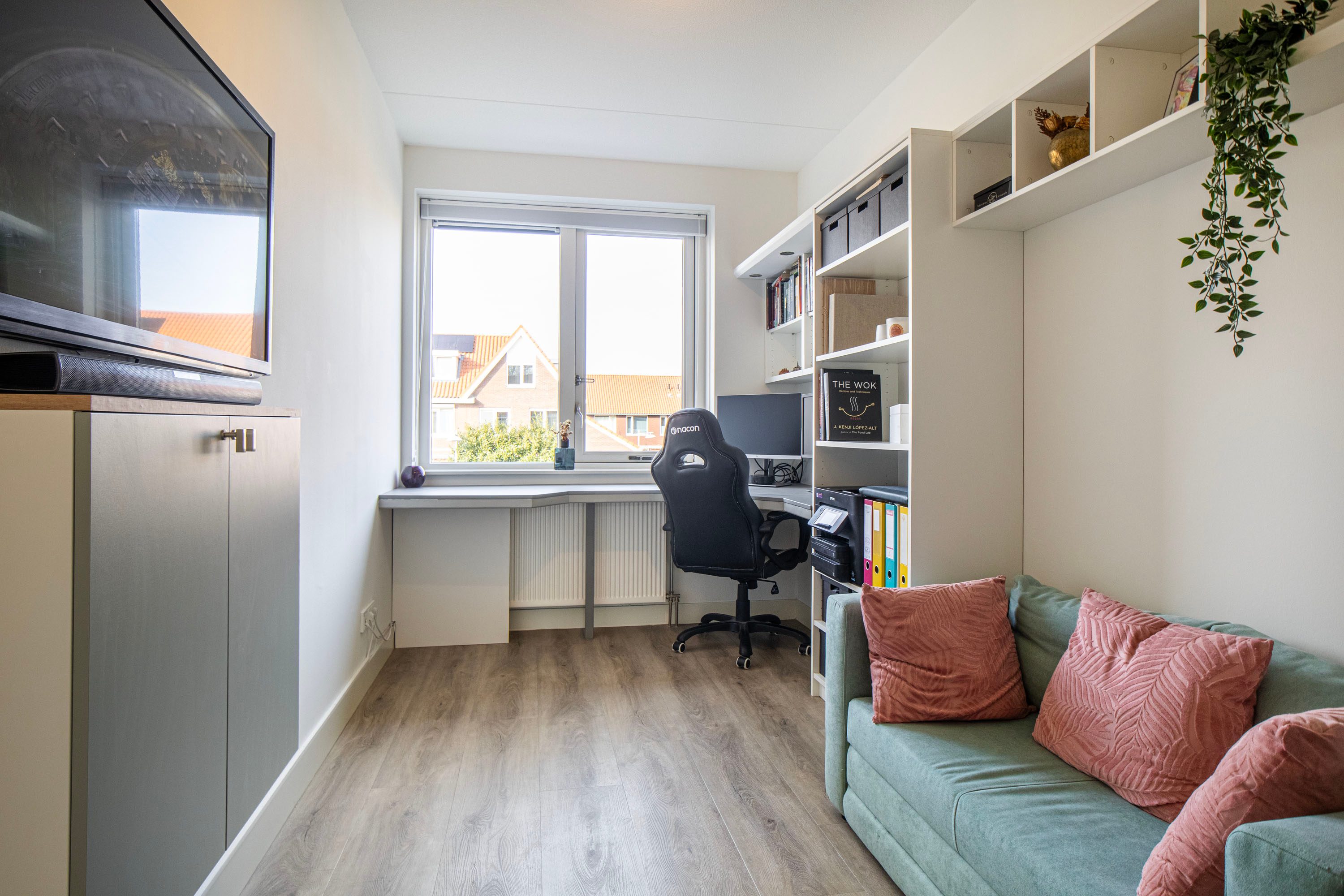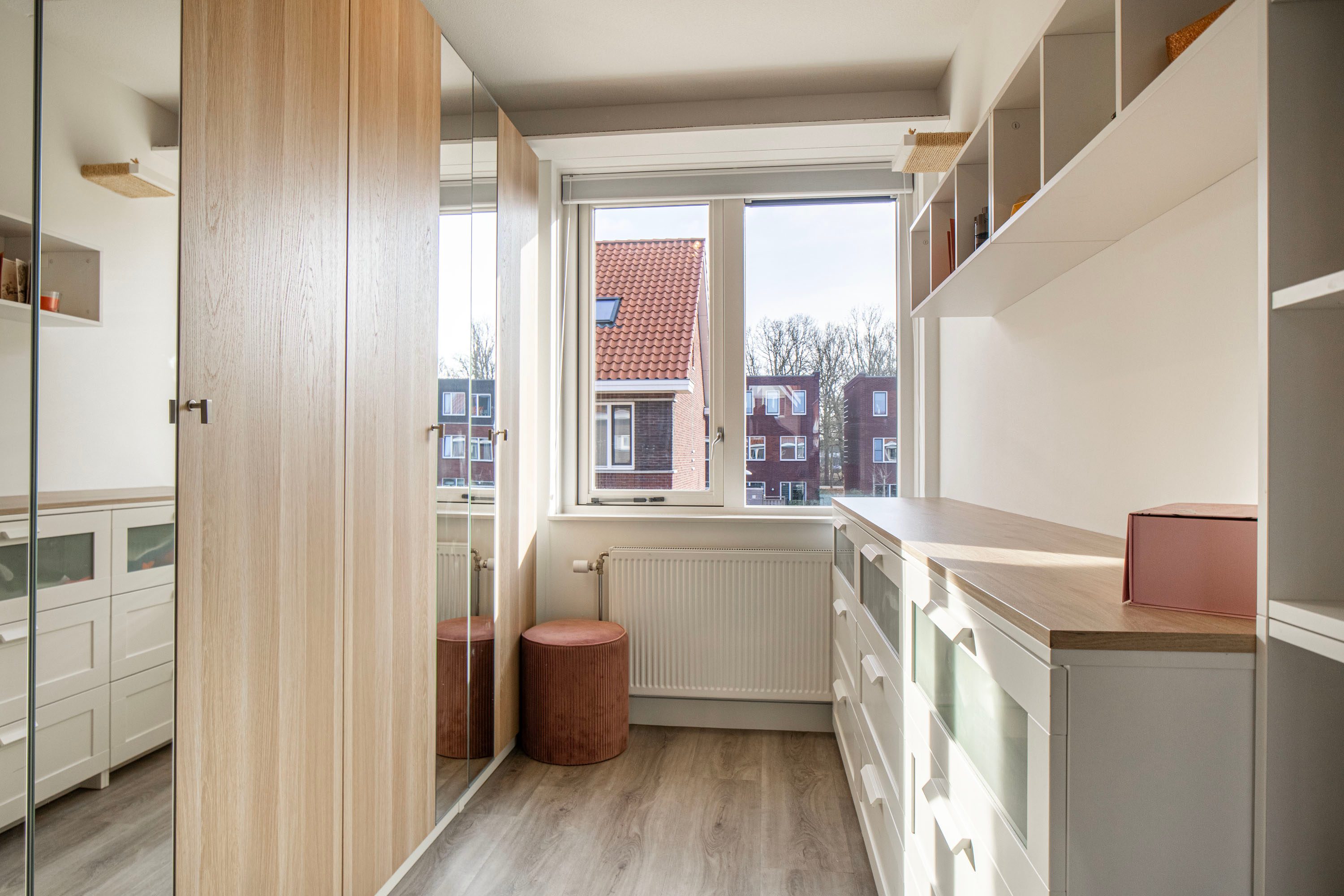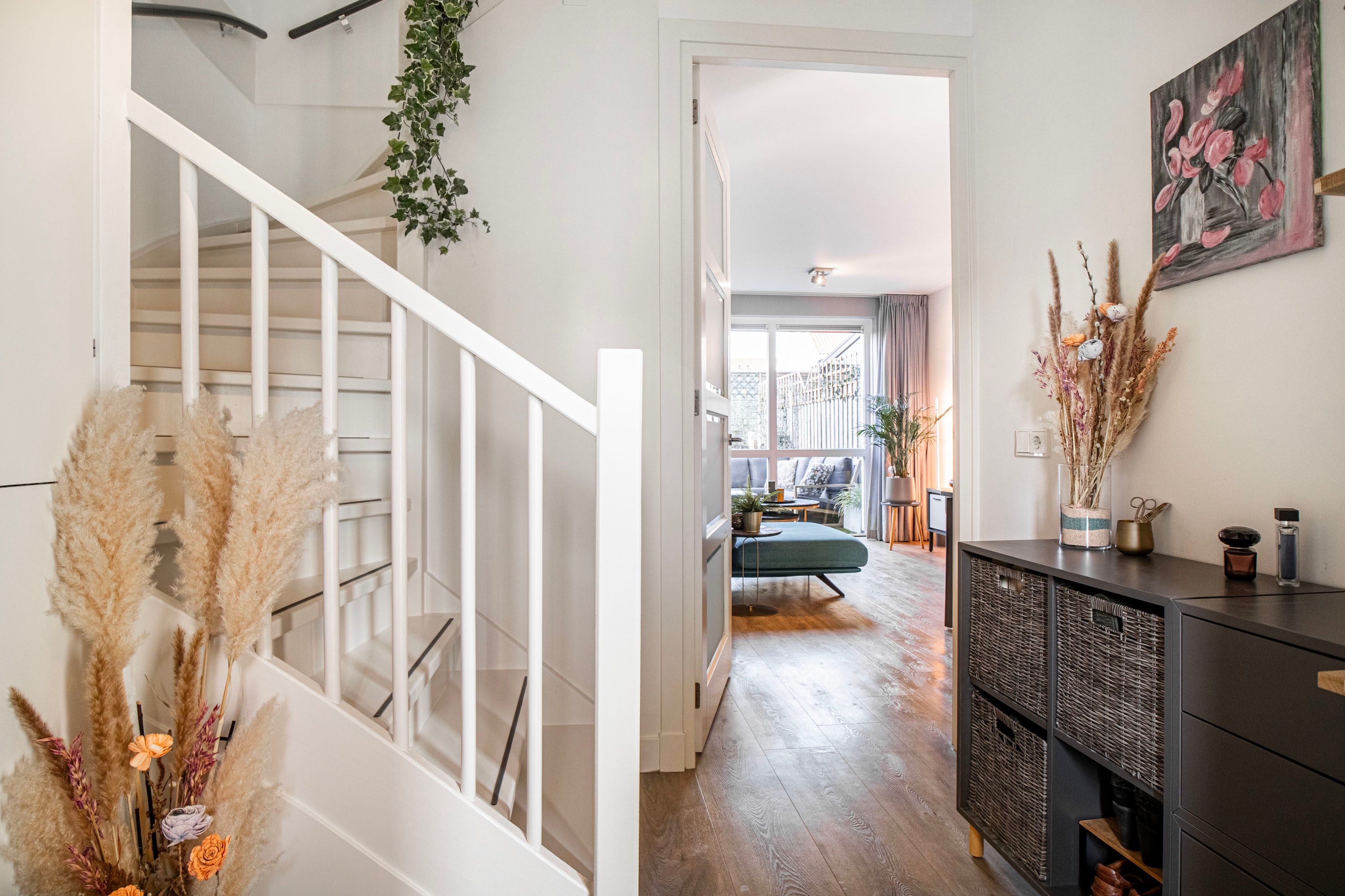De aangename woonkamer is heerlijk licht dankzij de extra raampartijen en de loopdeur naar de achtertuin. De wanden zijn glad afgewerkt en de vloerverwarming fungeert als hoofdverwarming, wat zorgt voor optimaal comfort. Onder de trap bevindt zich een praktische provisiekast.