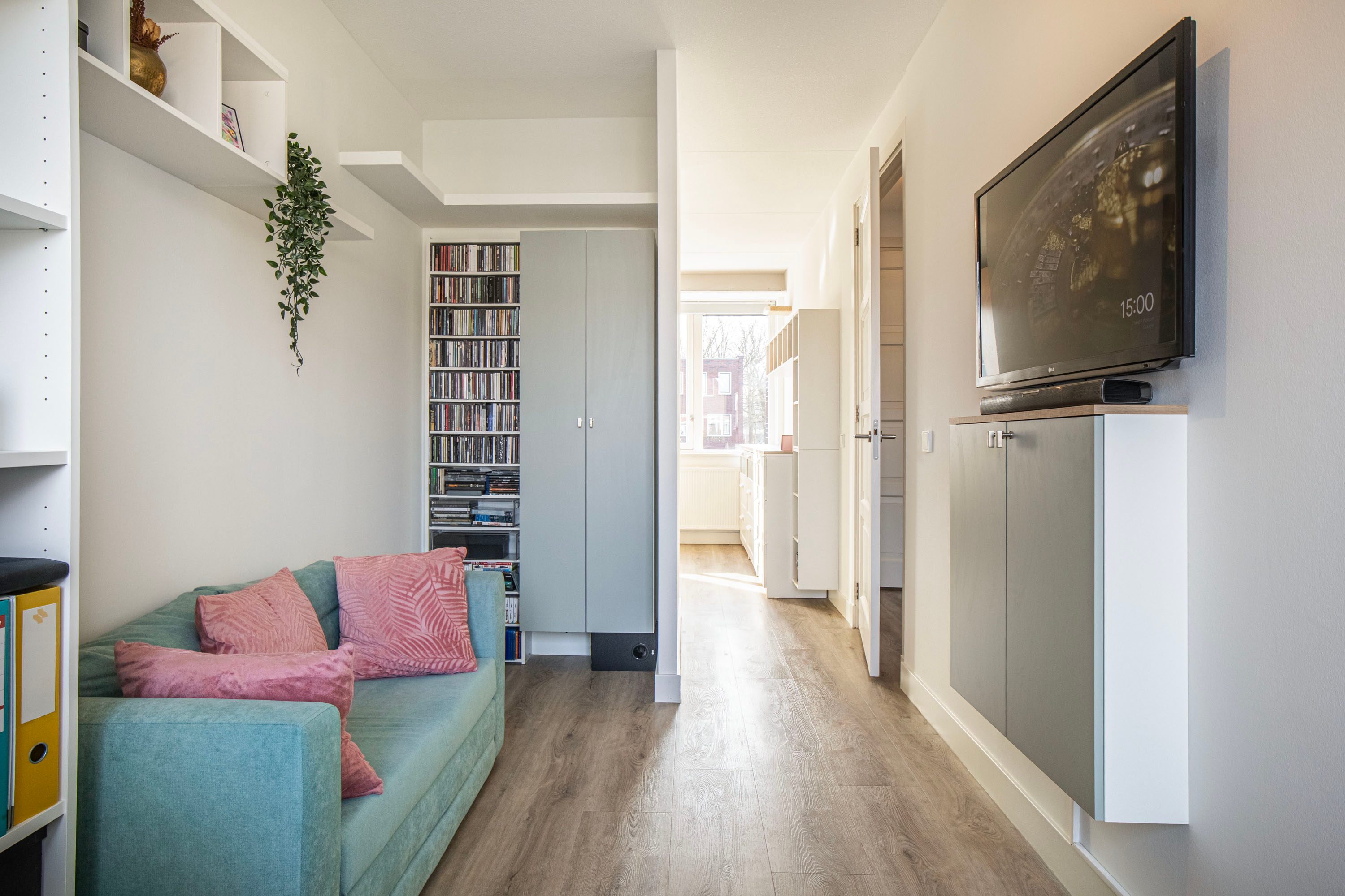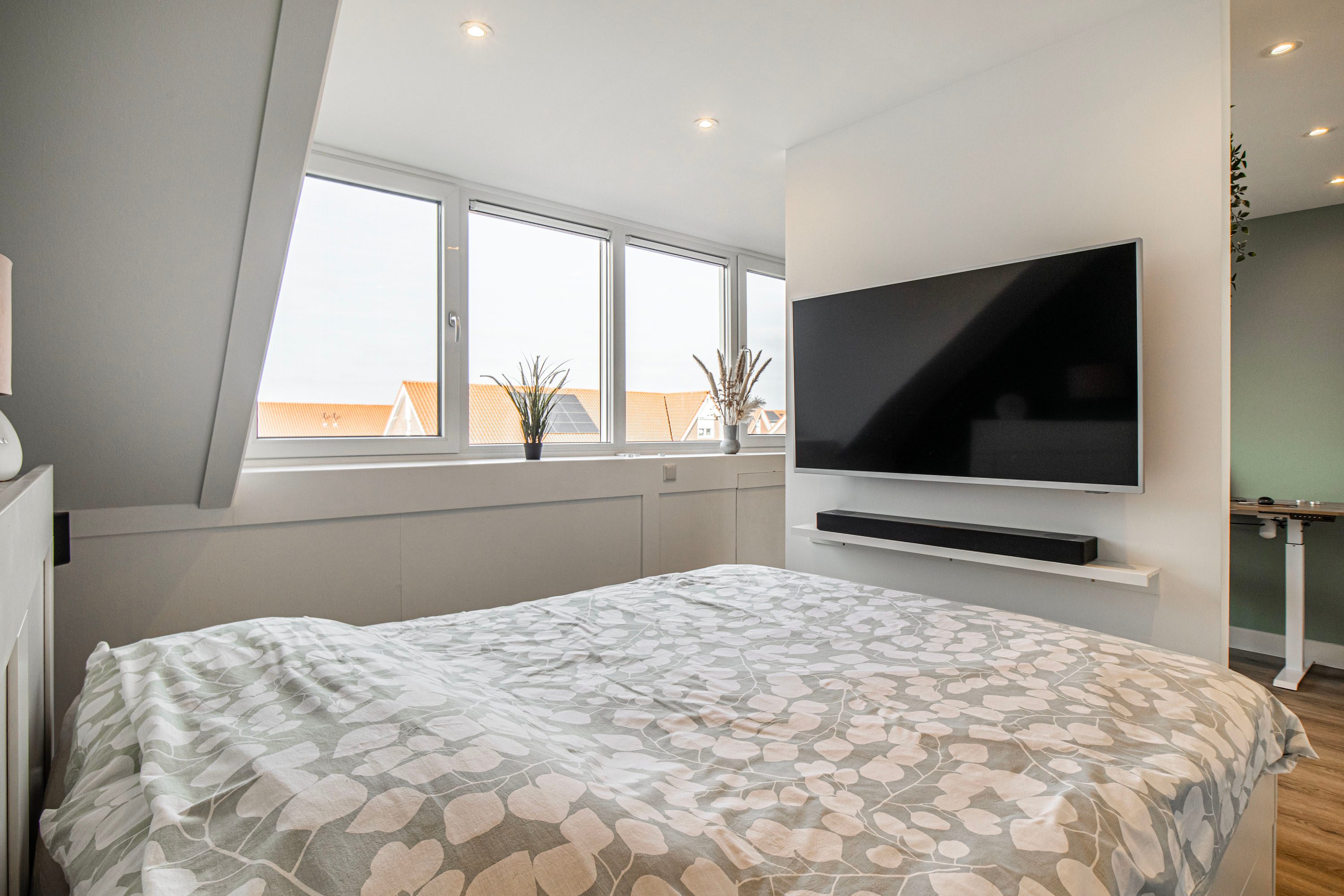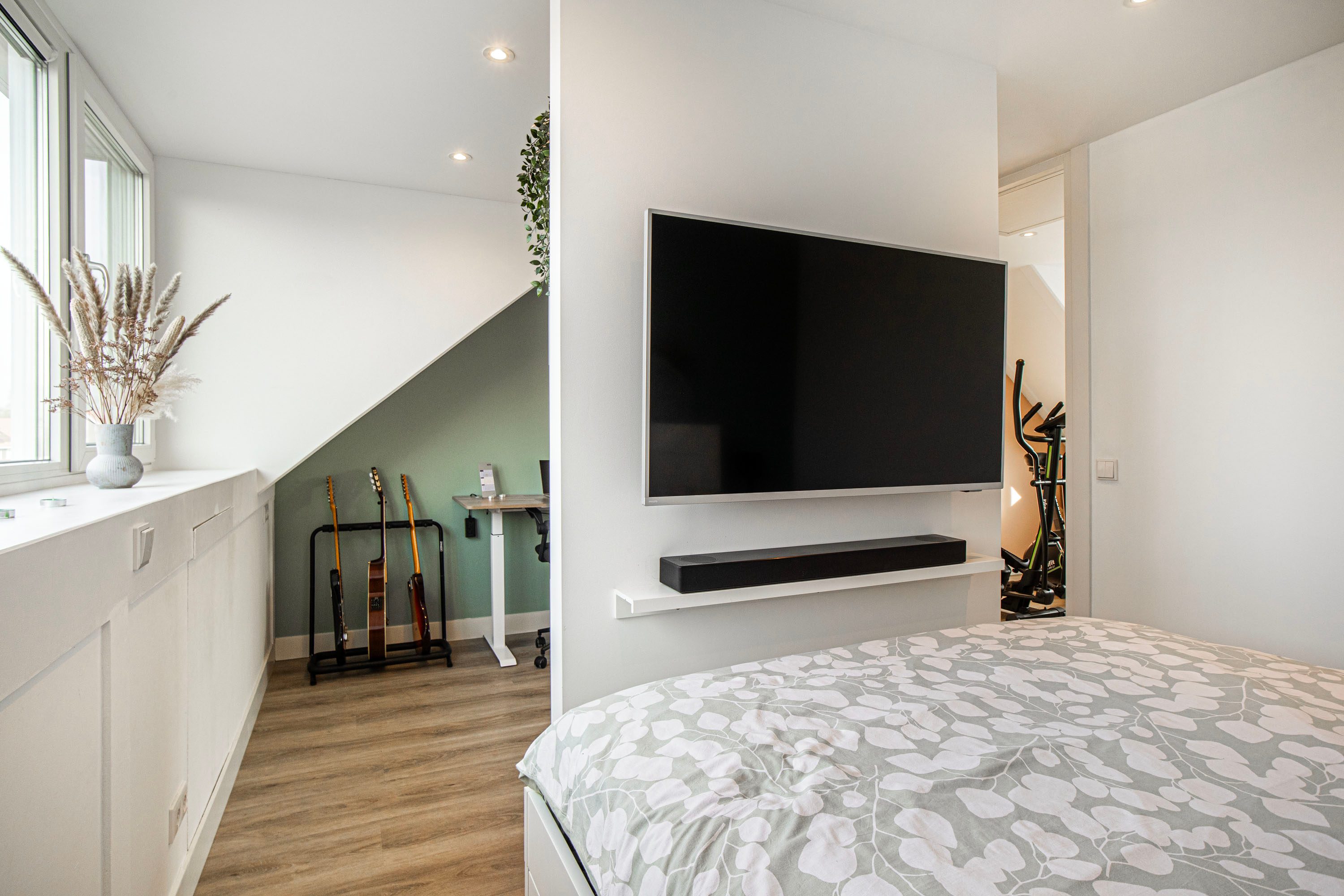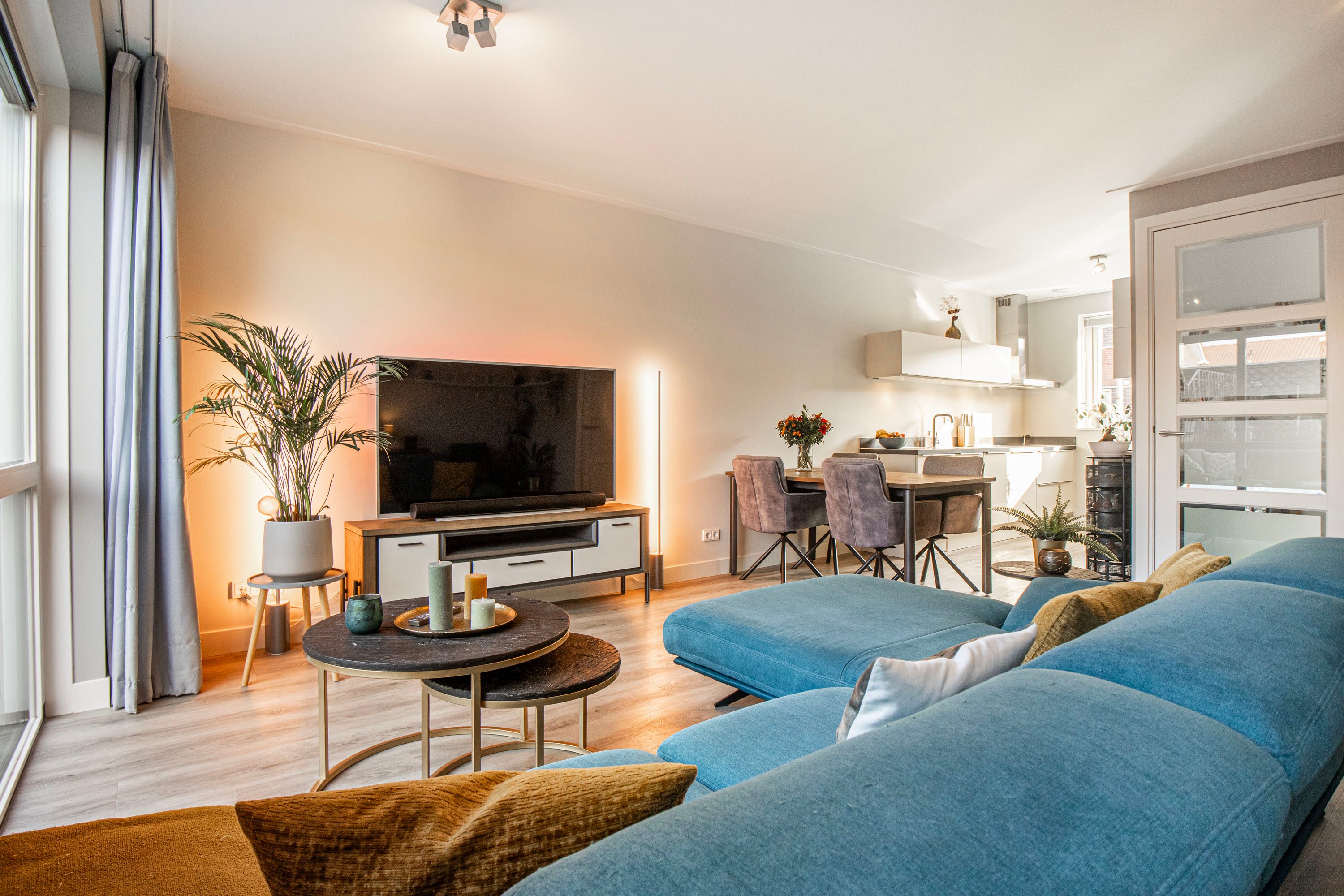 De aangename woonkamer is heerlijk licht dankzij de extra raampartijen en de loopdeur naar de achtertuin. De wanden zijn glad afgewerkt en de vloerverwarming fungeert als hoofdverwarming, wat zorgt voor optimaal comfort. Onder de trap bevindt zich een praktische provisiekast.