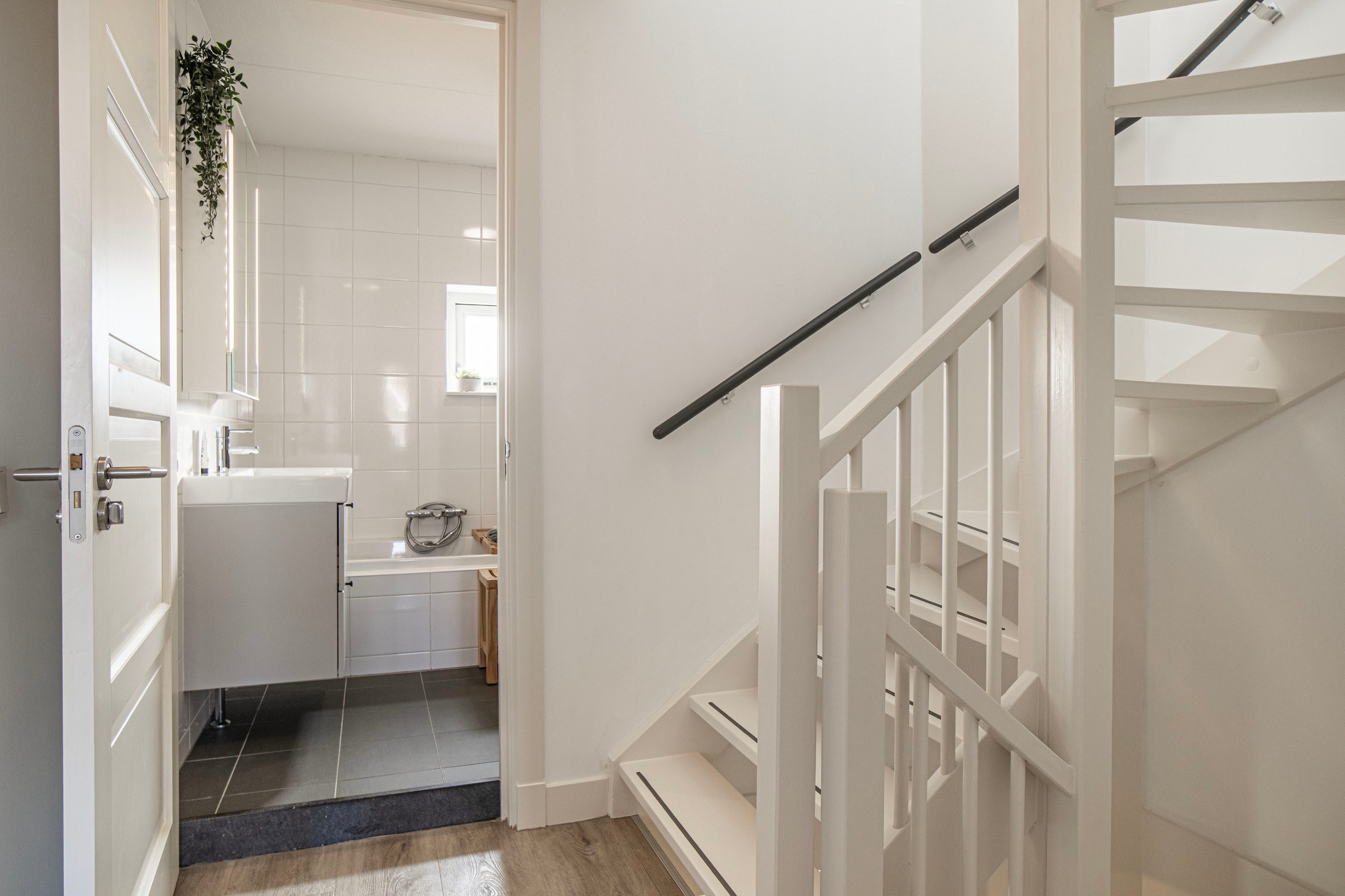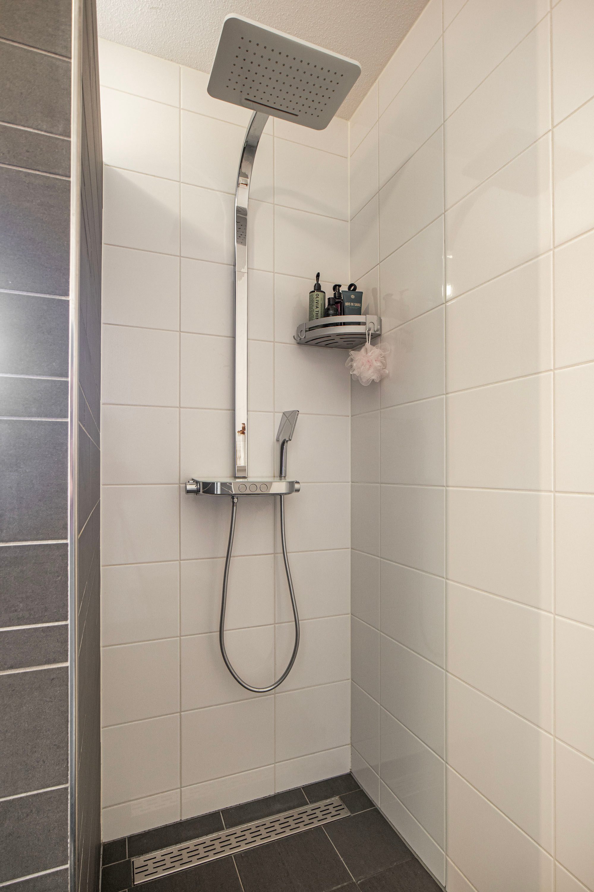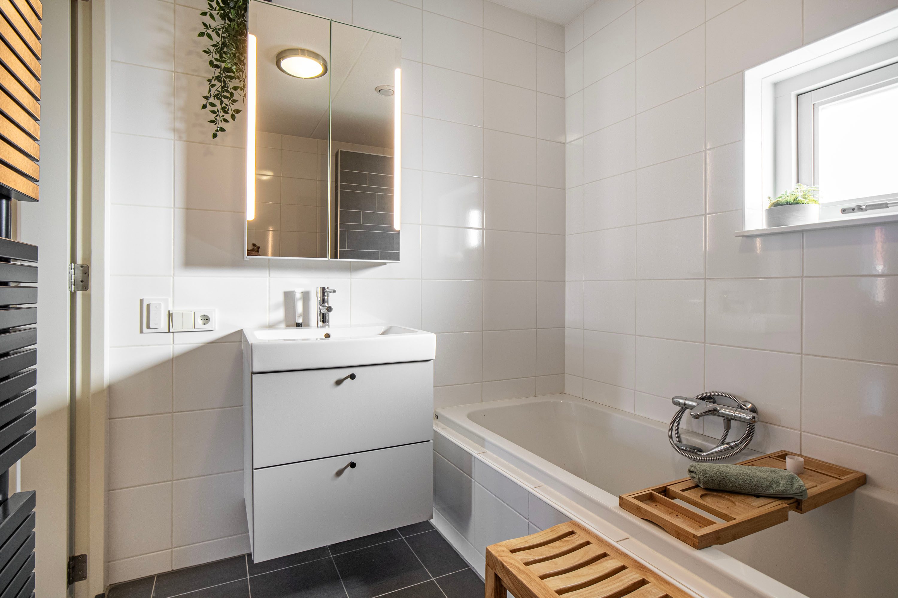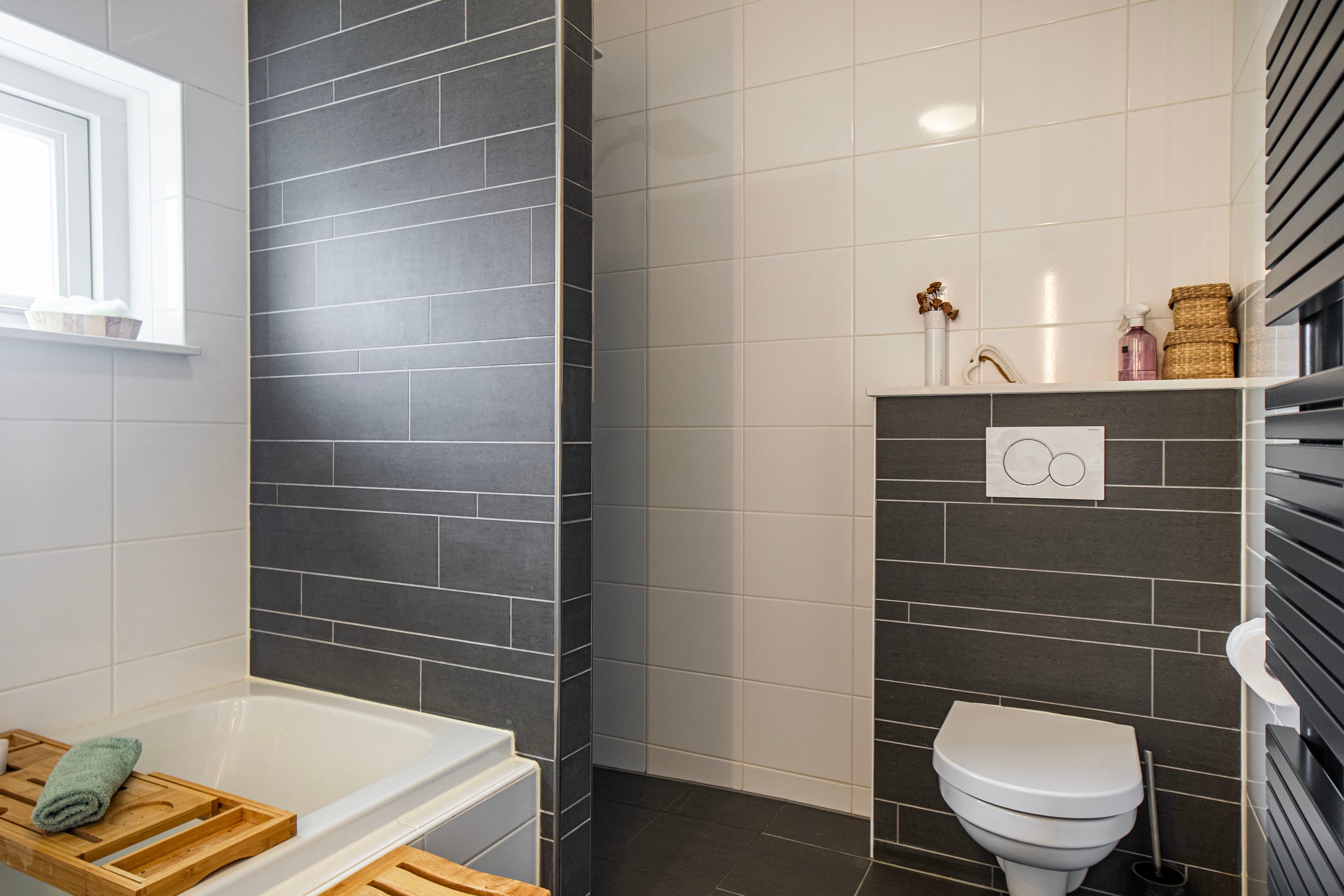 De volledig ingerichte badkamer is voorzien van een inloopdouche, vaste wastafel, ligbad en tweede toilet. Dankzij het raam is er naast mechanische ook natuurlijke ventilatie aanwezig.