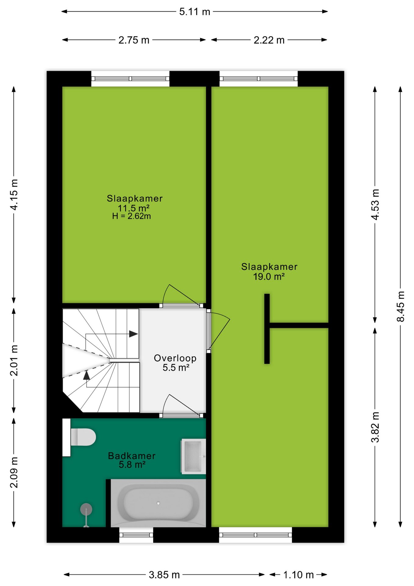 Via de vaste trap kom je op de overloop met toegang tot twee slaapkamers (met mogelijkheid tot 3) en de badkamer. De slaapkamers zijn licht en van goede afmeting. De grootste kamer is opgedeeld in een werkruimte/kantoor en de andere ruimte is ingedeeld met vaste kasten. Deze kamers kunnen beide goed teruggebracht worden naar volwaardige slaapvertrekken.