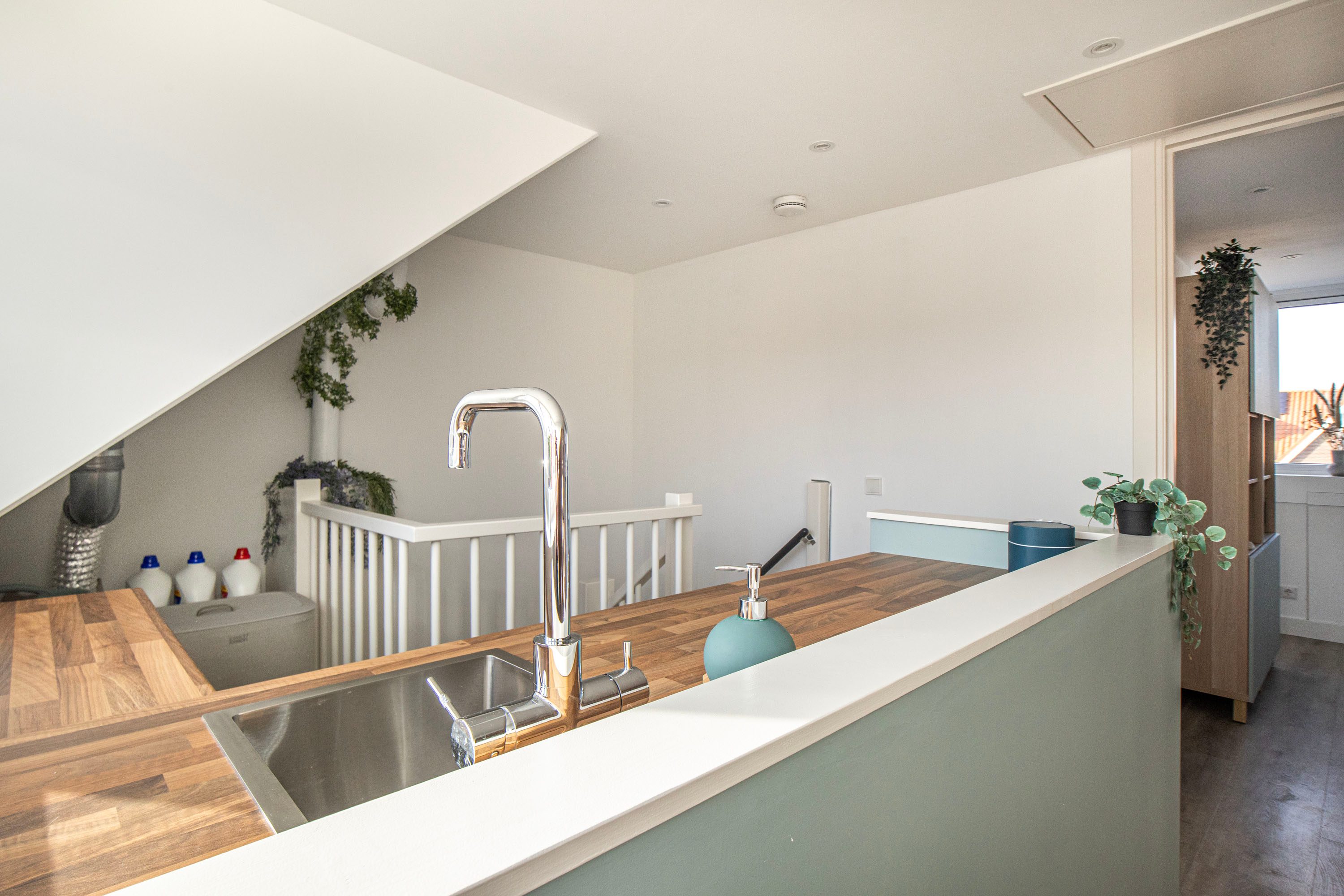 De woning beschikt over een strak afgewerkte, luxe inbouwkeuken in een lichte kleurstelling. De hoge kastenwand met geïntegreerde combi-oven en stoomoven is mooi weggewerkt in een nis. Verder is de keuken voorzien van een inductiekookplaat, afzuigkap, koelkast, vriezer en vaatwasser.