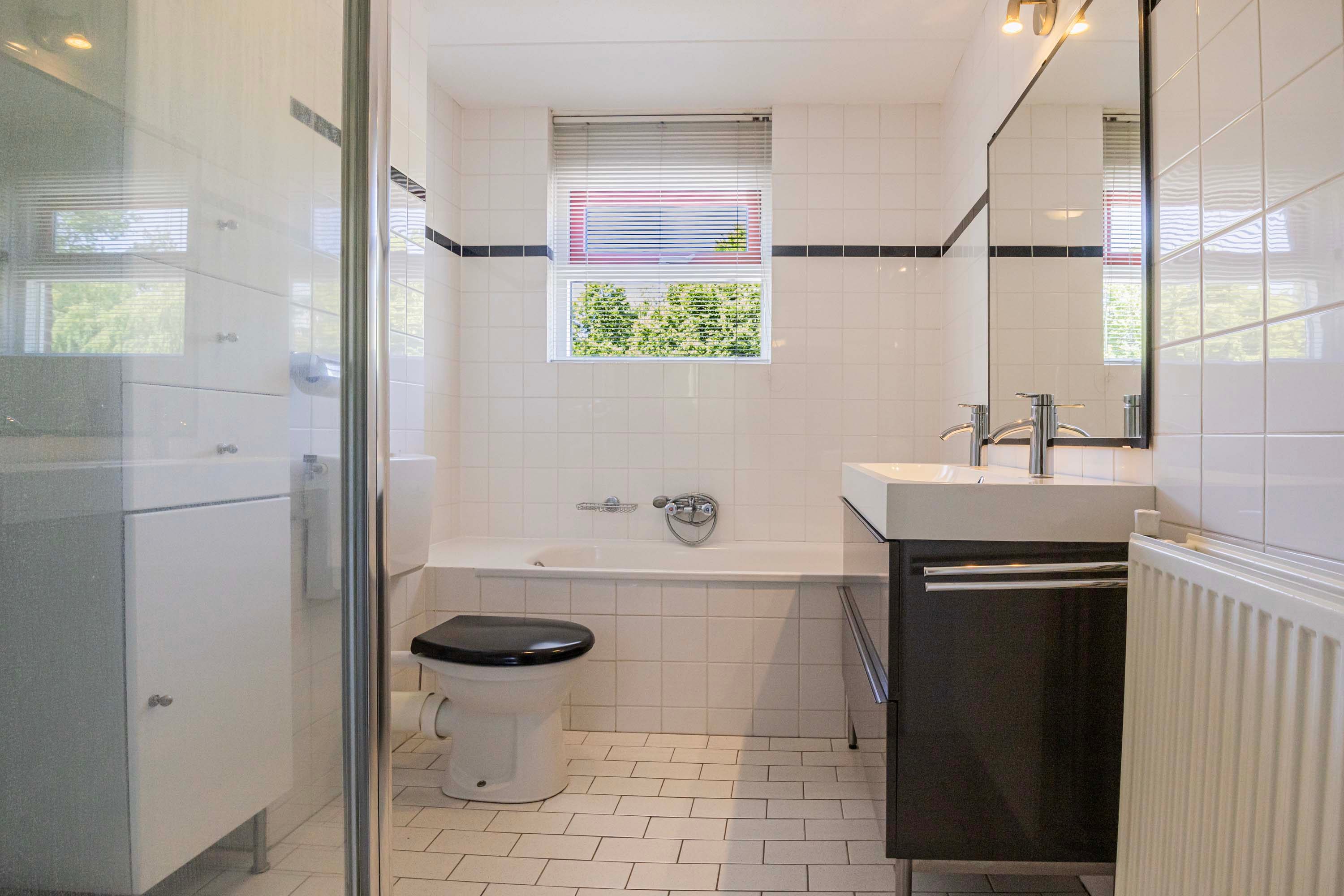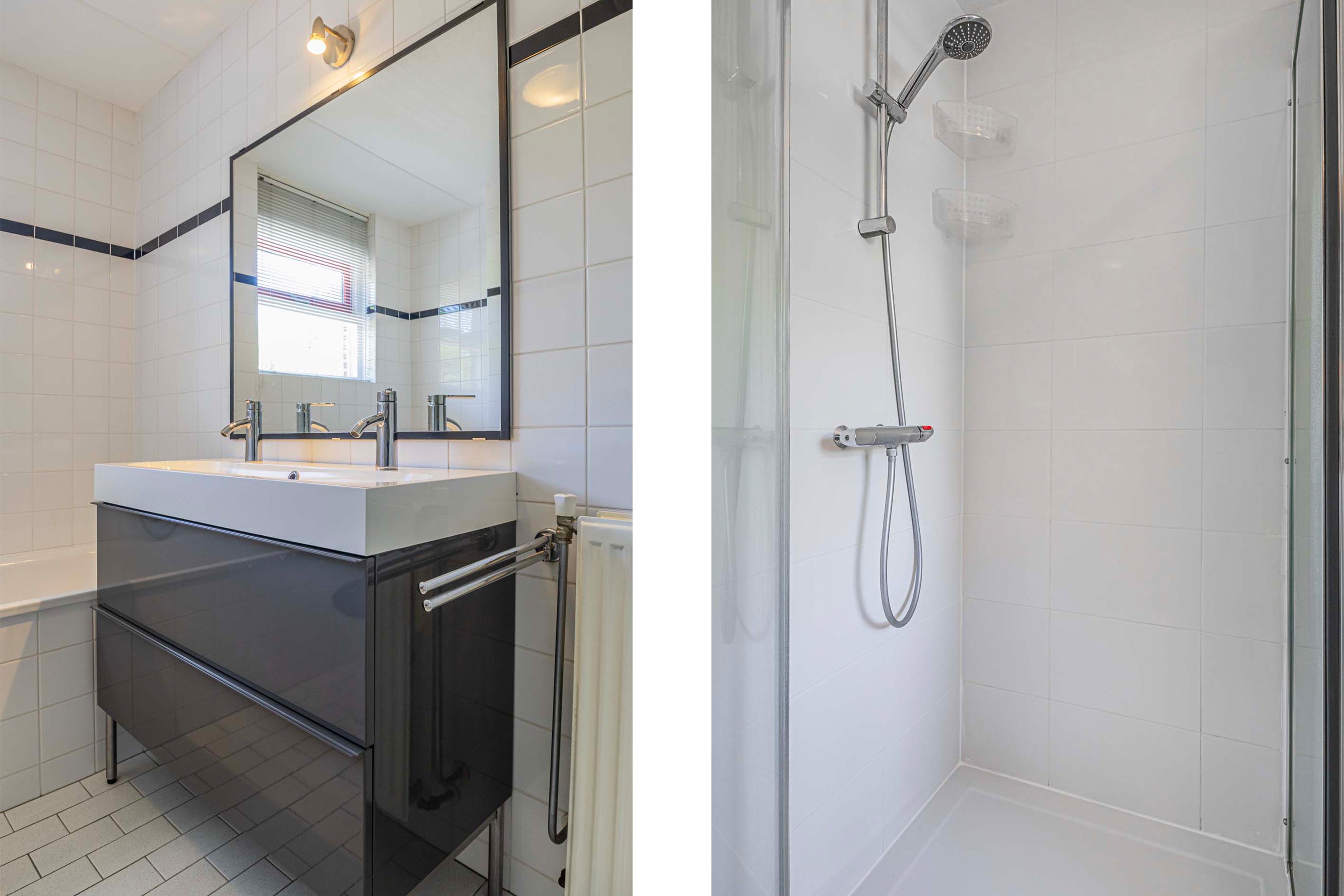 De badkamer is compleet uitgerust met een ligbad, een douche, een toilet en een stijlvol wastafelmeubel. Alles wat je nodig hebt voor comfort en gemak op één verdieping.