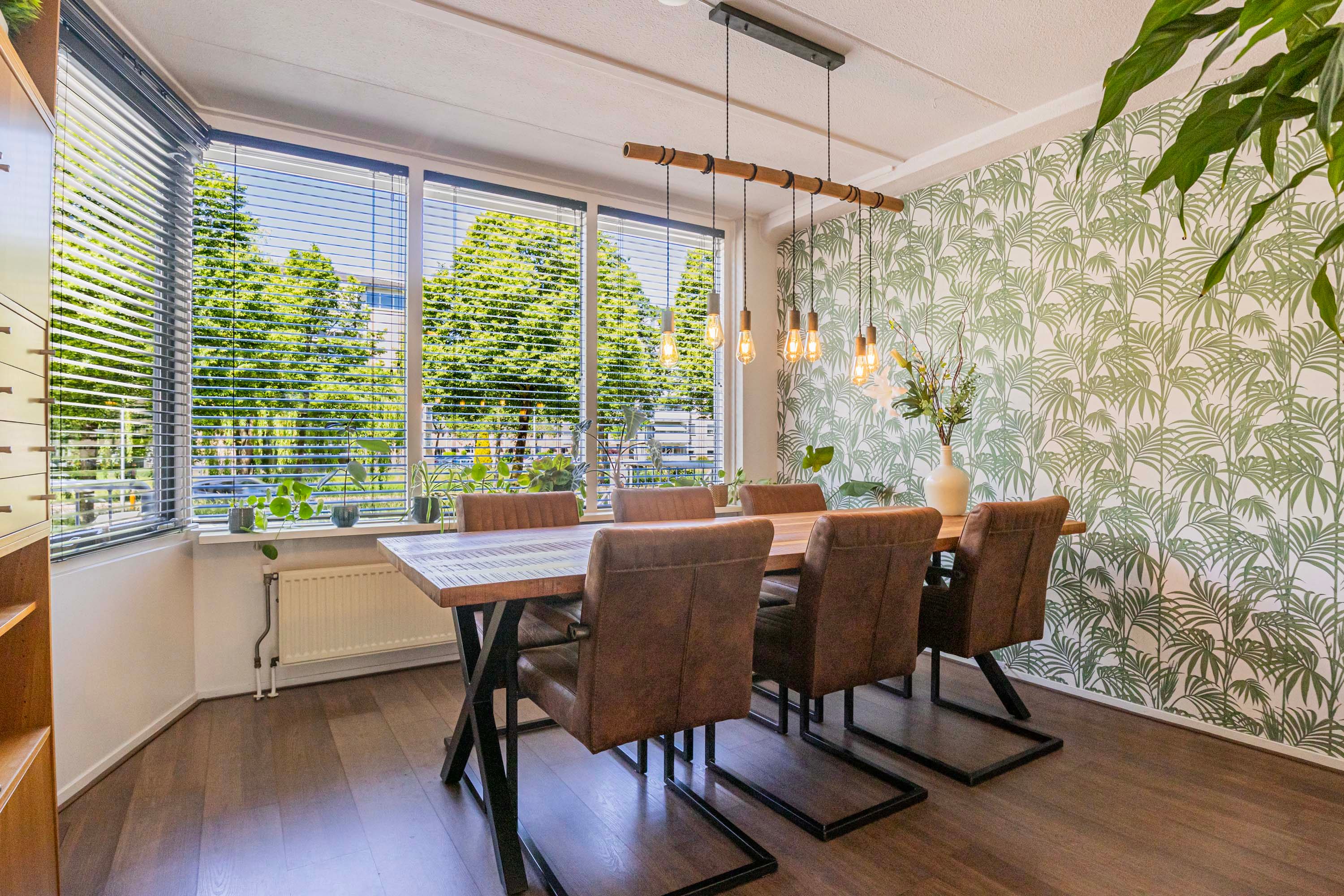 In de eetkamer word je meteen verrast door het prachtige licht dat door de erker naar binnen valt. Vanuit de eetkamer blijf je gezellig in contact met degene die in de keuken staat te kokkerellen.