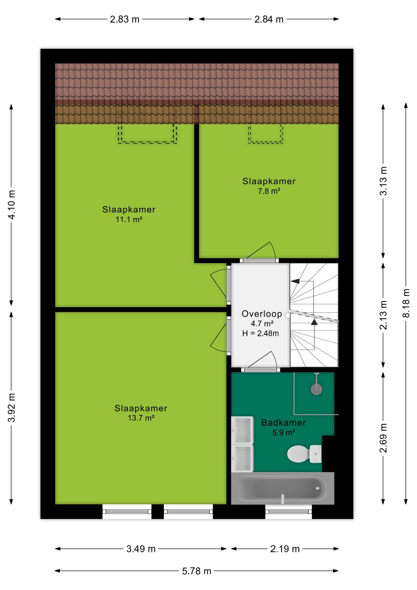 Boven aangekomen is er volop ruimte met 3 slaapkamers van circa 14 m², 11 m² en 8 m². De twee slaapkamers aan de achterzijde zijn voorzien van een dakraam. De slaapkamer aan de voorzijde is voorzien van rolluiken.
