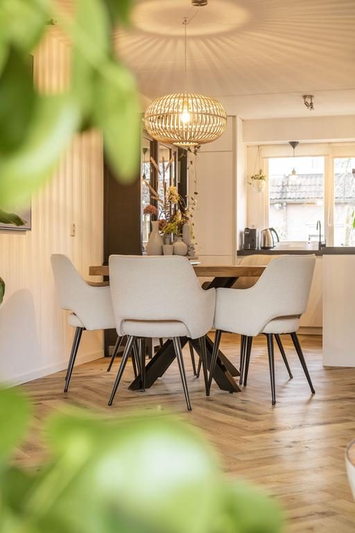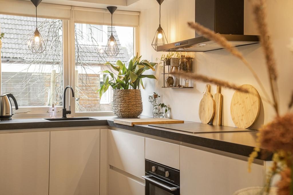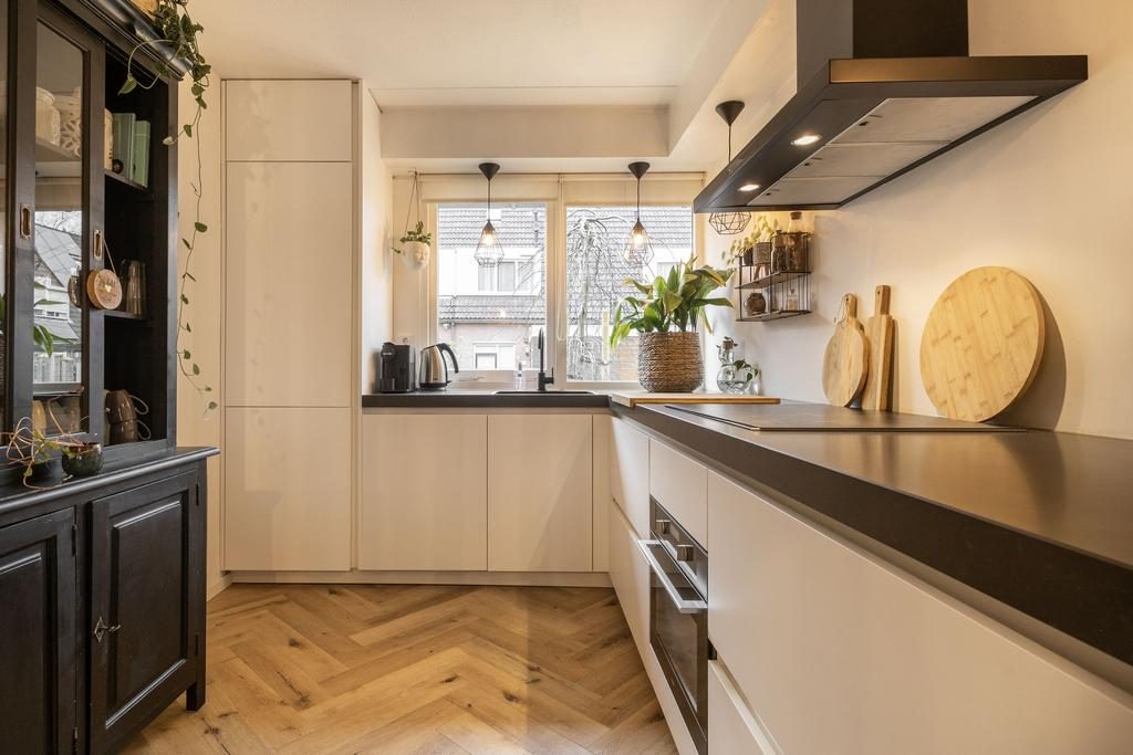 De moderne keuken is uitgevoerd in een lichte kleurstelling, met een stijlvol donker werkblad. Deze keuken is voorzien van alle benodigde inbouwapparatuur, waaronder een inductiekookplaat, afzuigkap, oven, vaatwasser en een koelkast met vriescombinatie. Hierdoor is de keuken niet alleen functioneel, maar ook een plezierige plek om te koken.
