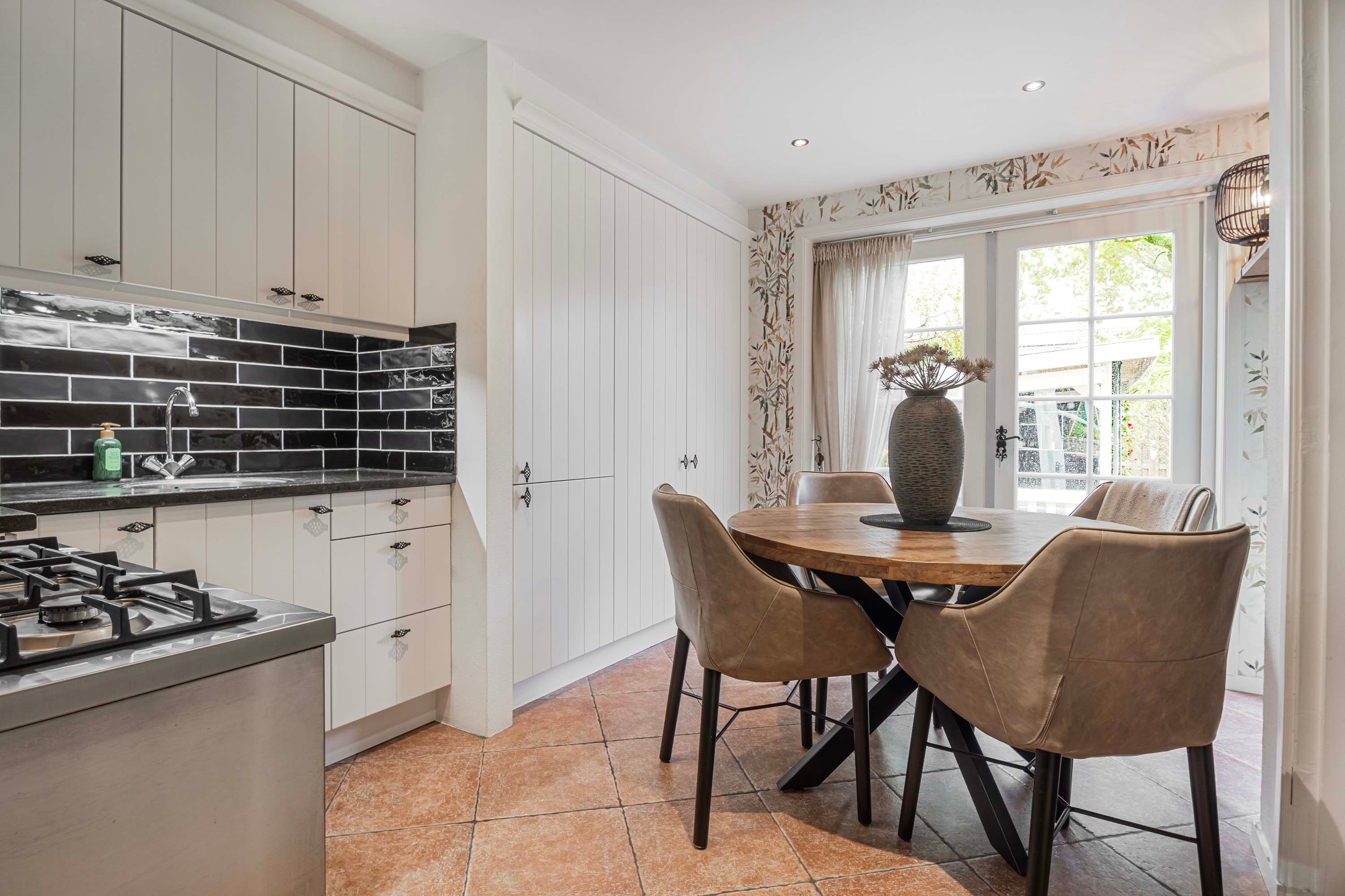 De eetkeuken aan de achterzijde is uitgevoerd in een lichte kleurstelling en uitgerust met een 5-pits gasfornuis met oven, afzuigkap, vaatwasser, magnetron, koelkast en veel kastruimte. Hier bevindt zich ook de CV-combiketel (Remeha, 2019) in een aparte kast.