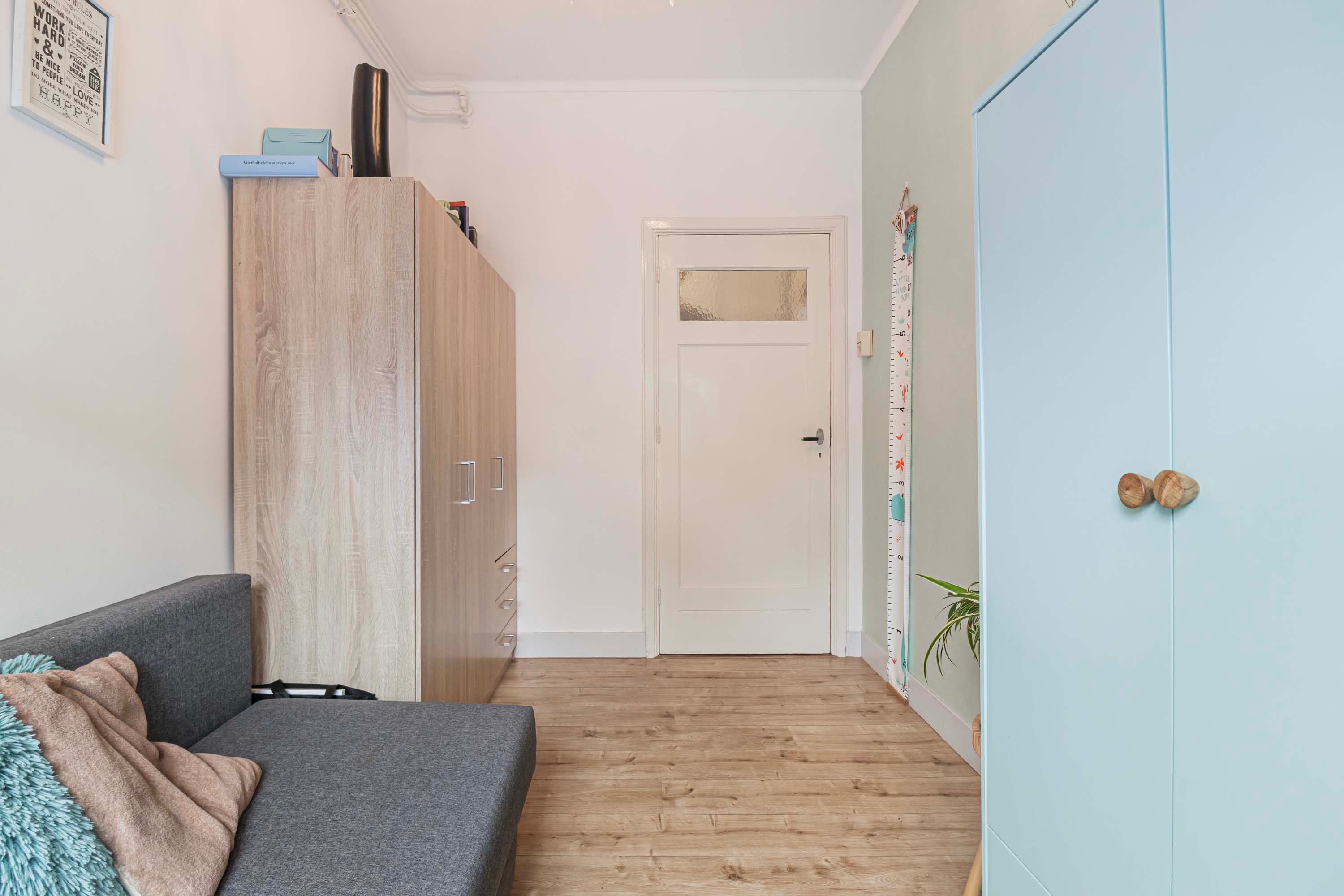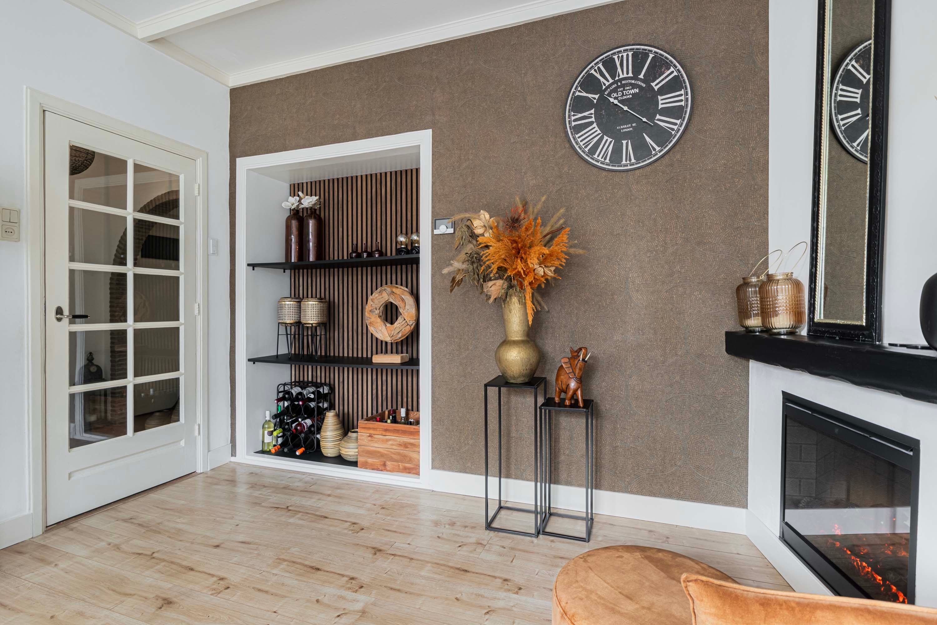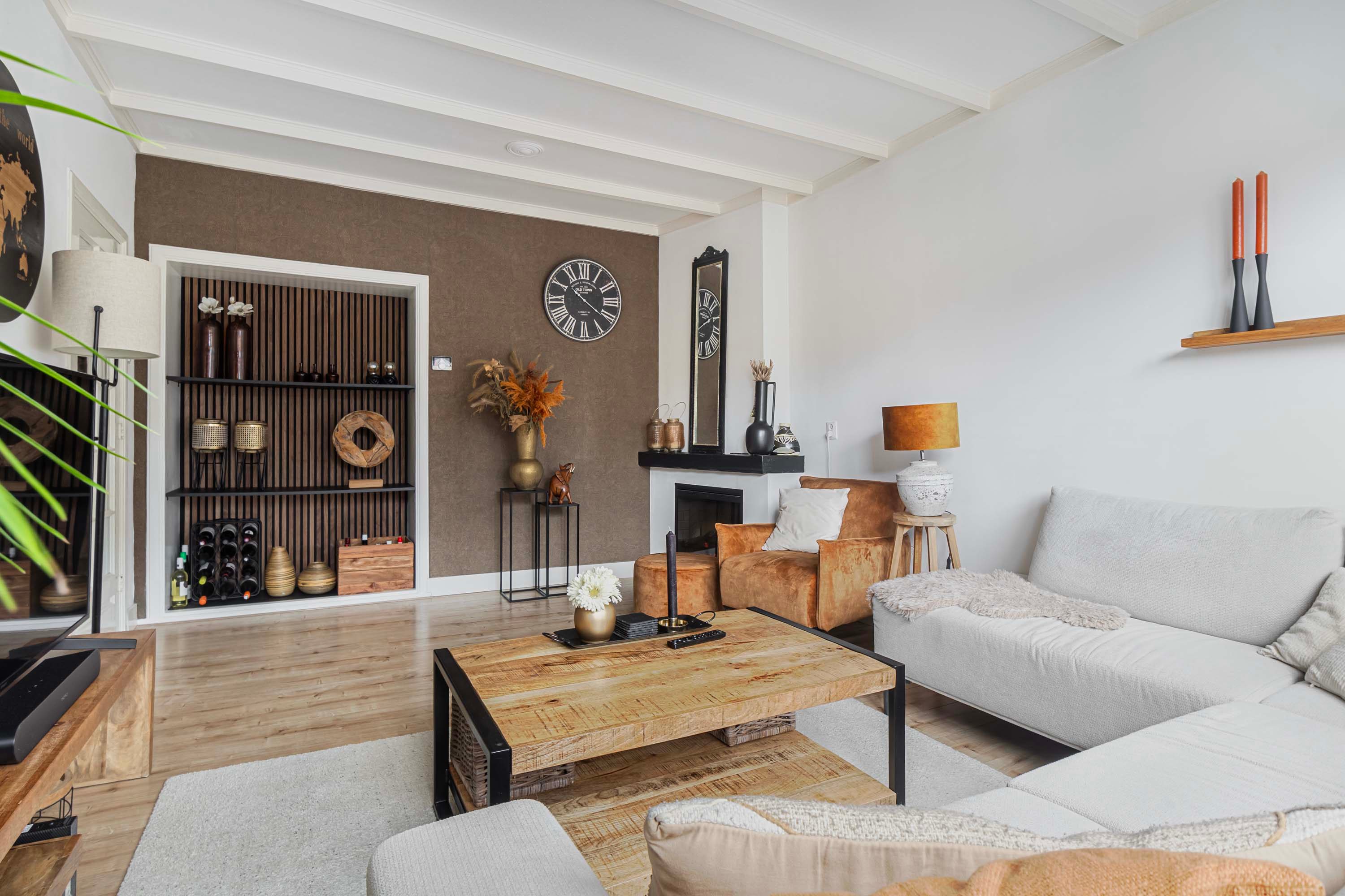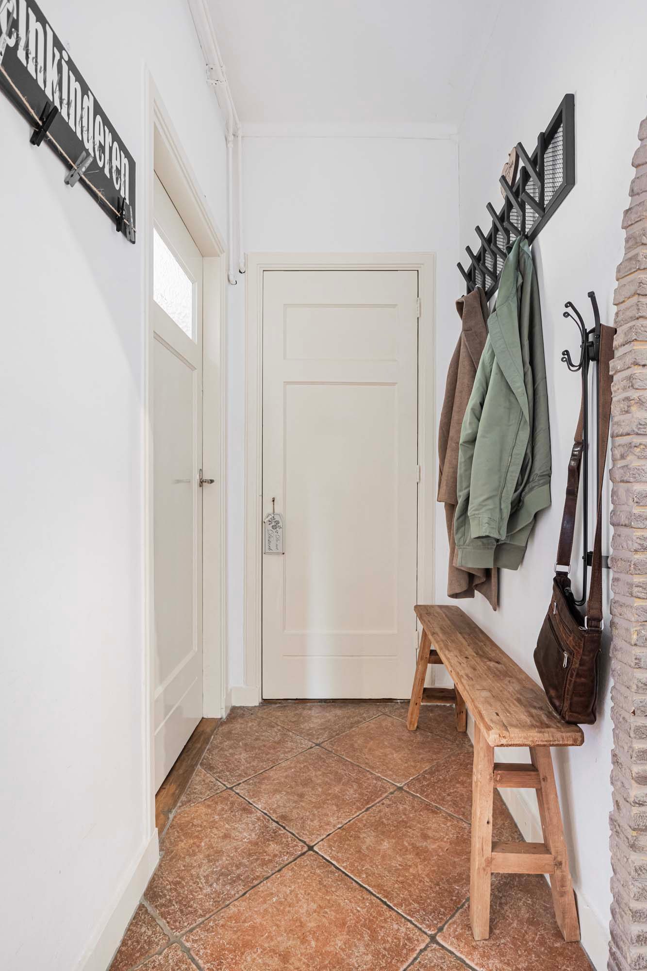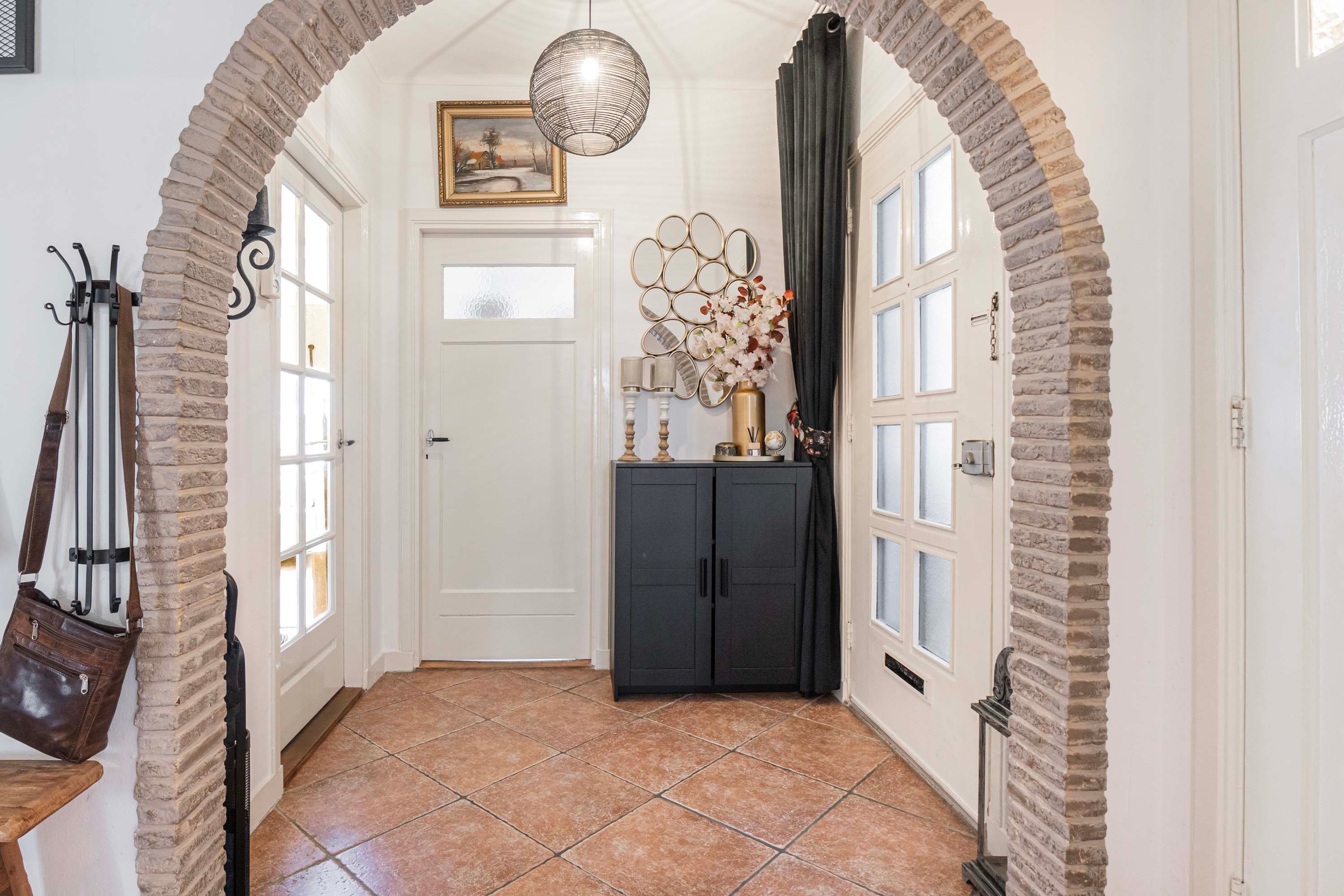 De hal biedt toegang tot alle vertrekken en is voorzien van een meterkast, een praktische bergkast en een toilet met fontein. De woonkamer aan de voorzijde is heerlijk licht en kijkt uit op de voortuin. Authentieke details zoals paneeldeuren en een vaste servieskast geven het geheel extra sfeer.