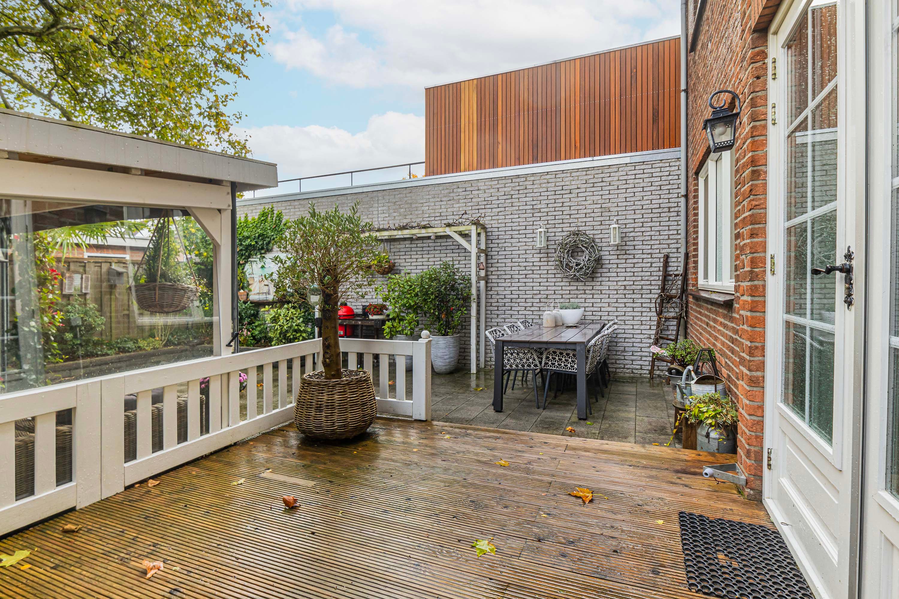 De voortuin is groen aangelegd en biedt ruimte voor een auto. De achtertuin is royaal, zonnig gelegen op het zuidwesten en beschikt over een achterom en een heerlijke veranda met aangebouwde berging/tuinhuis. Daarnaast is een extra berging aanwezig achter het complex.