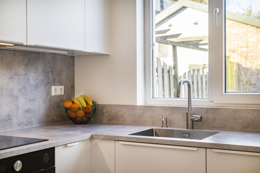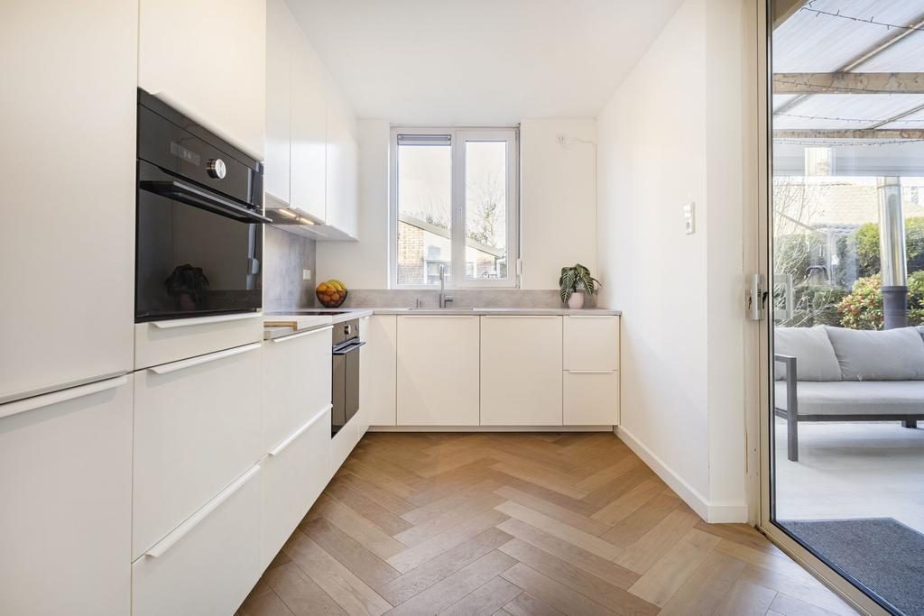 Er is een uitbouw aan de woning waarin de open keuken is gesitueerd. De luxe nieuwe inbouwkeuken is in hoekopstelling geplaatst. Het geheel heeft een neutrale lichte kleurstelling en beschikt over diverse inbouwapparatuur, te weten een vaatwasser, koel- vriescombinatie, oven, combimagnetron, inductie kookplaat en een afzuigkap.