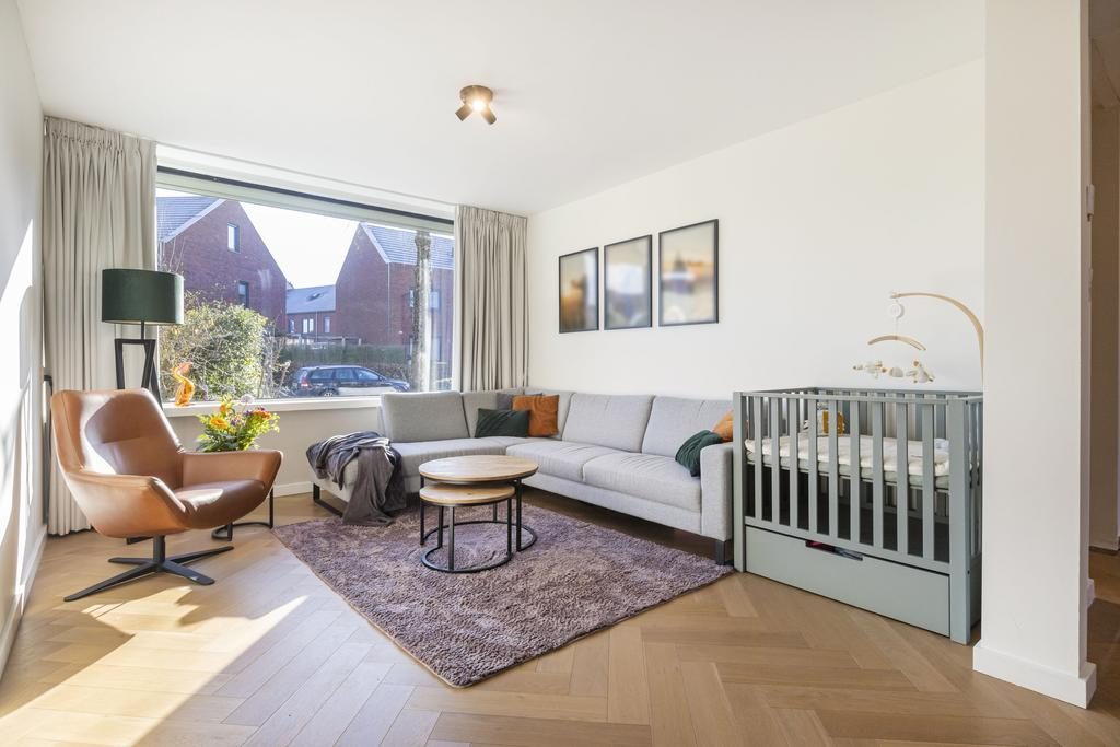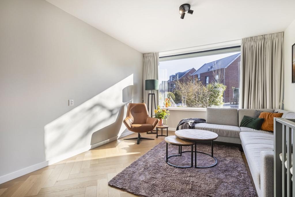 De woonkamer is gelegen aan de voorzijde van de woning. Door de grote raampartij aan de voorkant is dit een heerlijk lichte zithoek.