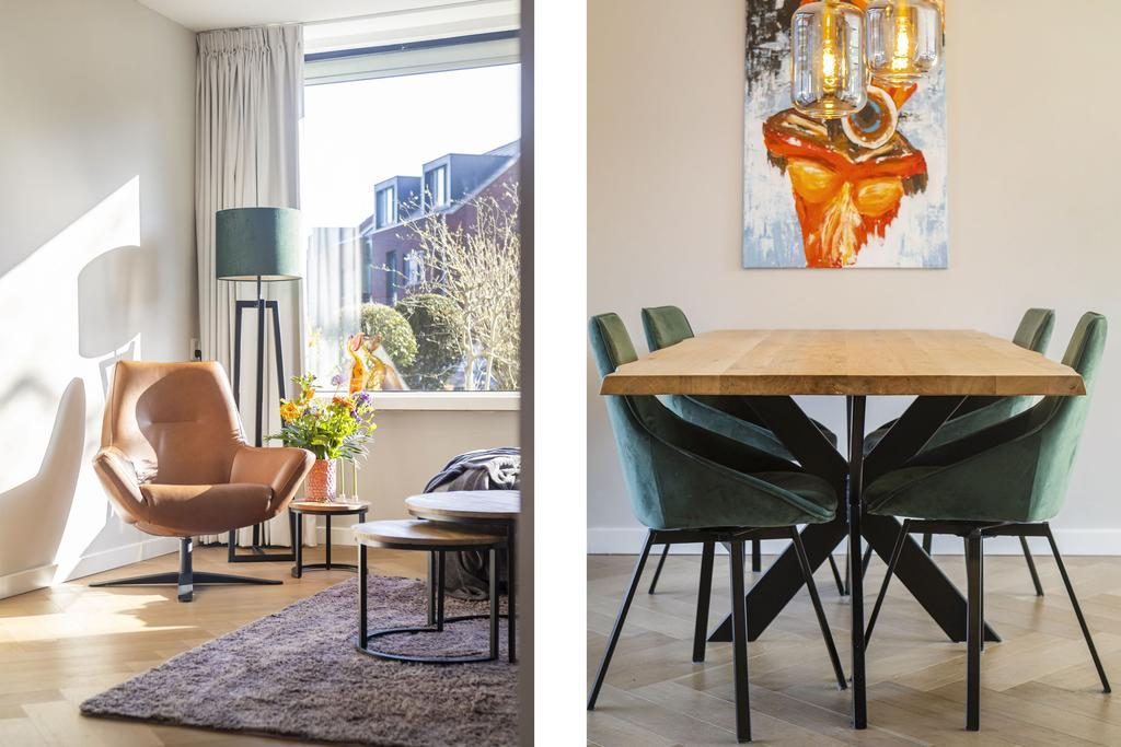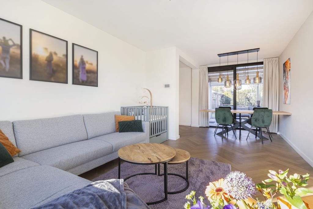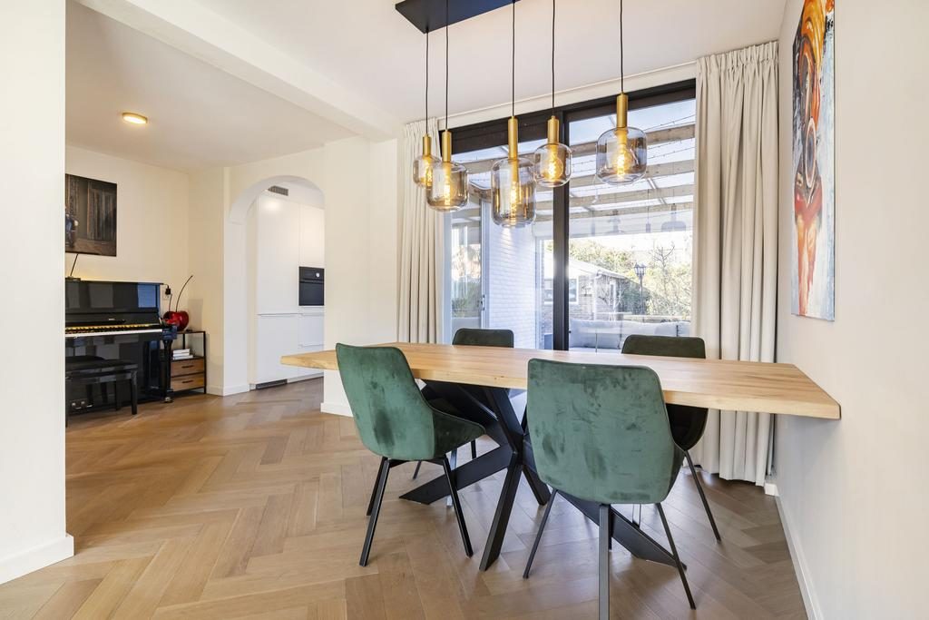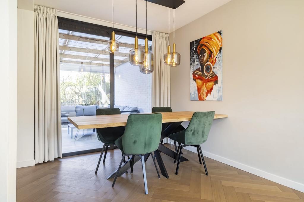 Grenzend aan de woonkamer bevindt zich de eethoek waarbij er leuk zicht is op de tuin door middel van de royale schuifpui. In de zomermaanden is er hierdoor een fijne verbinding tussen binnen en buiten.