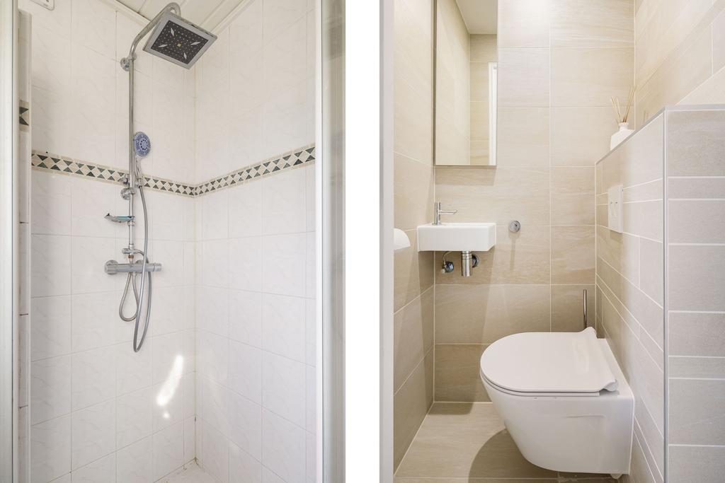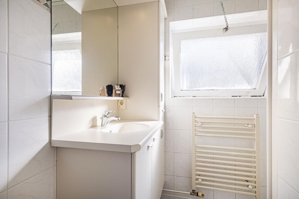 De badkamer is volledig betegeld en beschikt over een raam voor ventilatie en inval van daglicht. Daarnaast is de badkamer uitgerust met een wastafelmeubel, glazen douchecabine met thermostaatkraan en designradiator.