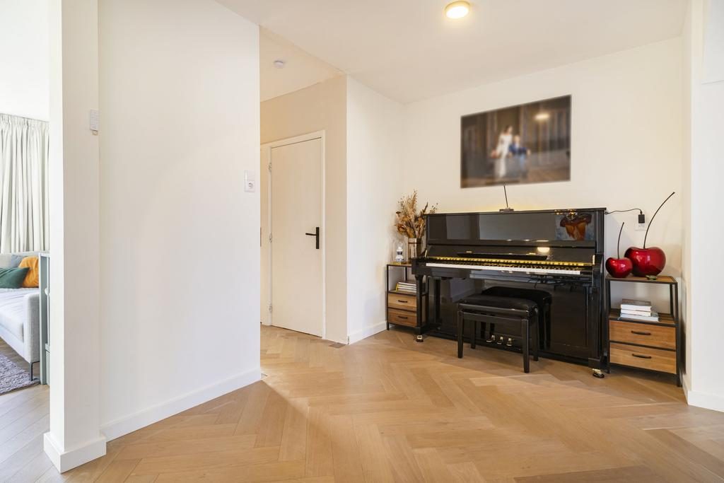 Tevens is er op de begane grond een werkhoek gecreëerd zodat er voor thuiswerken of musiceren een goede mogelijkheid is. De begane grond vloer is afgewerkt met een in visgraat gelegde eikenhouten vloer met comfortabele vloerverwarming.