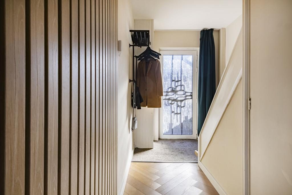 Via de entree kom je bij de hal met toegang tot de woon- en eetkamer, vernieuwd luxe toilet met hoekfonteintje, een praktische trapkast, de vernieuwde meterkast en de trapopgang naar de eerste verdieping.