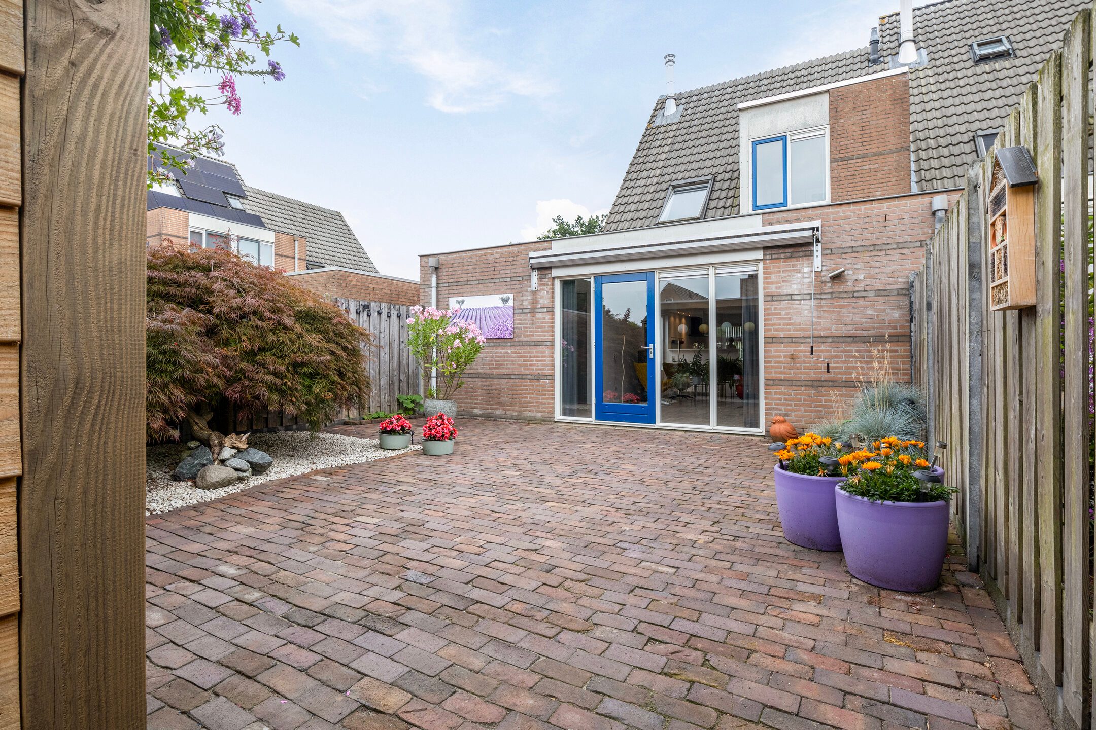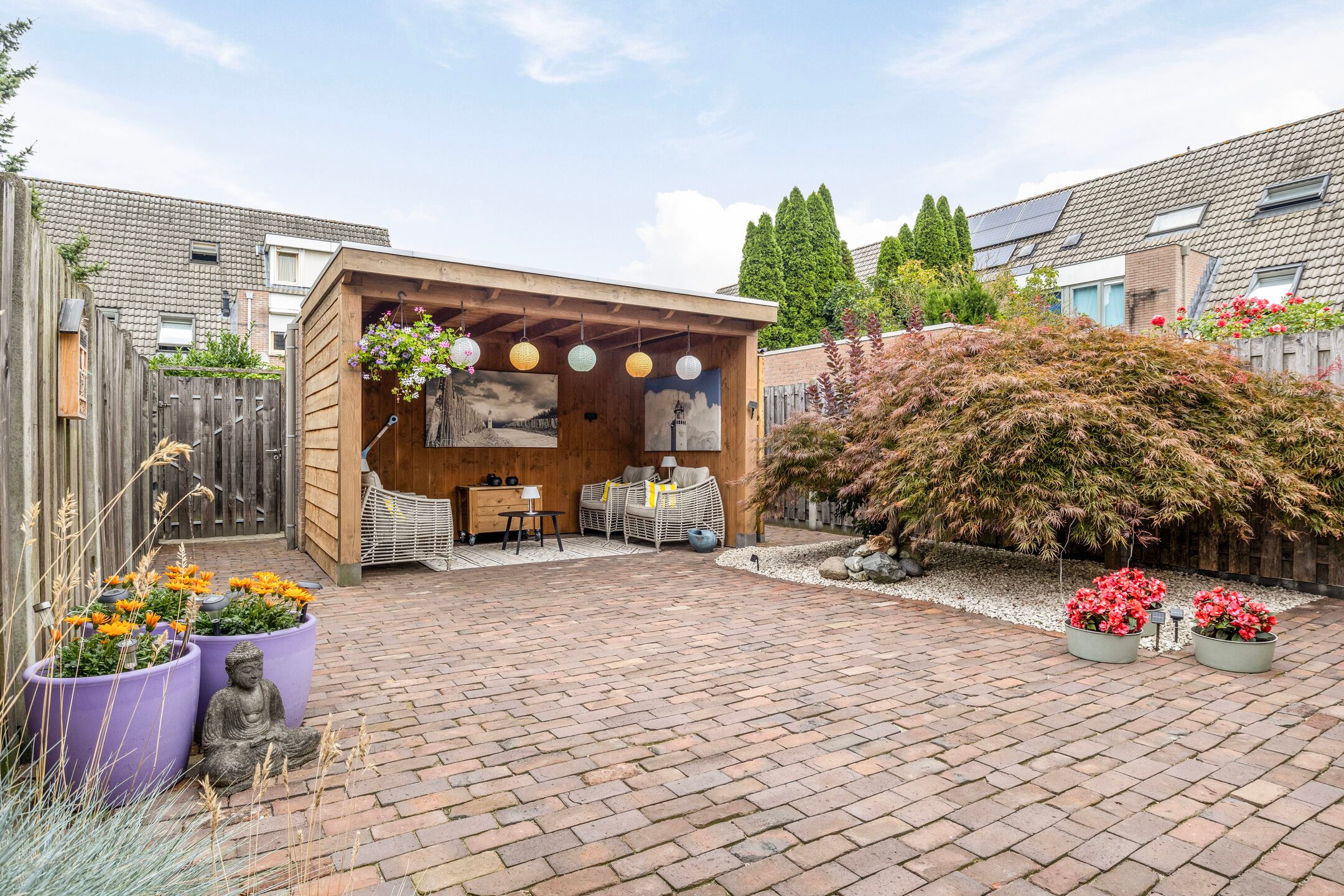 Vanuit de woonkamer stap je direct de prachtige tuin in, een oase van rust en verzorging. De tuin is grotendeels bestraat, wat zorgt voor een onderhoudsvriendelijke en nette uitstraling. Achterin de tuin bevindt zich een sfeervolle veranda, waar je heerlijk beschut kunt zitten en genieten van de buitenlucht, ongeacht het weer. Deze veranda biedt de perfecte plek voor ontspanning, of je nu met een goed boek wilt relaxen of gezellig wilt dineren met vrienden en familie.