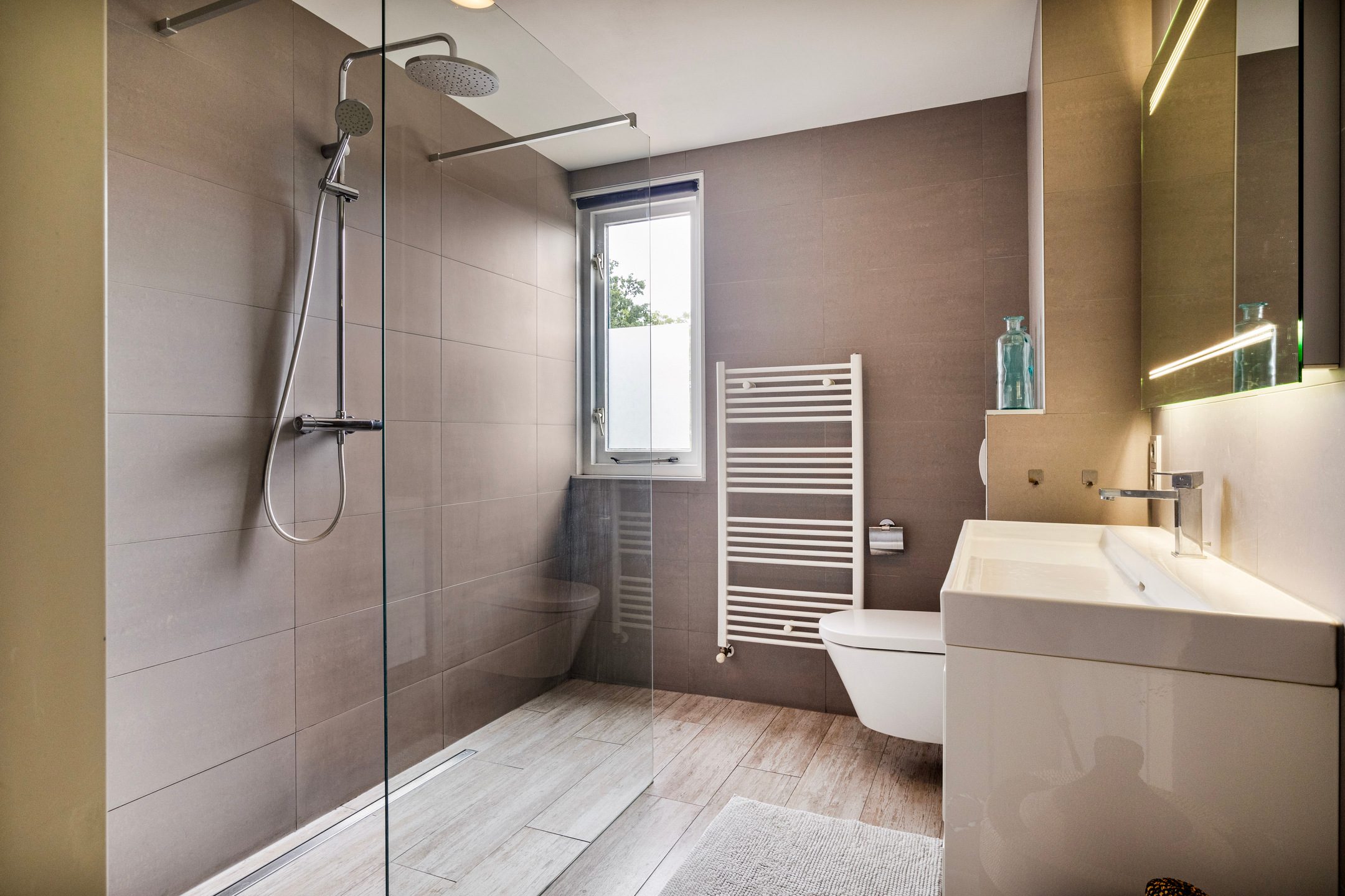 De moderne badkamer, volledig betegeld in eigentijdse stijl, is een oase van comfort en luxe. Hier vind je een ruime inloopdouche met glas wand, die een gevoel van ruimte en openheid creëert. Daarnaast beschikt de badkamer over een toilet en een wastafel met een verlichte spiegel, die zorgt voor de perfecte verlichting tijdens je dagelijkse routine. Een designradiator maakt de badkamer compleet, niet alleen door zijn strakke uitstraling, maar ook door zijn functionaliteit, zodat handdoeken altijd warm en droog zijn. Deze badkamer biedt alles wat je nodig hebt voor een verfrissende start van de dag of een ontspannen avondritueel.