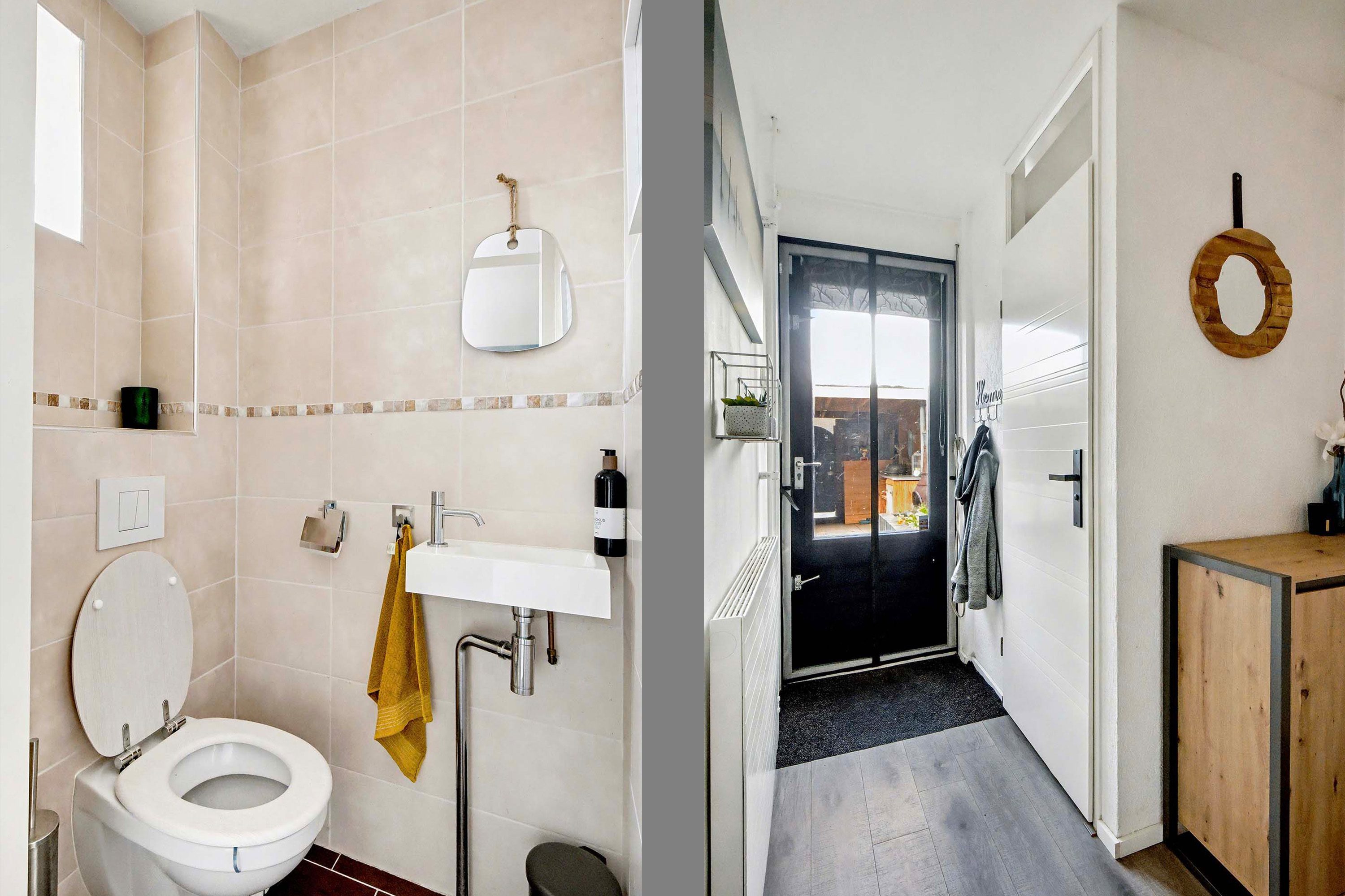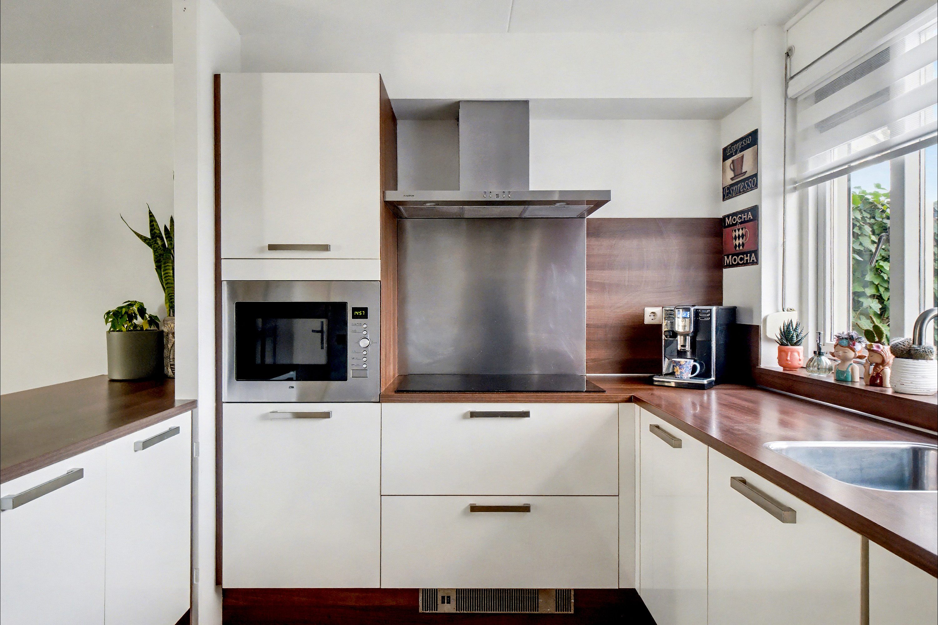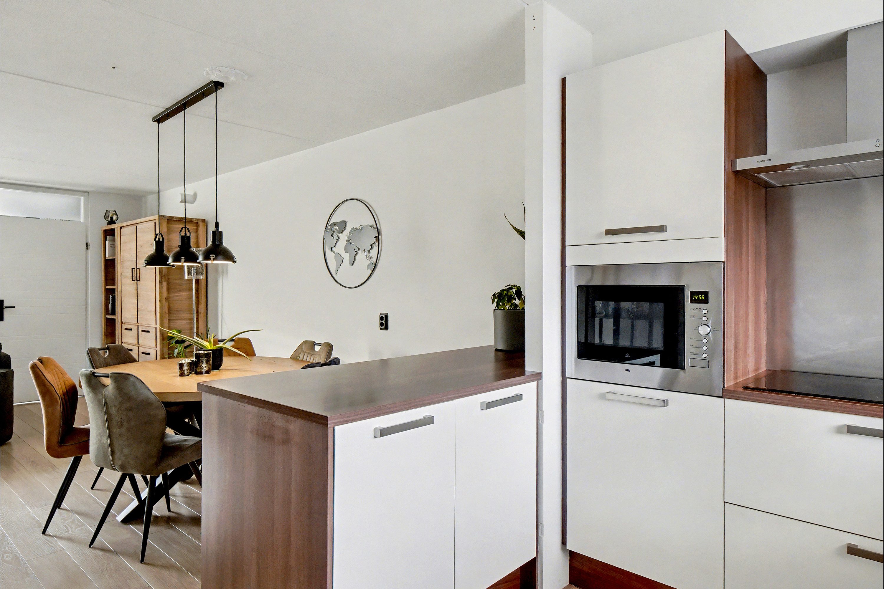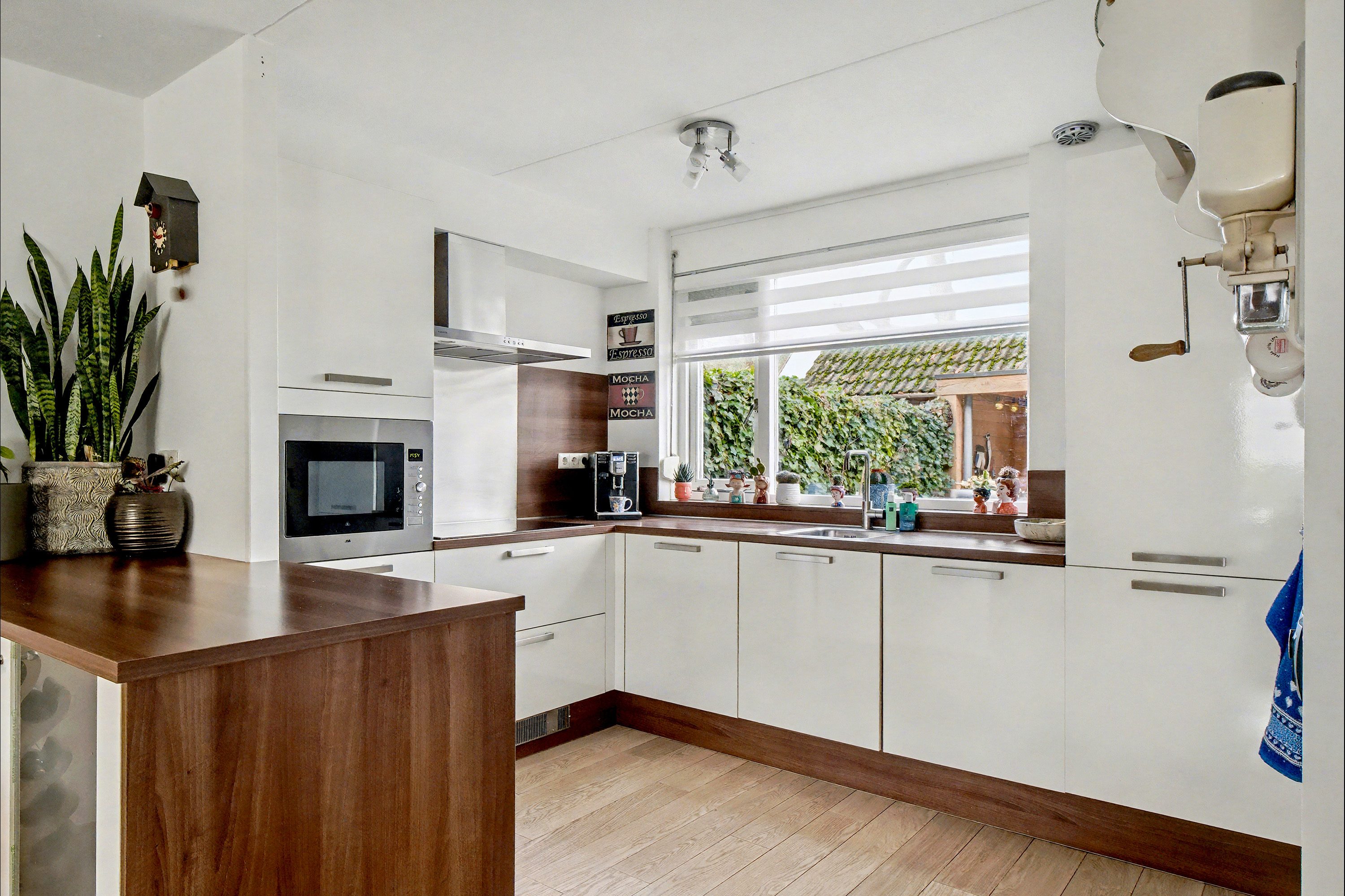 De halfopen keuken is uitgerust met een luxe inbouwkeuken met witte kastfronten en een werkblad in houtlook, en beschikt over diverse inbouwapparatuur: een kookplaat, afzuigkap, combi-oven, koel-vriescombinatie en vaatwasser. Het te openen raam zorgt voor extra ventilatie. Vanuit de keuken heb je toegang tot een hal van 3,7 m² met het toilet en de vaste trap naar de eerste verdieping.