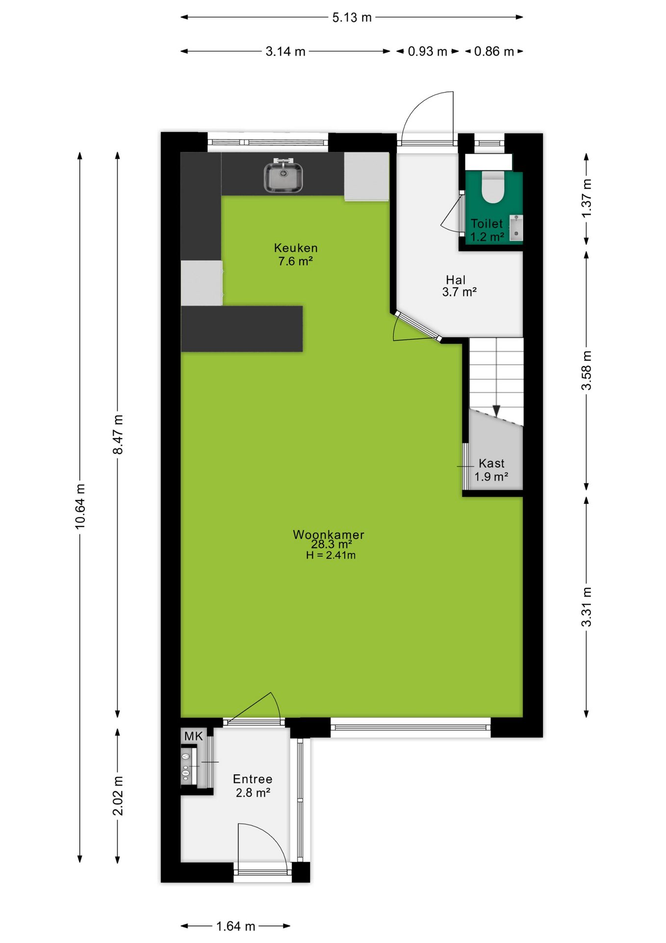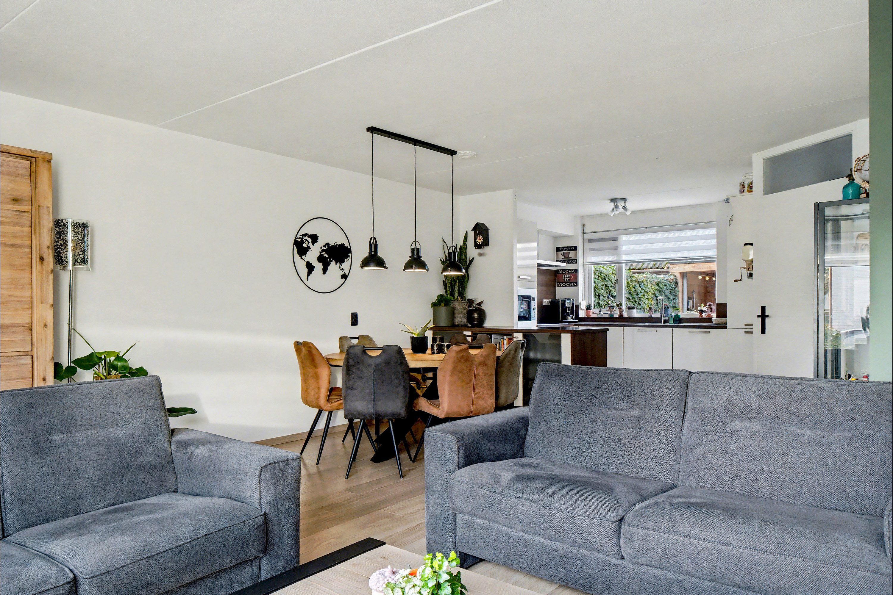 Via de entree, met portaal voor de garderobe en waar ook de meterkast is gesitueerd, betreed je de ruime woonkamer van 28,3 m². Deze leefruimte biedt voldoende plek voor zowel een grote hoekbank als een knusse zithoek. Dankzij het grote raam aan de voorzijde valt er veel natuurlijk licht naar binnen. Centraal in de woonkamer ligt het eetgedeelte, ruim genoeg voor een royale eettafel.